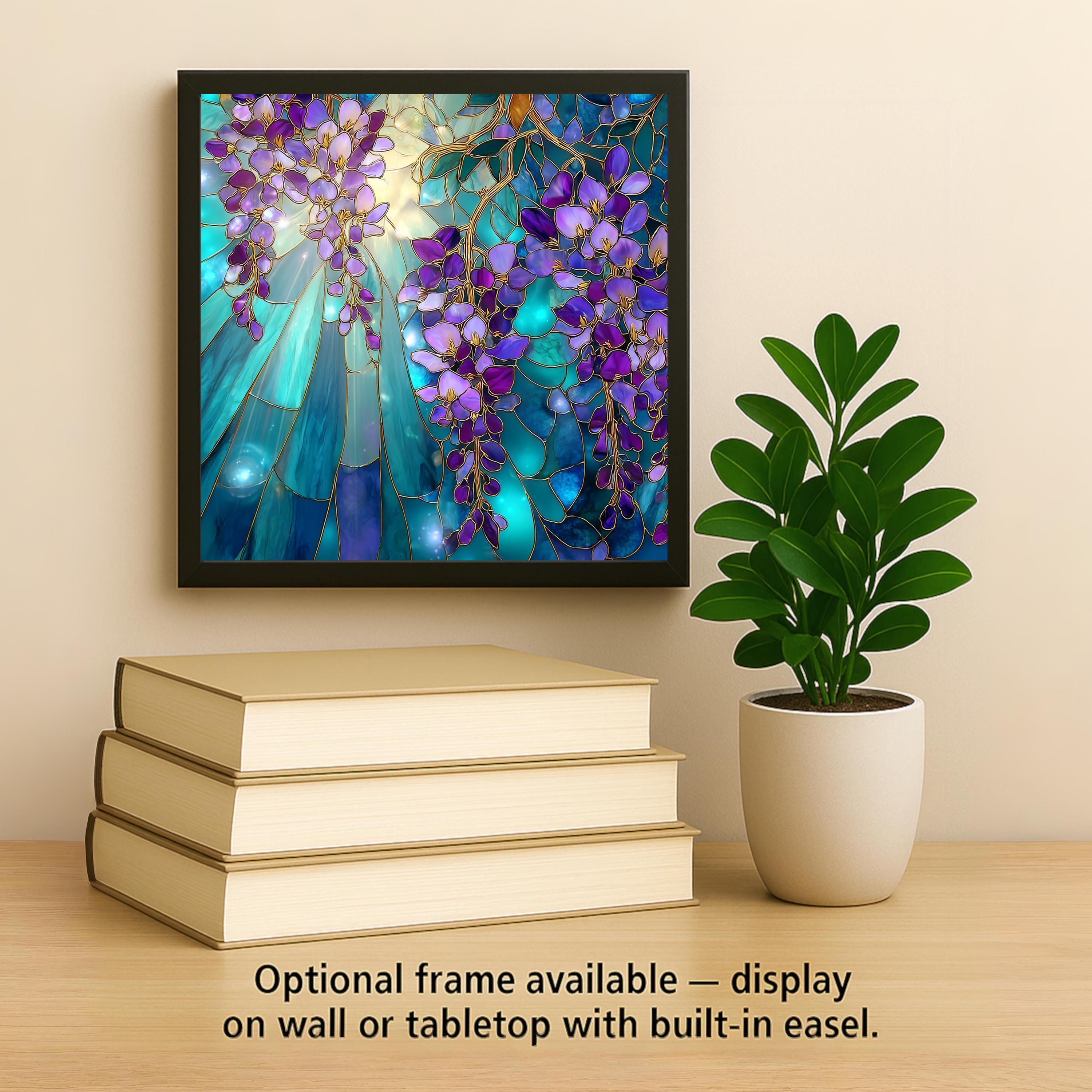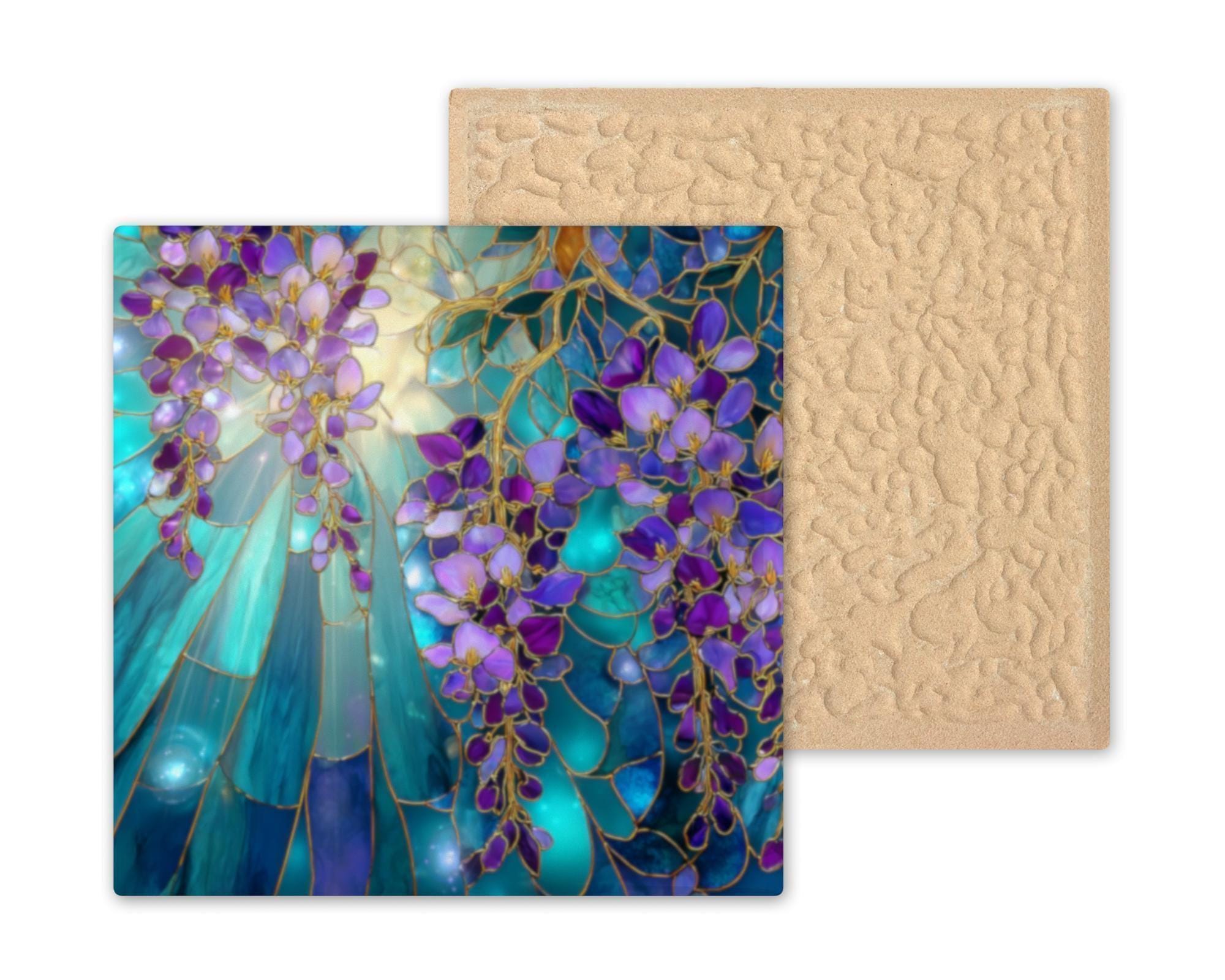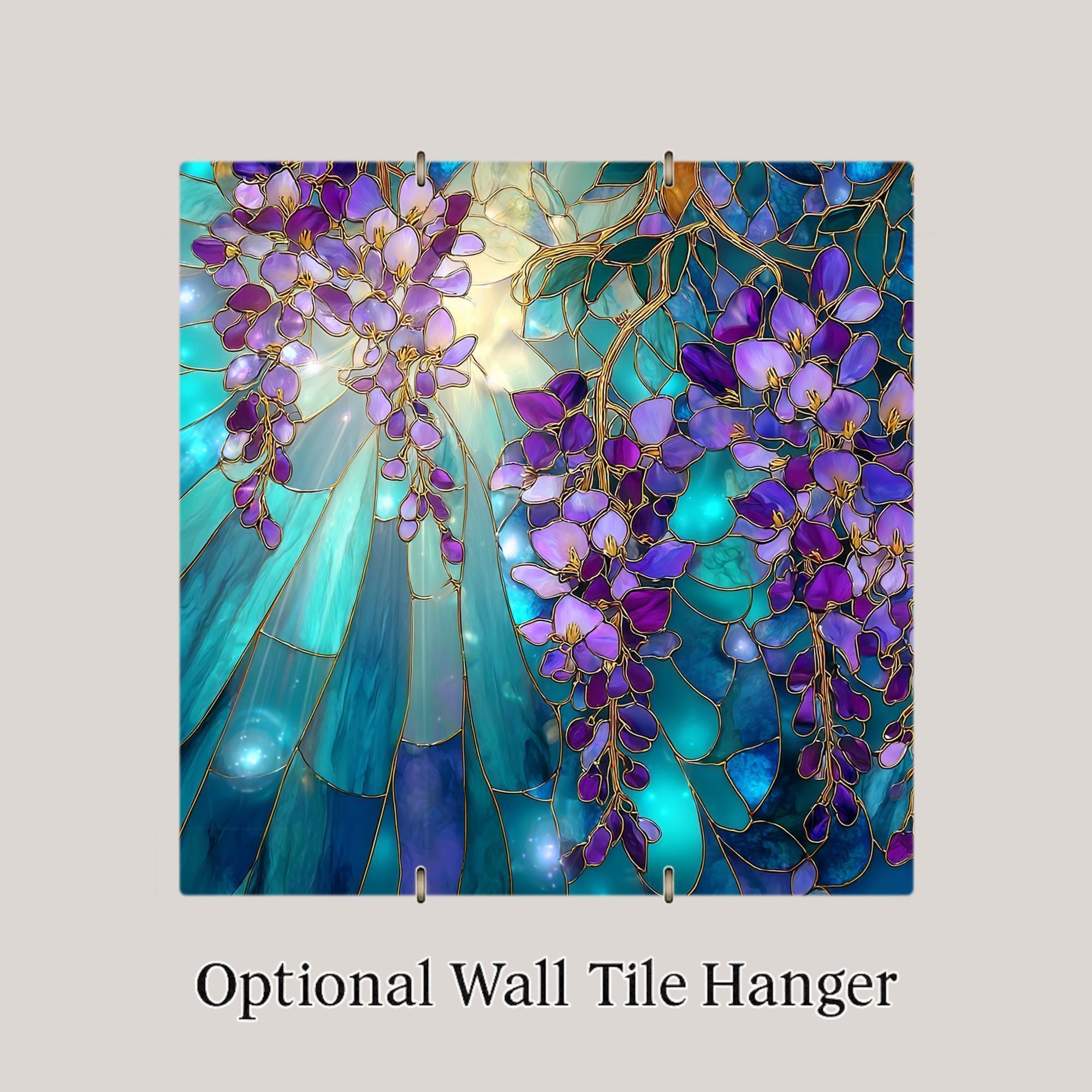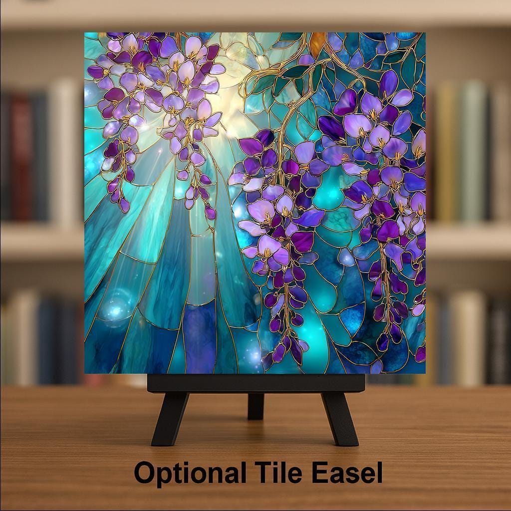 Celebrate the elegance of spring with this Stained Glass-Style Wisteria Tile, featuring cascading blossoms in purples and violets set against a teal and sapphire background. The soft golden glow behind the flowers adds a radiant touch, making this tile feel like a window to a magical garden. Though it appears hand-crafted in stained glass, it’s a high-resolution, permanent print on ceramic tile for long-lasting color and durability.