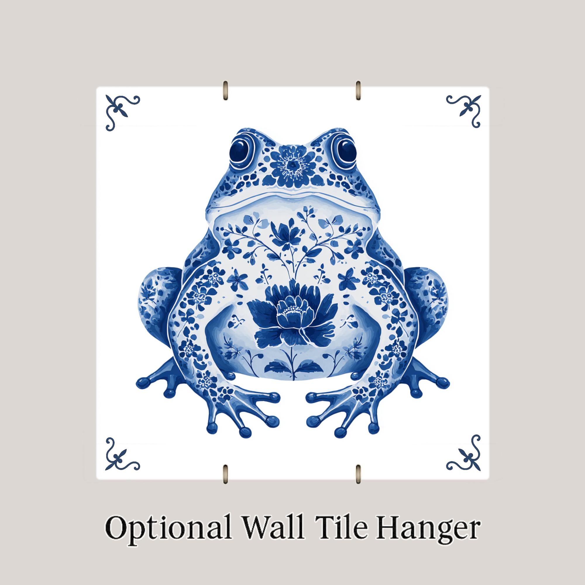 This Whimsical Delft Frog Tile combines classic Dutch design with quirky charm. The hand-painted look is actually a permanently printed design on ceramic tile, ensuring the look of antique Delftware without the fragility. The frog's body is filled with intricate blue florals, framed by decorative corner flourishes for a balanced and elegant presentation.