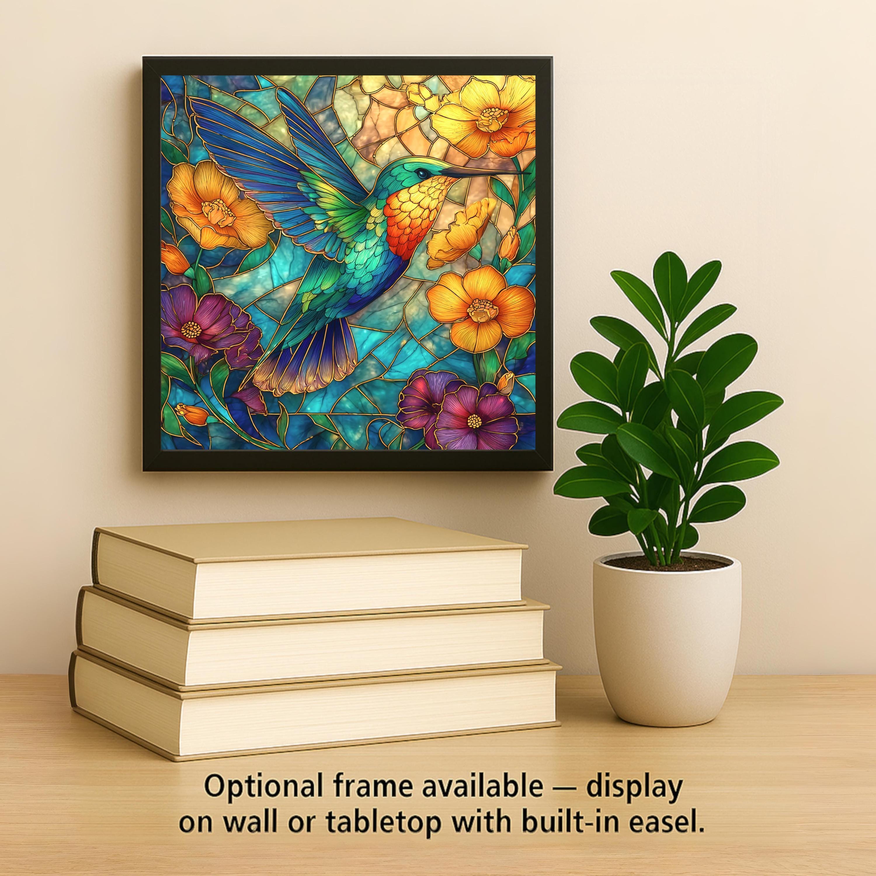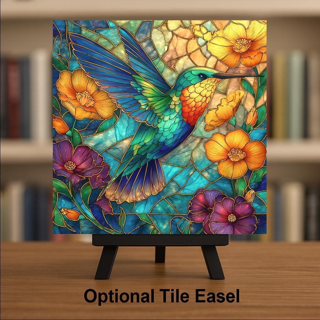 This Hummingbird Ceramic Tile Art brings together vibrant design and natural beauty in a stained glass-style print that’s both bold and graceful. A luminous hummingbird hovers in midair, its wings spread wide among golden poppies and deep indigo florals. The background glows with teal and amber tones, evoking sunshine filtering through garden vines. It’s an uplifting piece of wall decor for anyone who loves birds, color, and floral art.