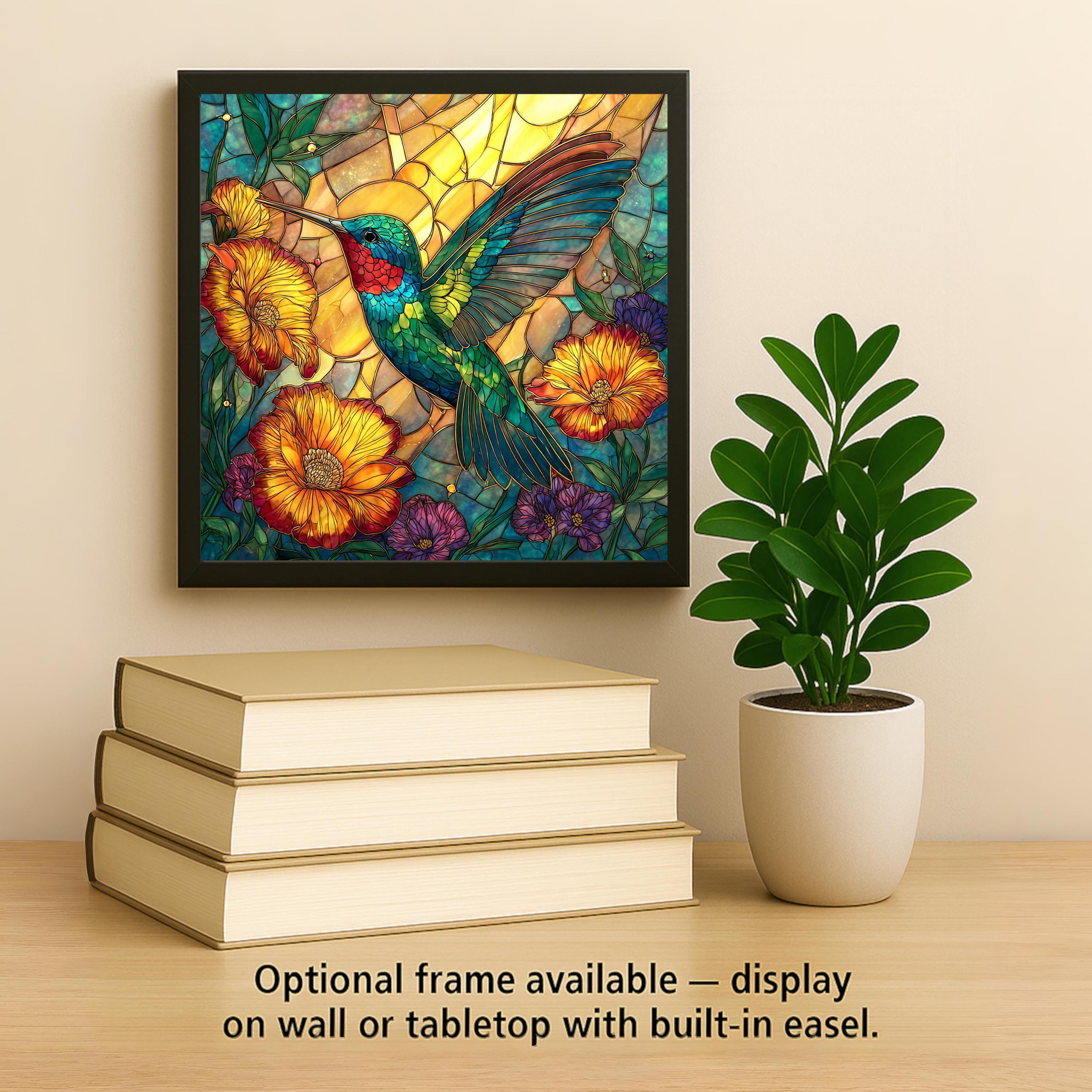 Brighten your space with this luminous Hummingbird Ceramic Tile Art, styled to look like glowing stained glass. A brilliant hummingbird in flight flutters near radiant golden blooms, its iridescent plumage capturing the sun’s warmth in shades of turquoise, ruby, and emerald. The background glows with amber and jewel tones, creating a dynamic and uplifting piece of art that feels alive with light.