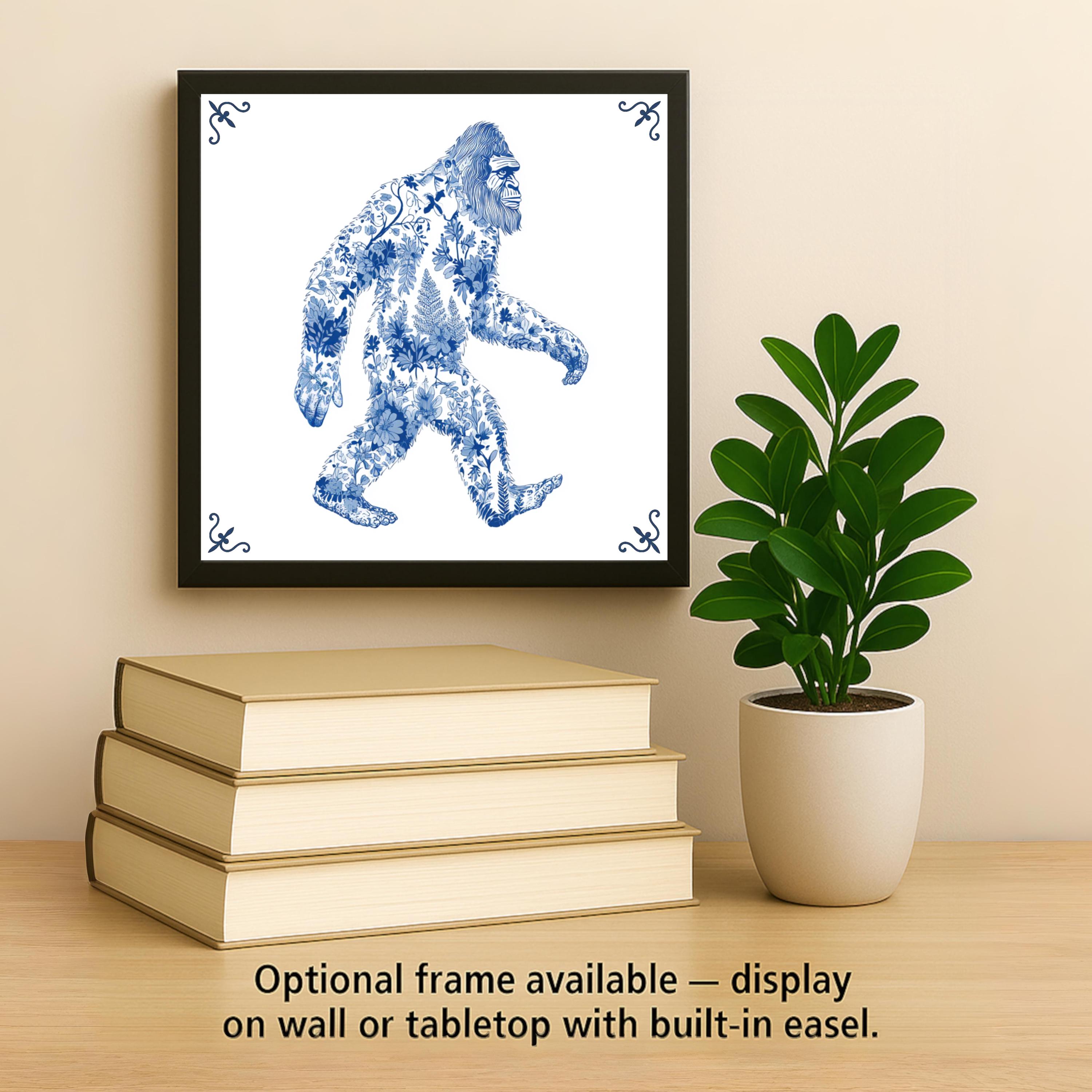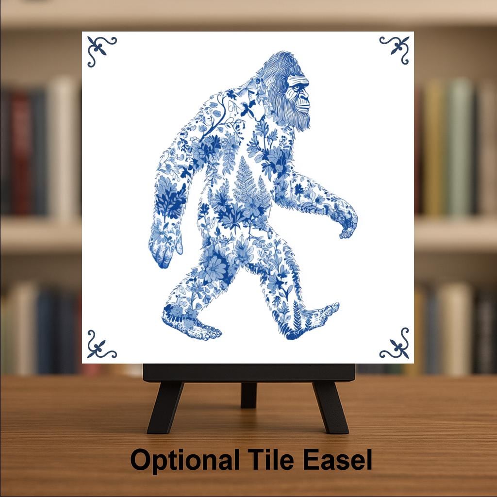 This Blue Delft Sasquatch Ceramic Tile Art puts a folkloric spin on traditional Dutch tile design. A bold Sasquatch silhouette walks across the surface, filled with delicate blue floral patterns inspired by classic Delftware. The clean white background, elegant corner flourishes, and detailed botanical linework create a striking balance of tradition and humor.