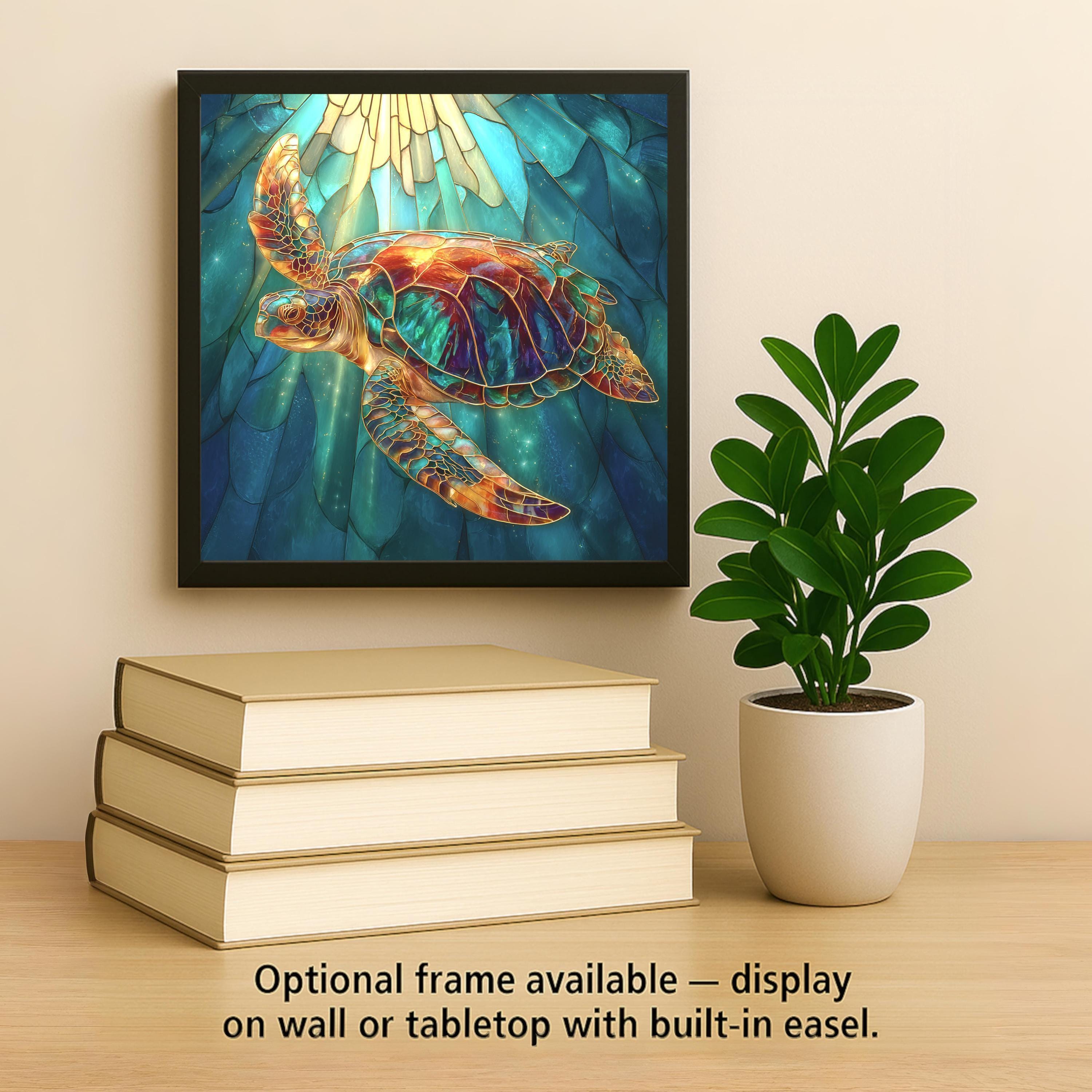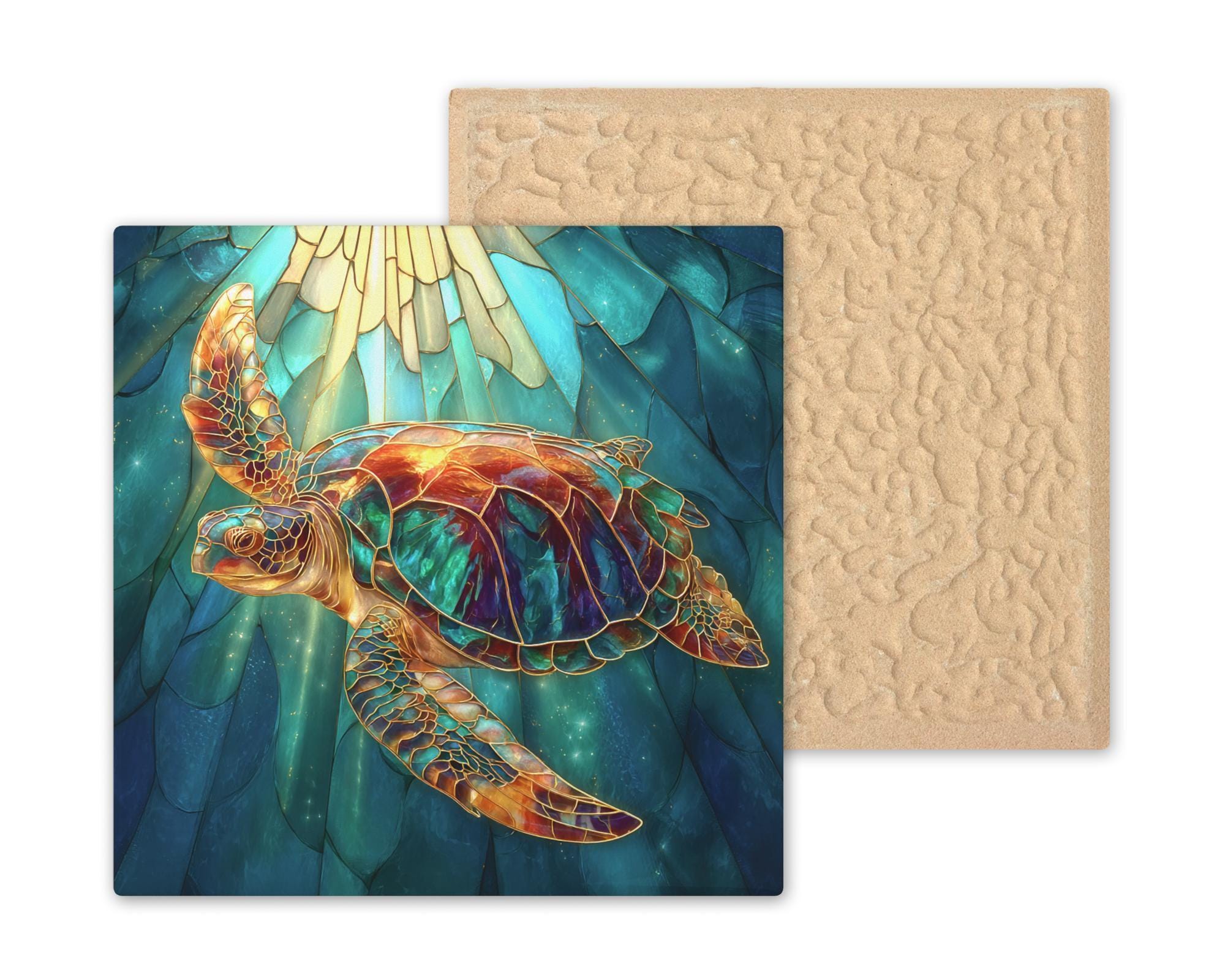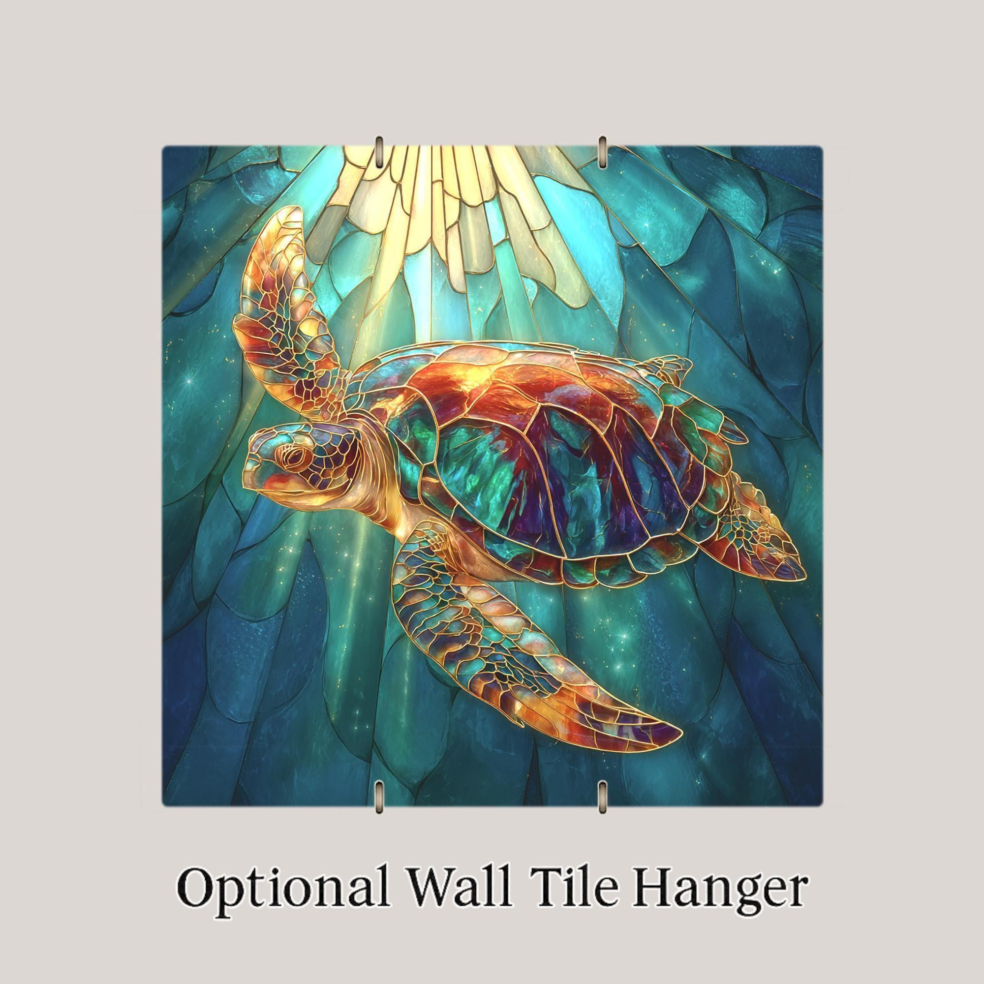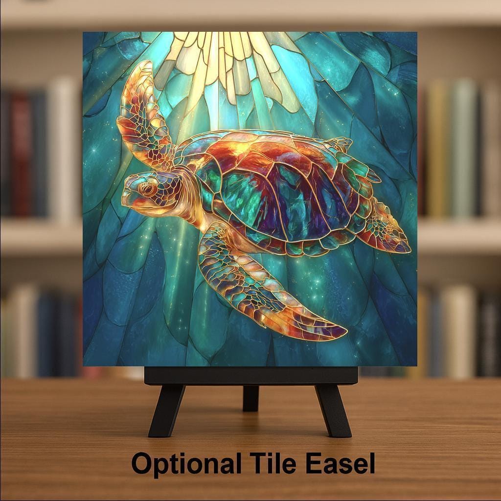 This stunning Sea Turtle Ceramic Tile Art showcases a vibrant sea turtle illuminated by sunlight streaming through stained glass waves. Designed with ocean lovers in mind, the tile features rich aquatic tones—peacock blue, glowing aqua, and marbled teal—accented with warm golden lines that trace every curve of the turtle’s shell and flippers. The background creates the illusion of cascading light, adding depth and serenity to any space. It’s perfect as wall art in beach houses, bathrooms, entryways, or kitchens needing a burst of color and marine charm. This tile makes a thoughtful gift for turtle lovers, coastal décor collectors, or anyone who finds peace in the sea. Each tile is durable, high-resolution printed, and finished to preserve its radiant color for years to come. Add a tile wall hanger, easel tile stand, or cork backing for easy and beautiful display. Celebrate sea life with a one-of-a-kind artisan design.