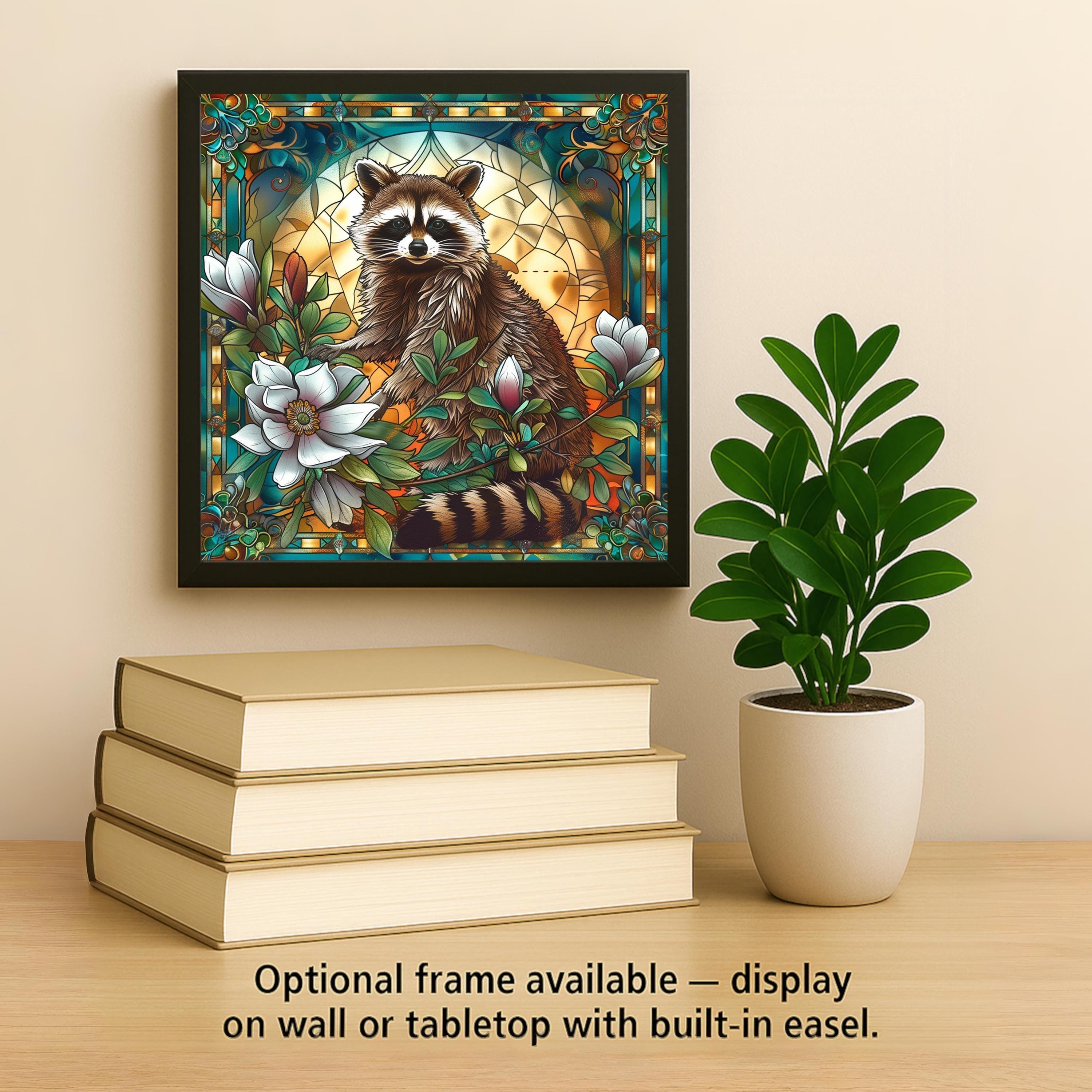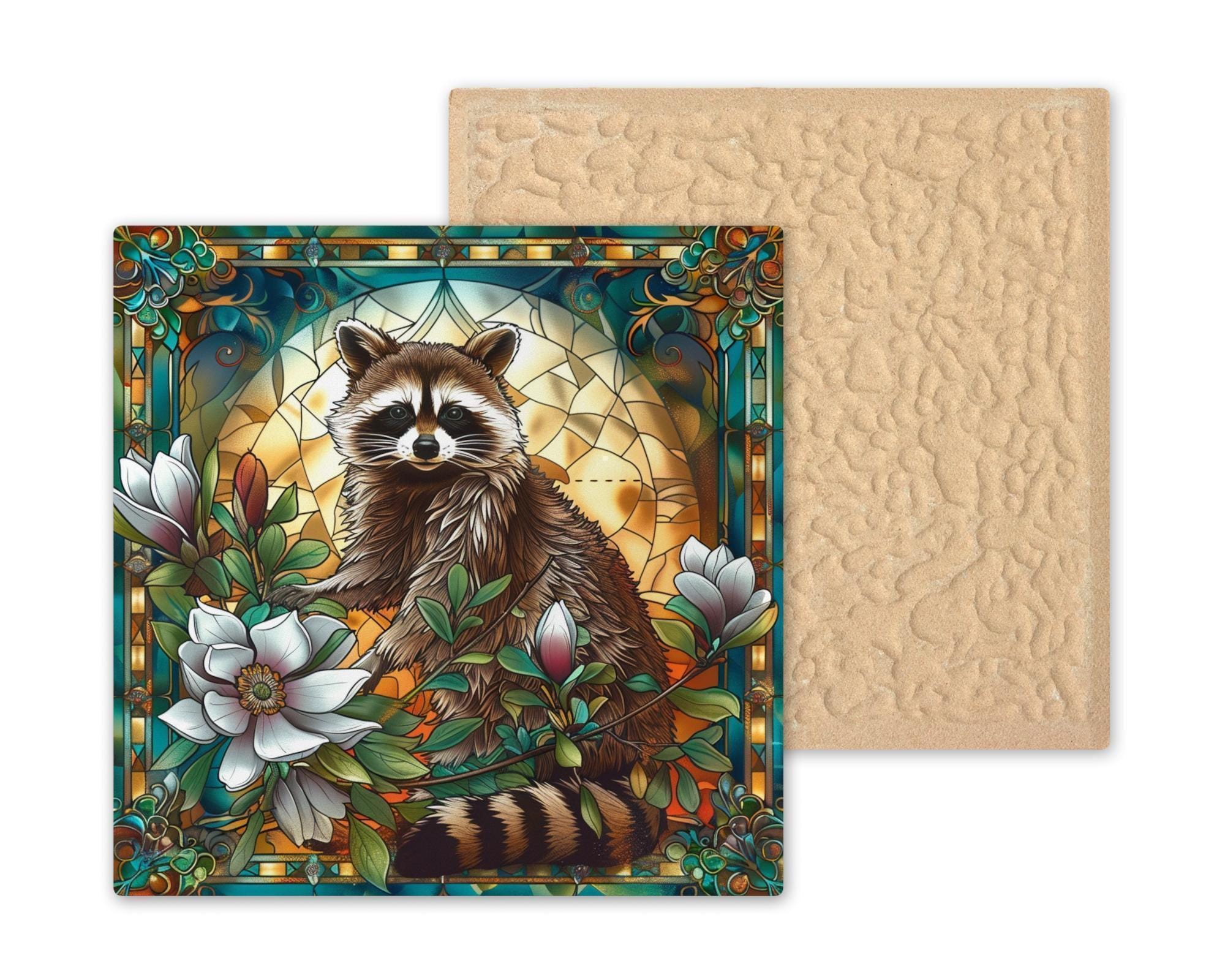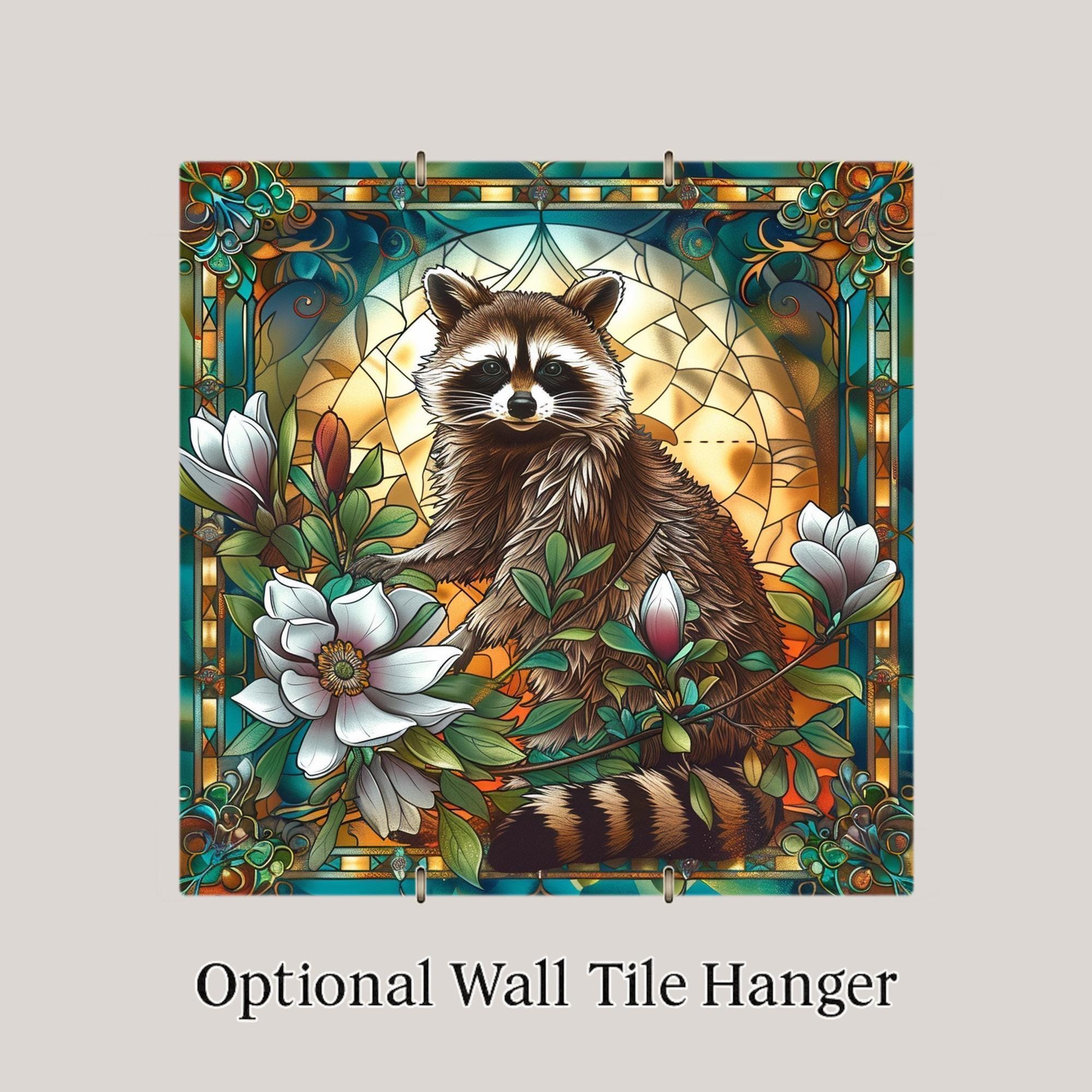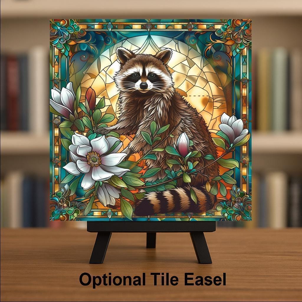 Decorate your space with this adorable raccoon ceramic tile art. The design shows a sweet raccoon sitting among blooming magnolia flowers. The stained glass style makes the piece look bright and lively. This tile is great for anyone who loves animals or garden-inspired art. The colors are rich and warm, adding a happy feel to your home. Every time you see it, you’ll feel a little closer to nature. Even though it looks like real stained glass, it is actually a high-quality permanent print on a ceramic tile. This makes it strong and easy to care for. Hang it on your wall or place it on a shelf to create a cozy woodland touch. It works well in living rooms, hallways, kitchens, or bedrooms. It is also a perfect gift for birthdays, holidays, or housewarming parties. This tile is special because it blends art and nature in a fun way. You can add a tile wall hanger, easel tile stand, or cork backing to make your display easier and more stylish. These options let you set it up exactly how you like. People who love raccoons, flowers, or unique art pieces will adore this design. It makes a great conversation starter and adds charm to any decor. Show your personality and love for woodland creatures with this fun and beautiful tile. Order one for yourself or as a thoughtful gift today. You’ll enjoy it for years to come!