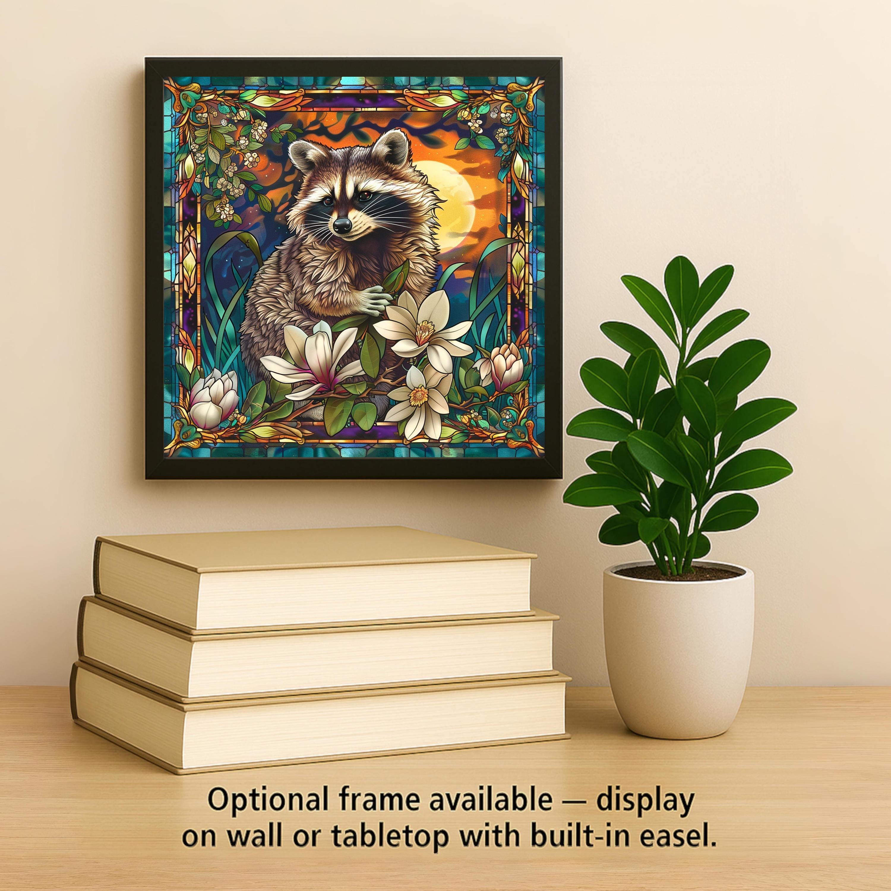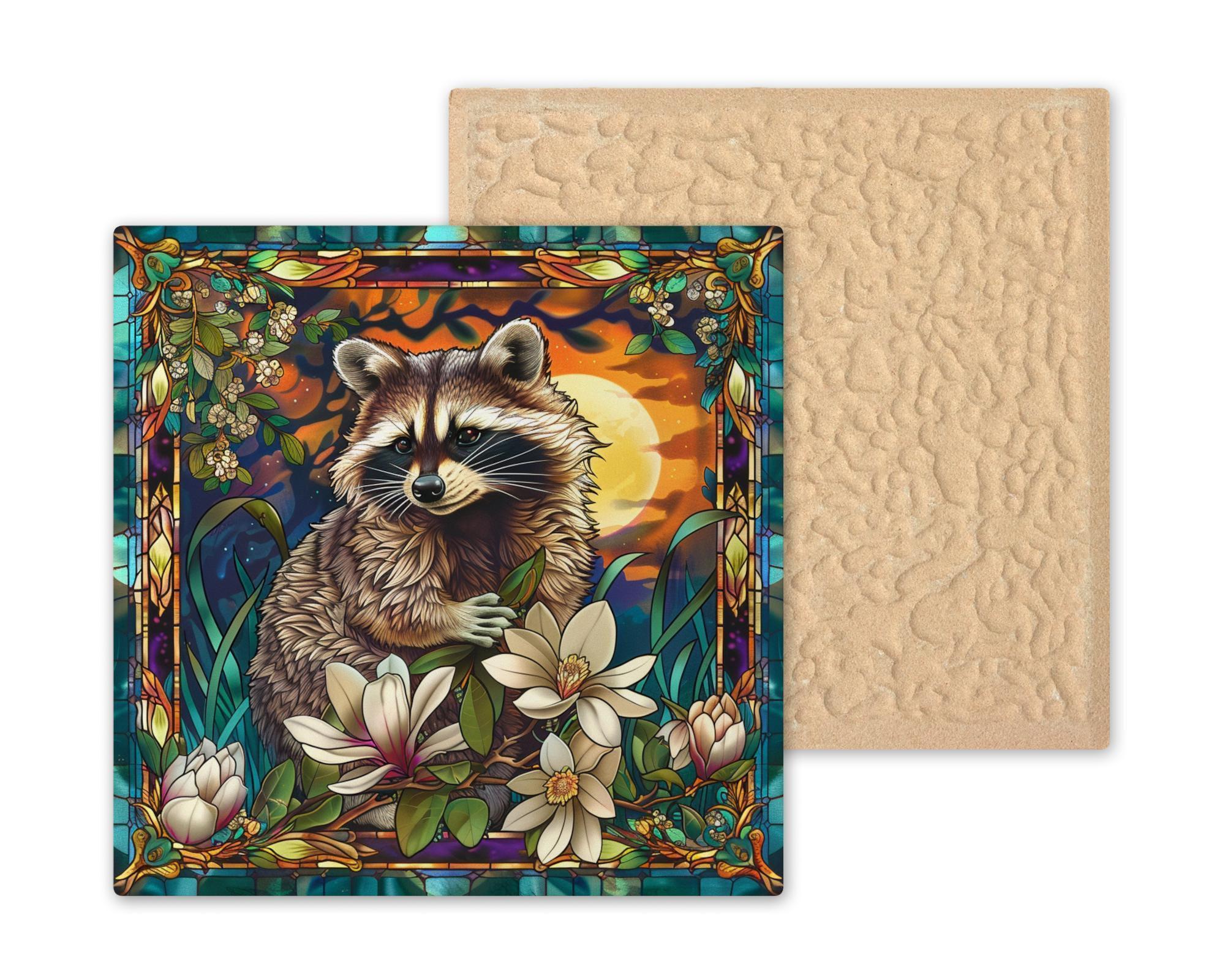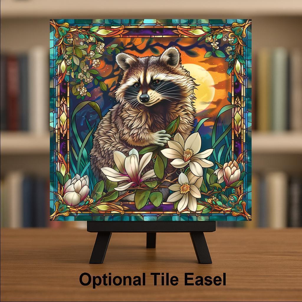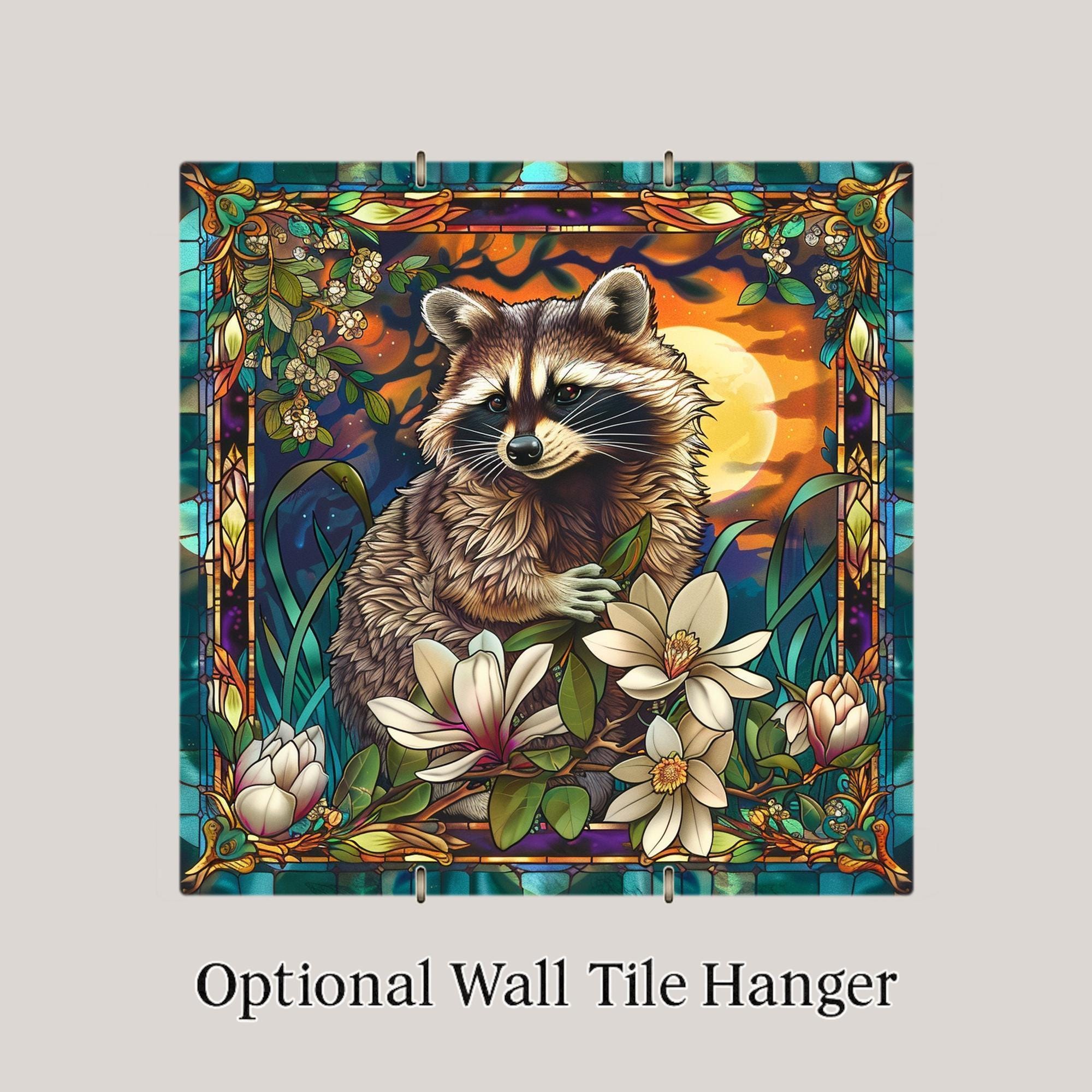 Add a fun and cozy woodland vibe to your space with this adorable raccoon ceramic tile art. The design showcases a raccoon framed by bright magnolia flowers, lush green leaves, and a glowing full moon. The stained glass style brings rich, colorful detail that stands out beautifully on any wall. This tile is perfect for people who love raccoons, flowers, or nature-inspired art. It works well in any room, like living rooms, kitchens, or even bedrooms. The mix of warm sunset tones and deep teals creates a cheerful and comforting feeling. Though it looks like stained glass, this is actually a permanent, high-quality print on a sturdy ceramic tile. It is easy to clean and will last for many years without losing its bright colors. You can hang it on the wall, place it on a shelf, or include it as part of a gallery wall. This art tile also makes a great gift for friends and family. It is a thoughtful choice for birthdays, holidays, or housewarming parties. You can add a tile wall hanger, easel tile stand, or cork backing to make displaying it easy and stylish. These optional add-ons help you set up your tile art exactly how you want it. Celebrate your love of nature and animals with this sweet raccoon tile. It’s a fun way to bring a bit of the forest into your home. Order yours today and enjoy a special piece that everyone will admire!