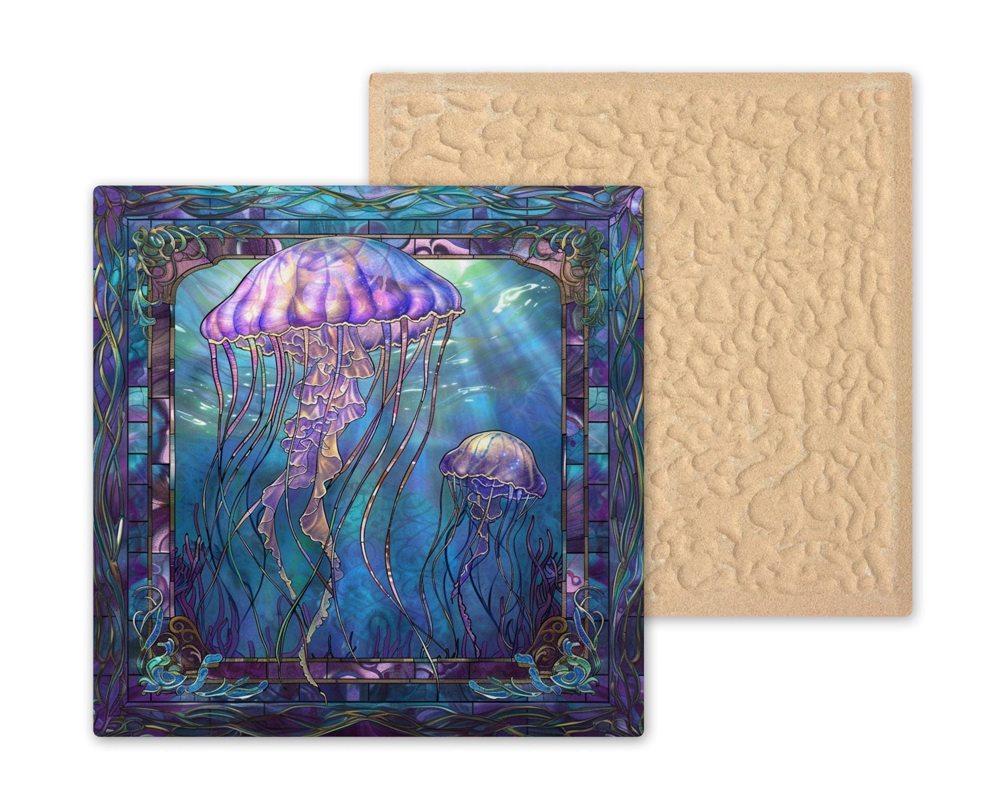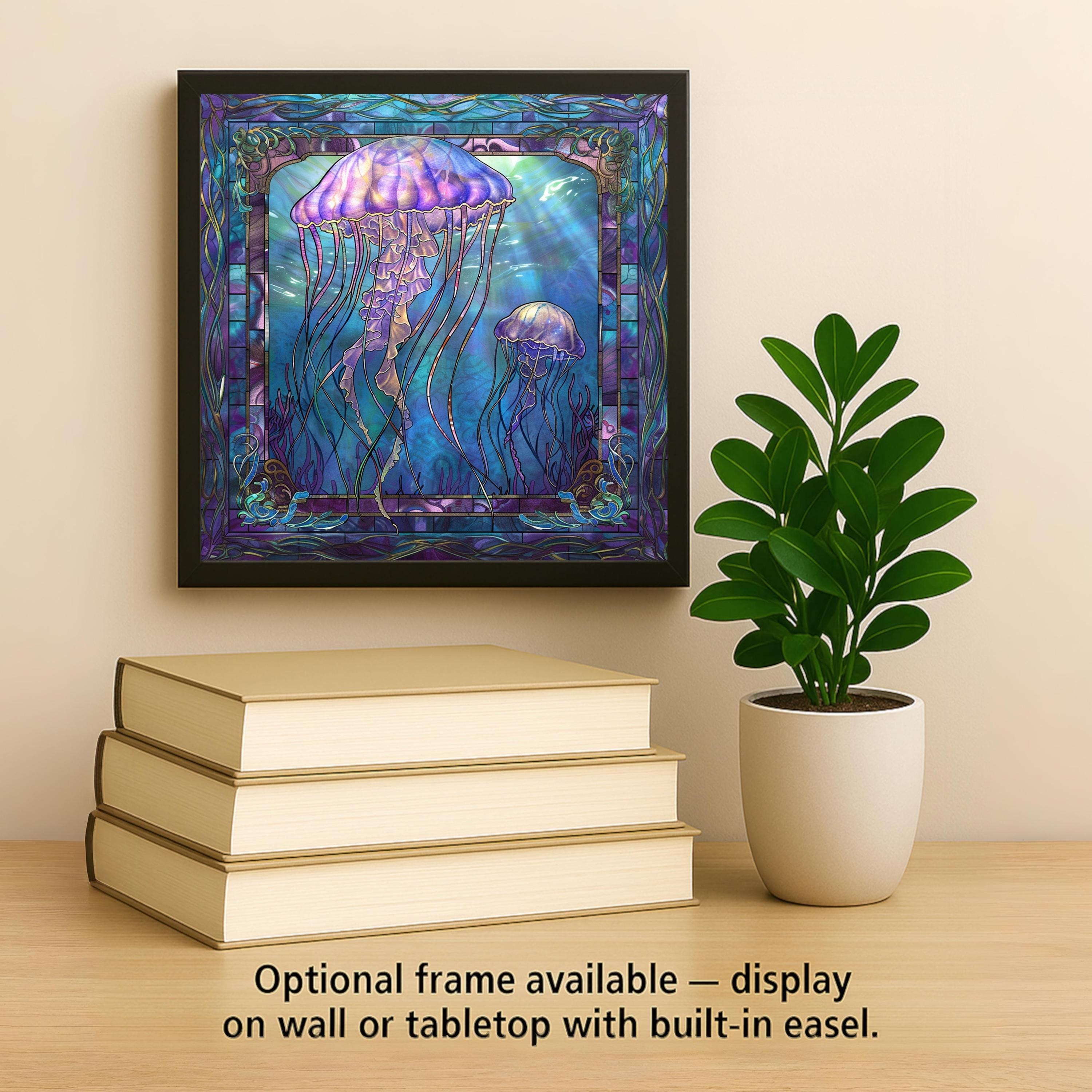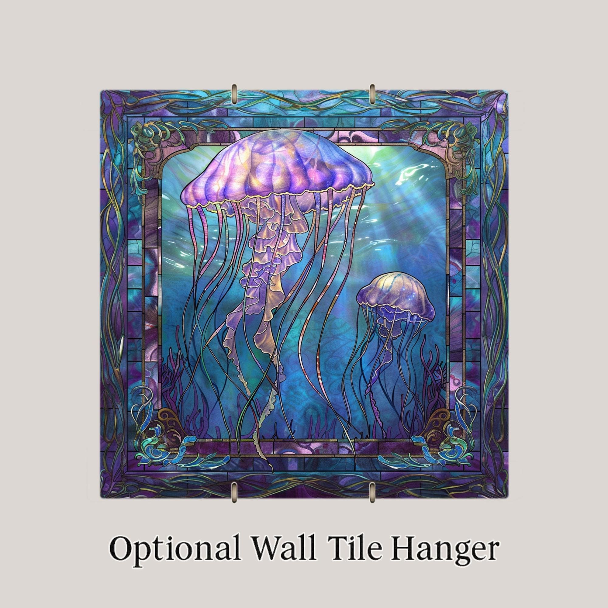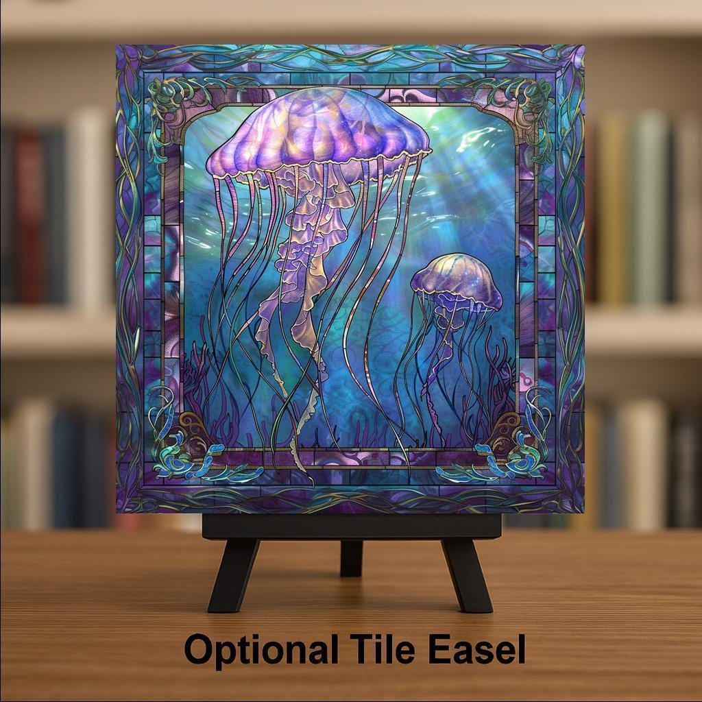 Add a touch of underwater wonder to your home with this gorgeous jellyfish ceramic tile art. The design shows two jellyfish floating gracefully through an ocean scene full of rich blue and purple tones. Inspired by stained glass, the design shines with light and life. This tile is perfect for ocean lovers, beach house owners, or anyone who loves marine decor. The gentle movement and flowing tentacles bring a calm and dreamy feeling to your space. Though it looks like stained glass, it is actually a permanent, high-quality print on a strong ceramic tile. This makes it durable and easy to keep clean for years of enjoyment. You can hang it on the wall, stand it on a shelf, or make it a centerpiece in a gallery wall collection. This piece also makes a beautiful and thoughtful gift for birthdays, holidays, or housewarming parties. Optional add-ons like a tile wall hanger, easel tile stand, or cork backing make it easy to display however you like. These accessories let you customize your space and show off your new art tile in the perfect way. This jellyfish tile is sure to catch everyone’s eye and spark conversations. It’s a special way to bring the mystery and magic of the ocean into your everyday life. Brighten your home with this unique art piece today. Order one now and let the ocean's gentle beauty wash over your space!