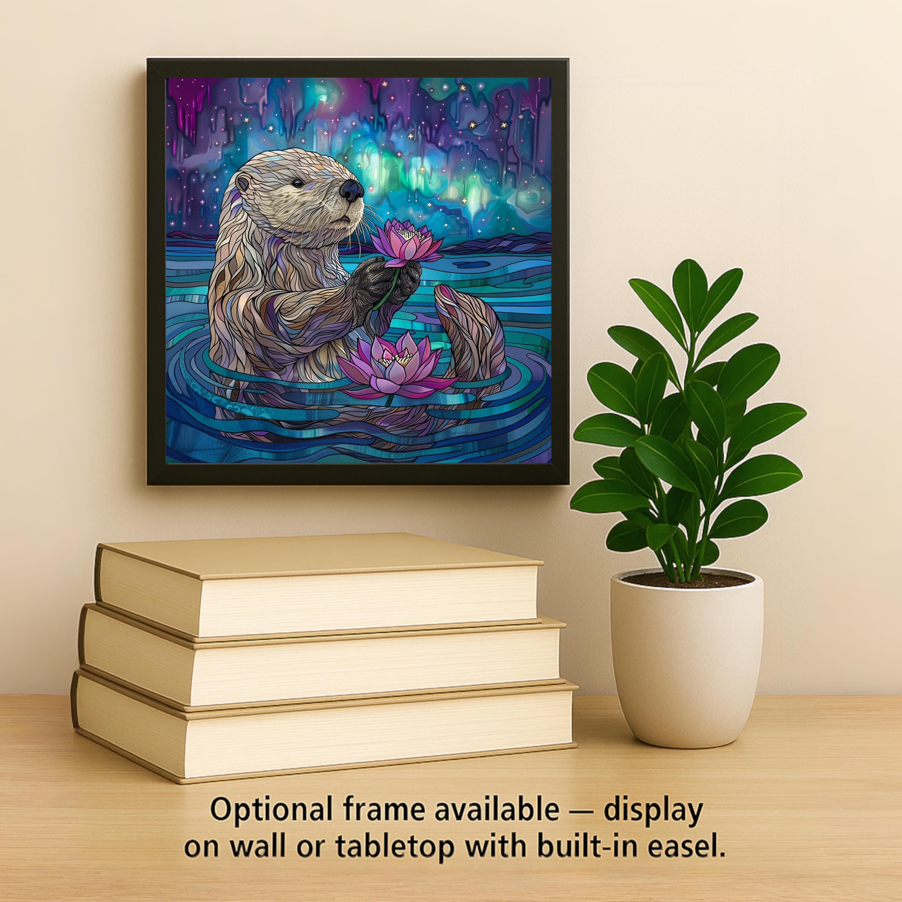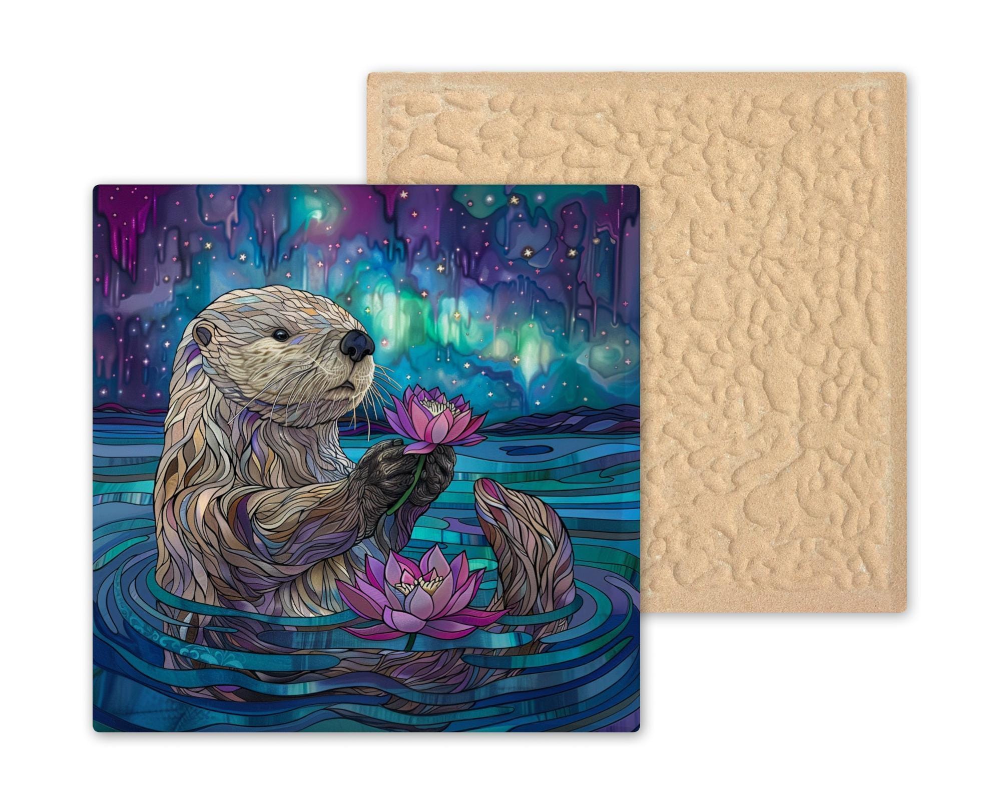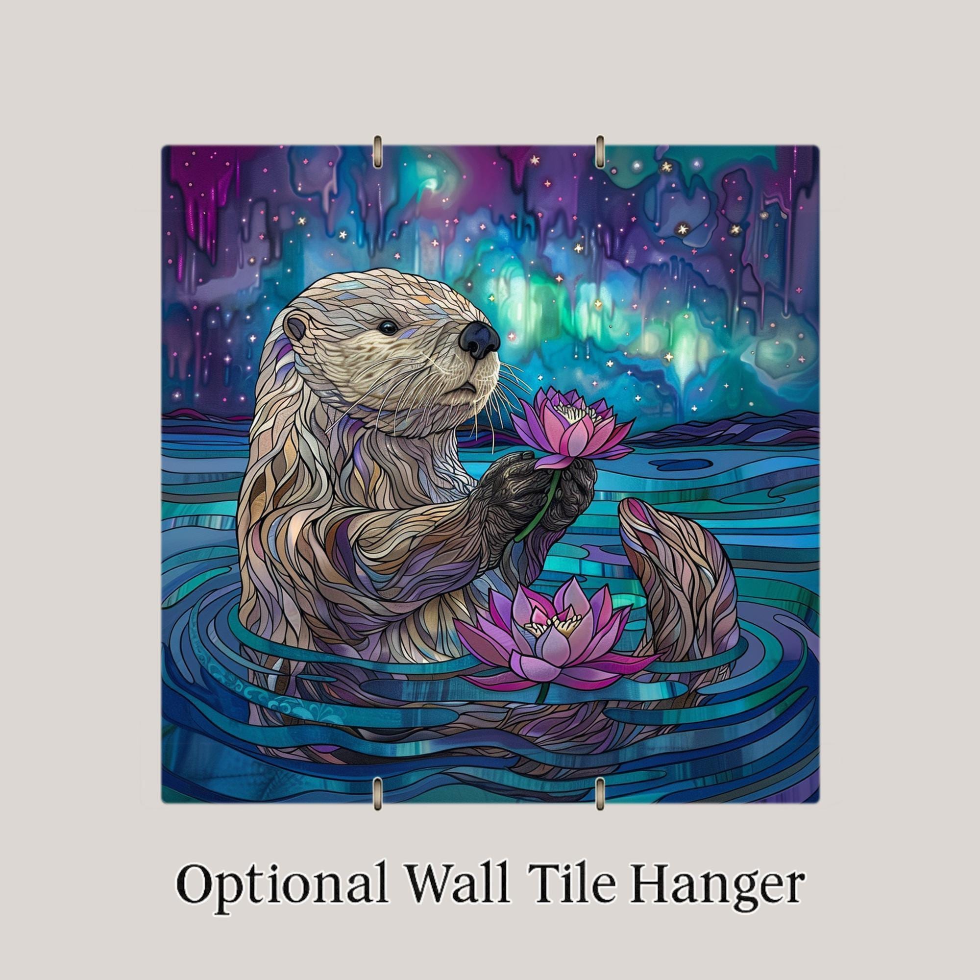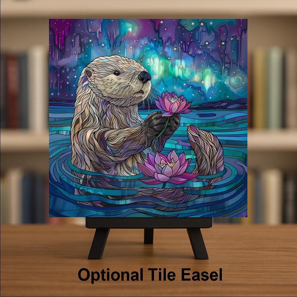 Add a whimsical touch of nature to your home with this charming otter ceramic tile art. The design shows a sweet otter floating peacefully while holding a pretty pink lotus flower. Behind it, the sky glows with stunning northern lights in dreamy purple, blue, and green shades. The stained glass style brings out the bright colors and soft light beautifully. This tile is perfect for anyone who loves otters, water scenes, or magical, calming art. The cute otter and glowing background make it feel peaceful and joyful. Though it looks like stained glass, it is actually a permanent, high-quality print on a sturdy ceramic tile. It is strong, easy to clean, and will stay colorful for years to come. You can hang it on the wall, set it on a shelf, or include it in a gallery wall for a fun and unique look. This tile also makes a wonderful gift for birthdays, housewarming parties, or holidays. You can choose optional add-ons like a tile wall hanger, easel tile stand, or cork backing to display it however you like. These options help you create the perfect look for your space. The otter tile art is sure to bring smiles and warm feelings to everyone who sees it. Celebrate your love of nature and animals with this adorable and magical tile. Order yours today and let this playful otter brighten your home!
