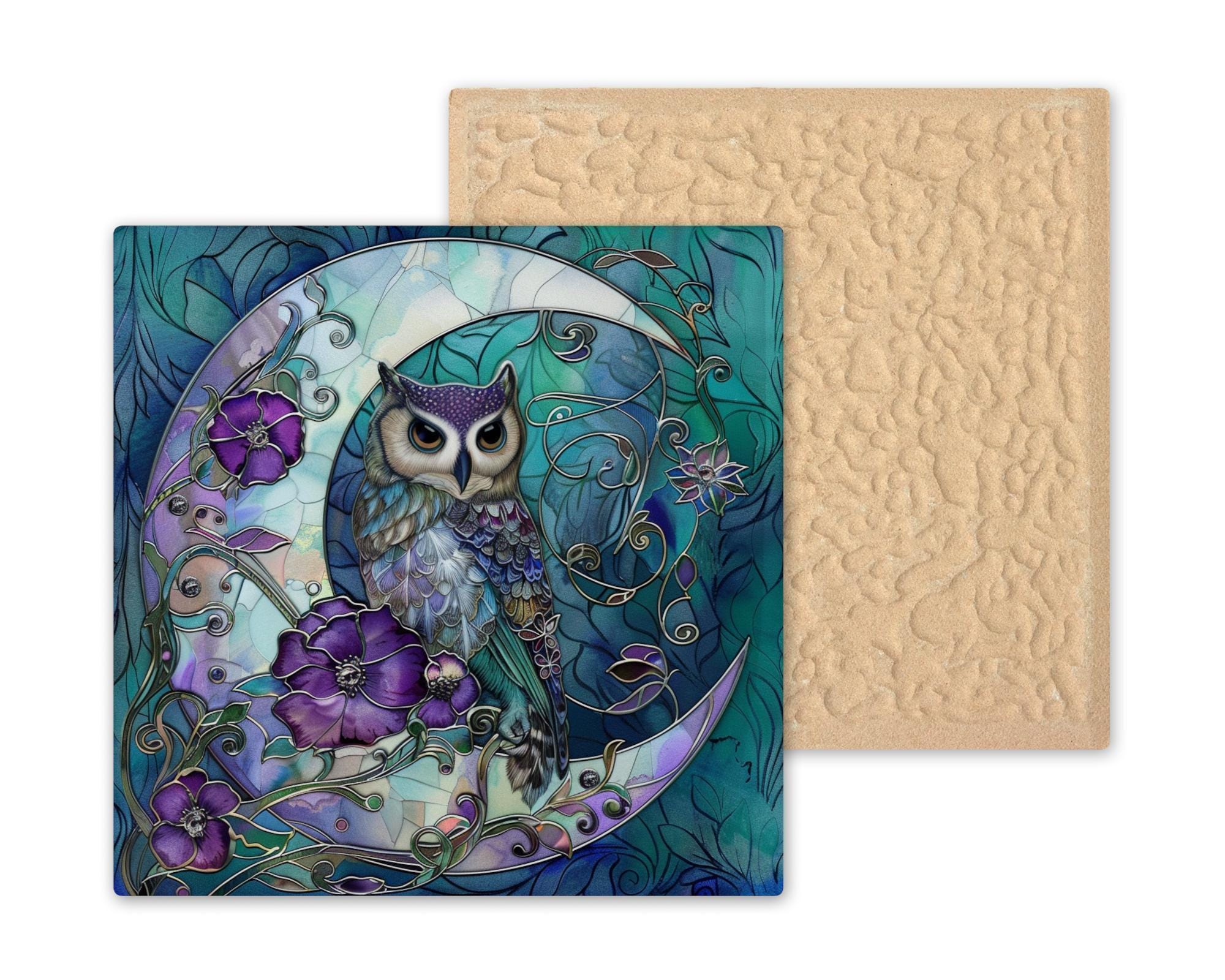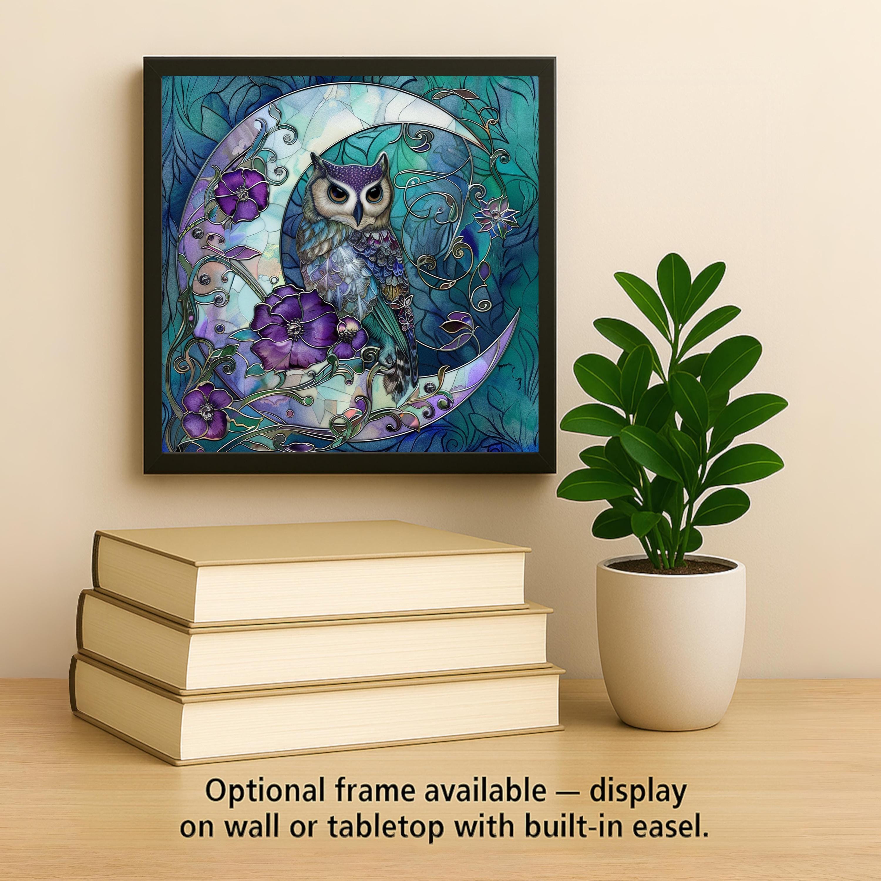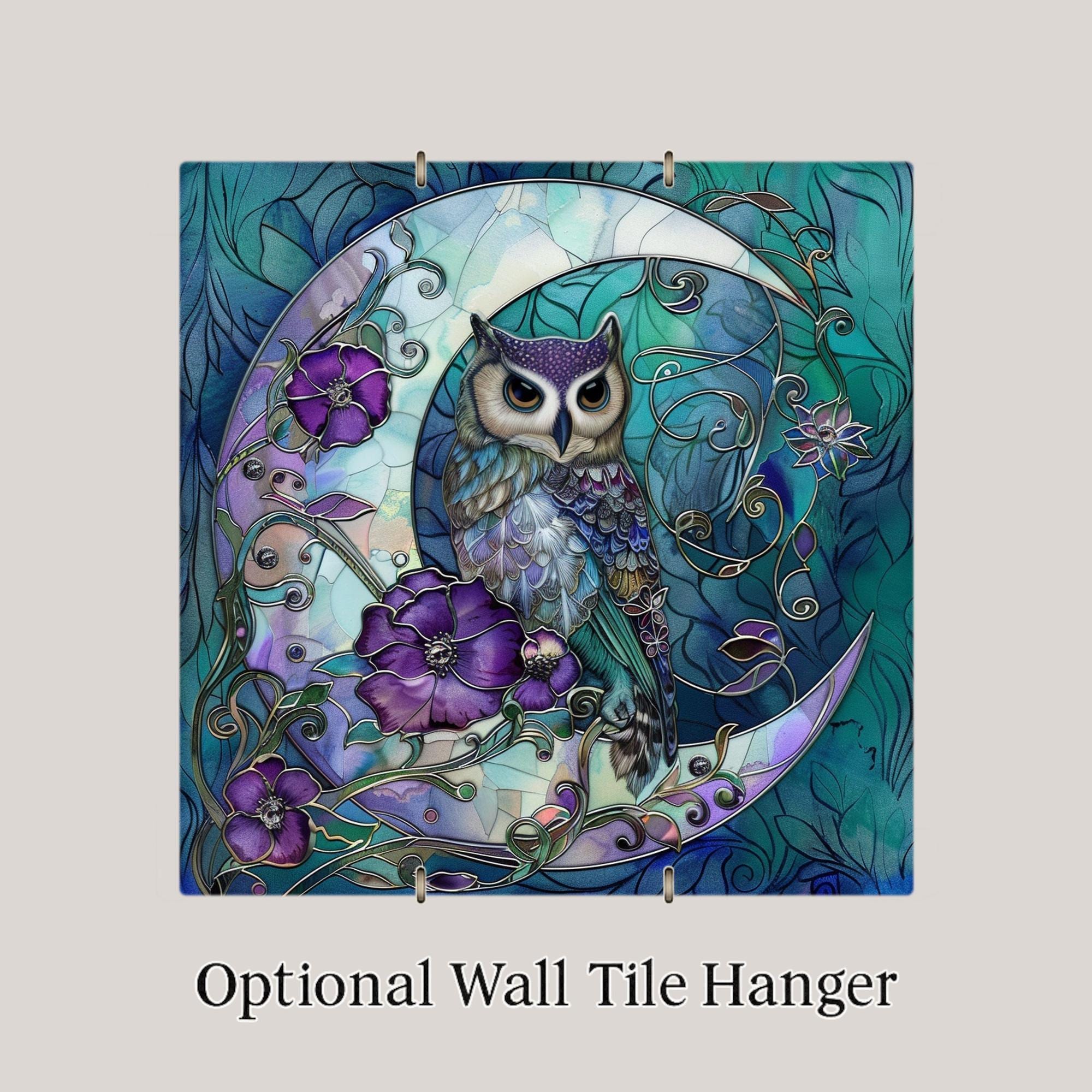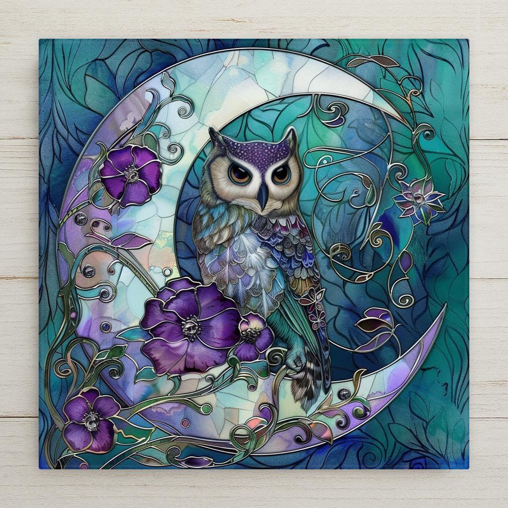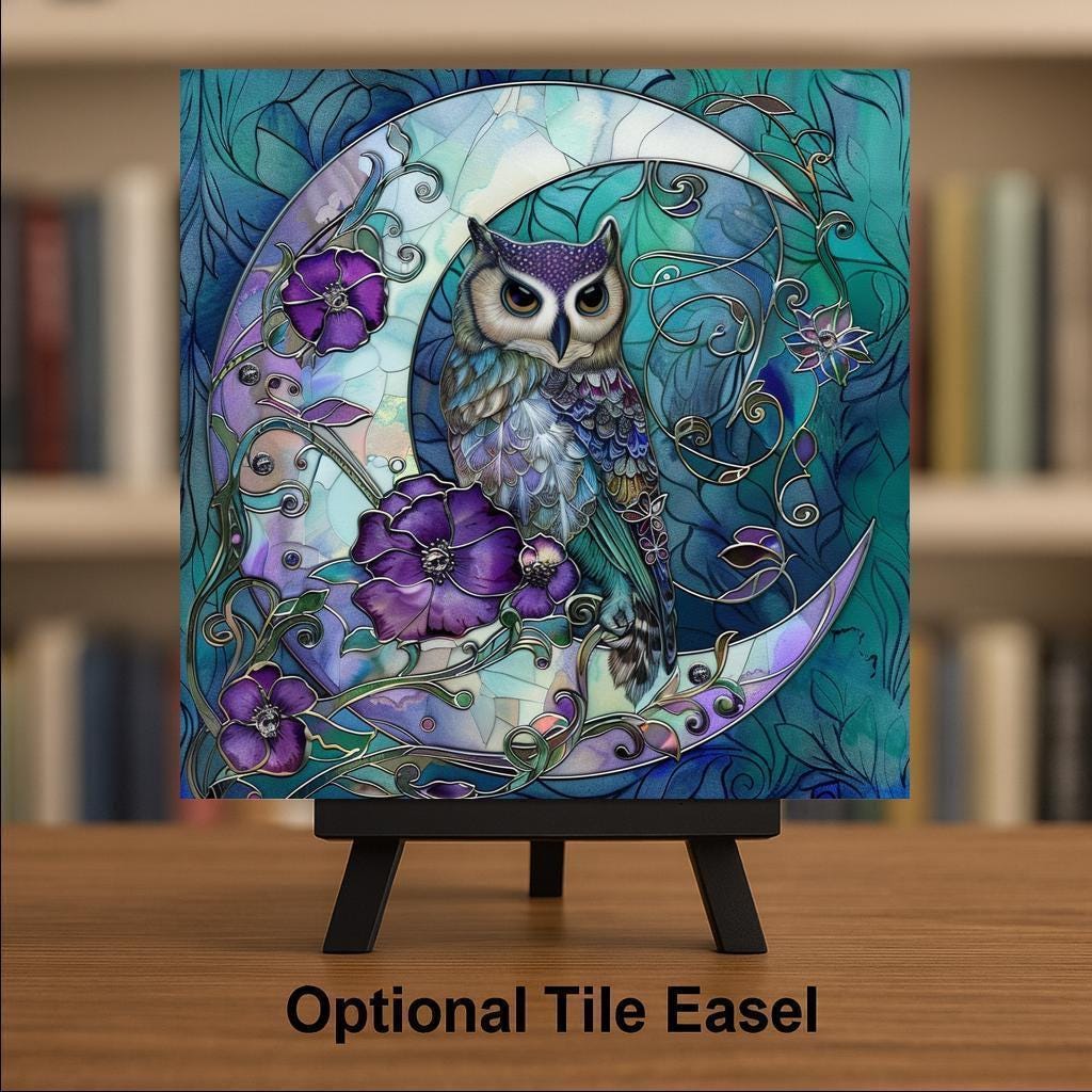 Transform your space with this magical moon owl ceramic tile art. This design shows a wise owl resting gracefully on a shining crescent moon, framed by rich purple flowers and elegant swirling vines. The stained glass style brings out bright, bold colors that glow beautifully, adding a mystical and peaceful feeling to any room. Perfect for anyone who loves owls, moon themes, or fantasy-inspired decor. The cool blues and purples mixed with soft teals make the piece feel calm and dreamlike. Though it looks like stained glass, this is actually a permanent, high-quality print on a sturdy ceramic tile. It is strong, easy to clean, and will keep its colors bright for many years. You can hang it on the wall, place it on a shelf, or include it in a gallery wall to create a magical focal point. This piece also makes a thoughtful gift for birthdays, holidays, or housewarming parties. You can add optional accessories like a tile wall hanger, easel tile stand, or cork backing to display it however you like. These choices make it simple to show off your art in the perfect way. The moon owl tile is sure to capture attention and inspire wonder in everyone who sees it. Celebrate your love of mystical nights and woodland creatures with this stunning design. Order yours today and bring a piece of moonlit magic into your home!