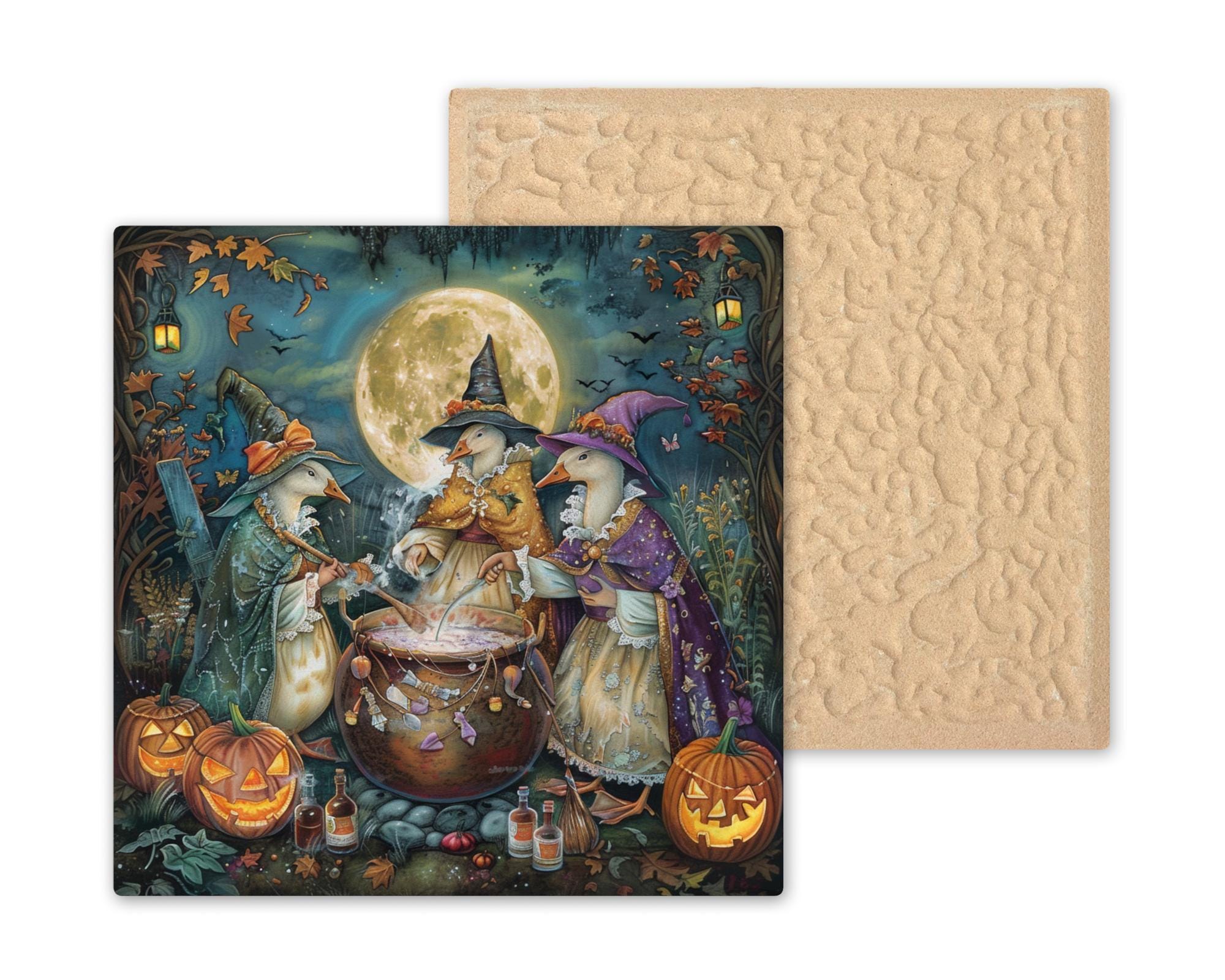 Brighten your Halloween decor with this fun witch goose ceramic tile art! This design features three adorable geese in witch costumes, stirring a bubbling cauldron under a glowing full moon. Around them, carved pumpkins, swirling leaves, and tiny potion bottles complete the enchanting Halloween scene. The beautiful colors, from rich oranges and warm purples to deep night sky blues, create a warm and inviting look. Perfect for anyone who loves animals, fun holiday decorations, or unique seasonal art. This tile is sure to make guests smile and add a cheerful touch to your Halloween setup. Though the artwork has a painted and detailed appearance, it is actually a permanent, high-quality print on a durable ceramic tile. It is strong, easy to clean, and made to stay bright and colorful for years. You can hang it on a wall, set it on a shelf, or include it in a gallery-style arrangement to create a festive focal point. This tile also makes a great gift for friends and family who adore whimsical Halloween art and enjoy decorating their homes for fall. You can choose optional add-ons like a tile wall hanger, easel tile stand, or cork backing to display it however you like. These options help you create the perfect setup to match your style. This witch goose ceramic tile art brings playfulness and charm to your space, making Halloween even more special. Order yours today and enjoy some extra magic this season!
