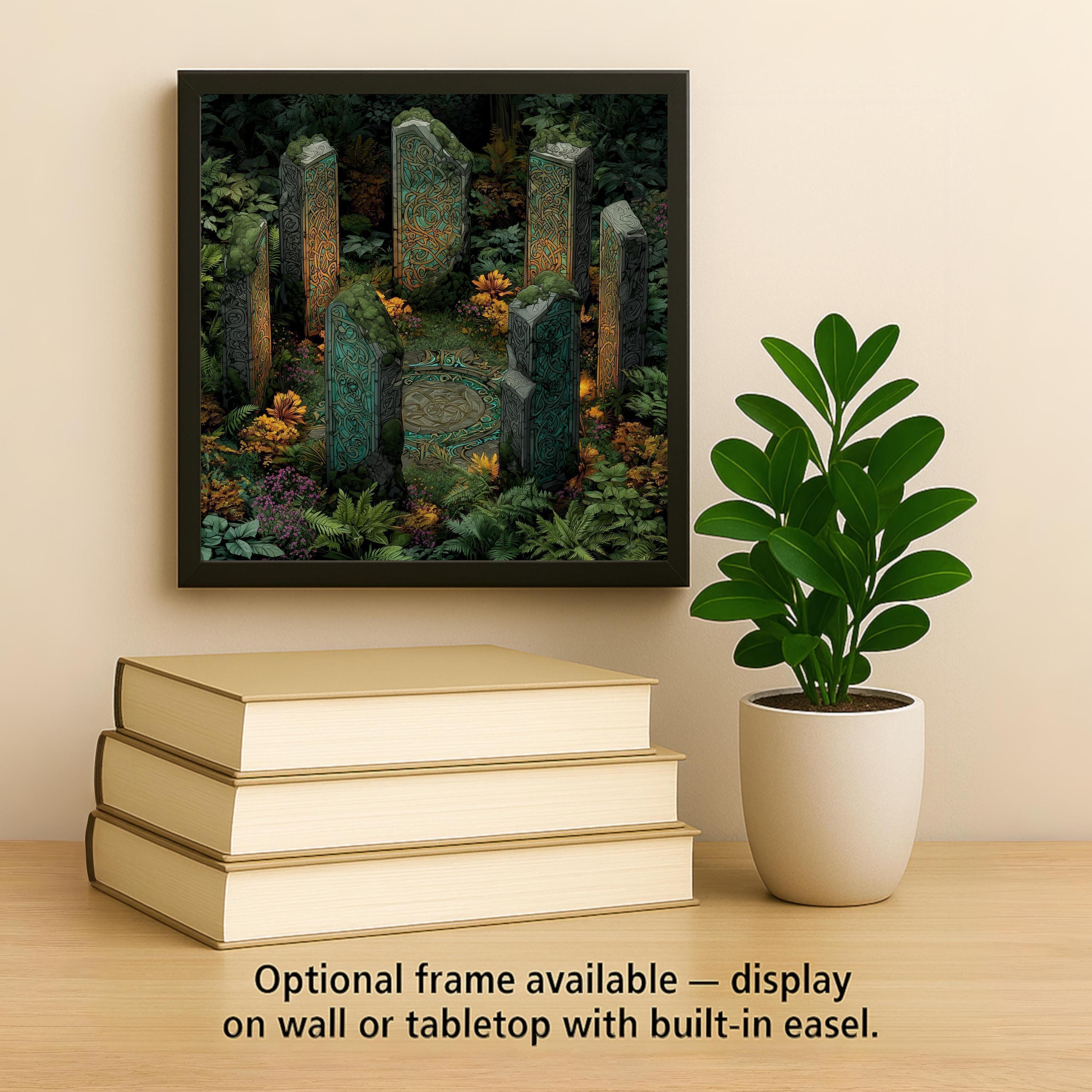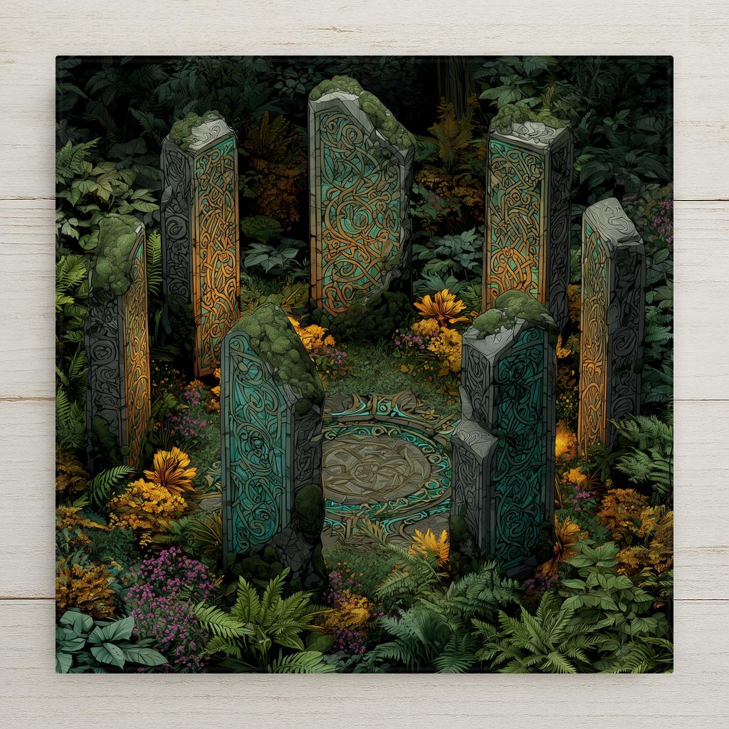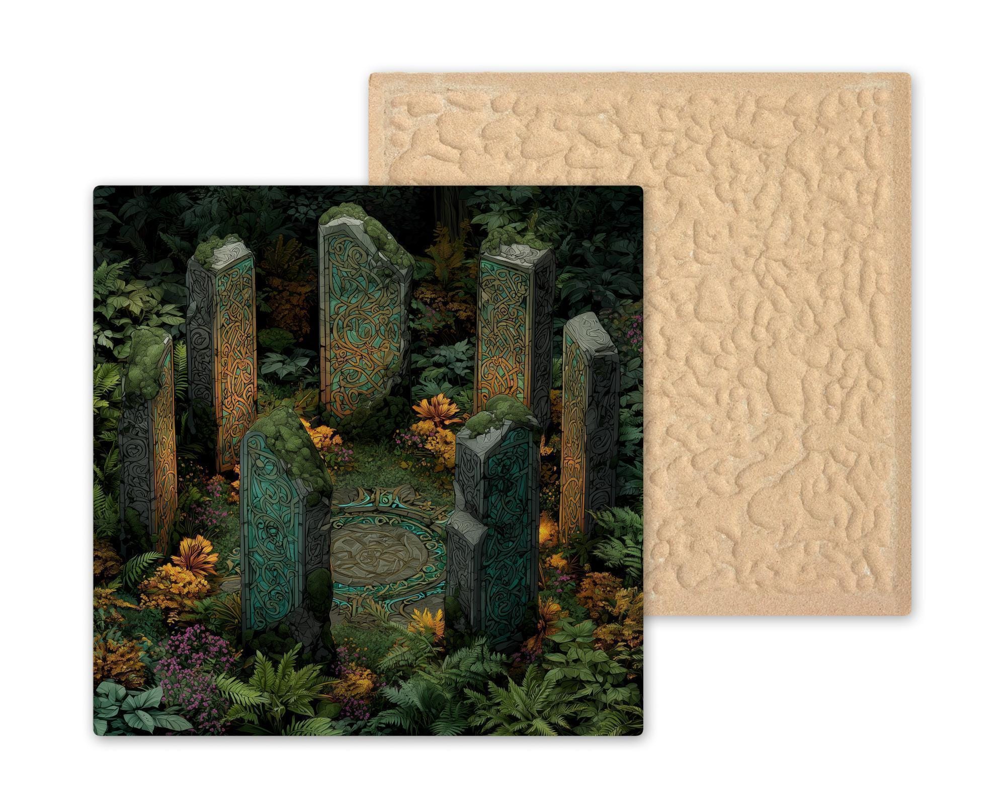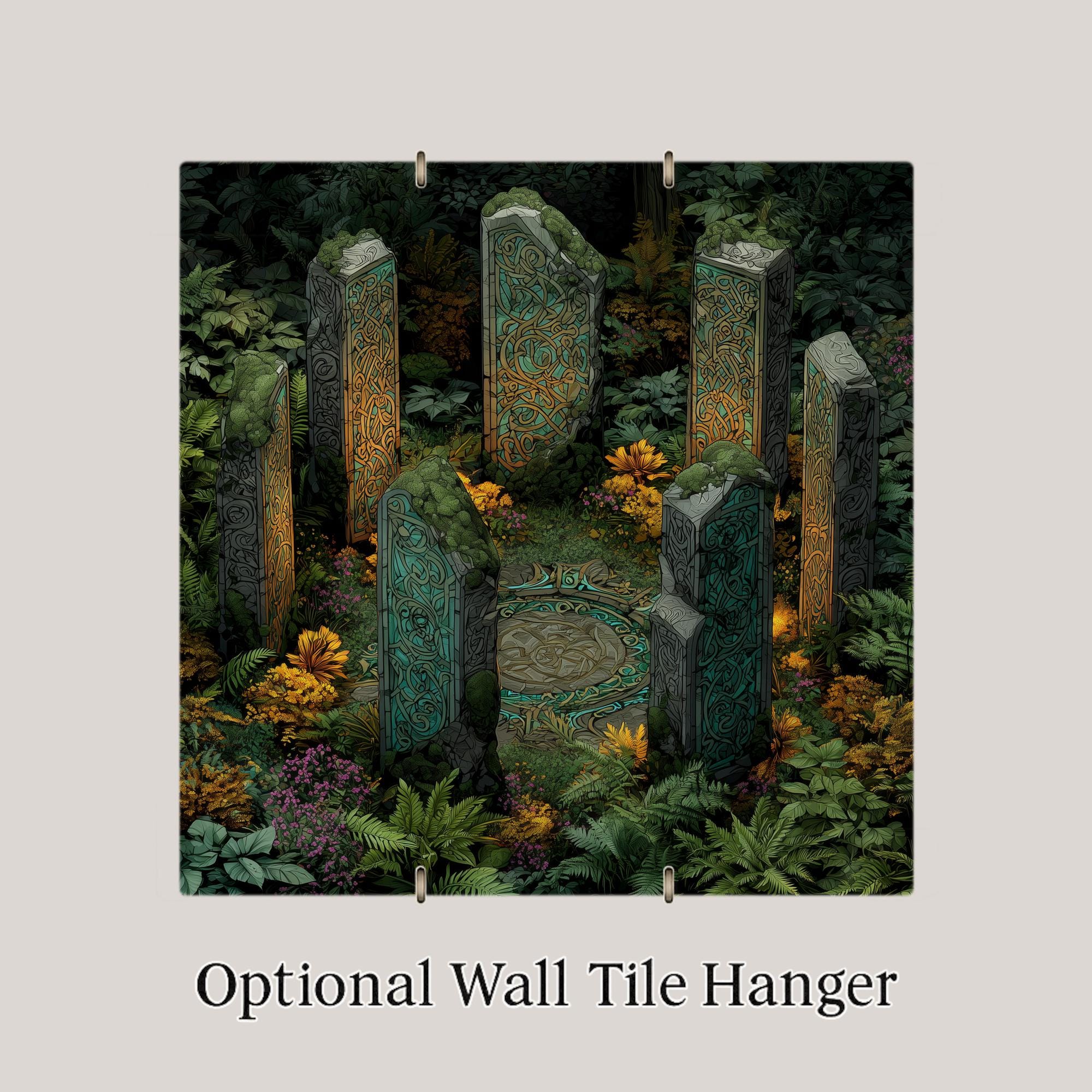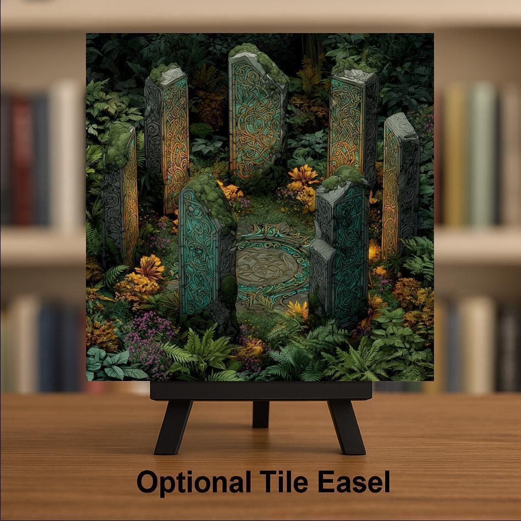 Transform your space with this stunning Celtic standing stones tile art, inspired by sacred sites and ancient rituals. Featuring detailed knot carvings and surrounded by forest moss and ferns, this stained glass-style design glows with deep greens, earthy grays, and luminous teal. Perfect as a statement piece above an entryway, in a meditation space, or as a spiritual home accent, this ceramic tile captures the mystery and power of Celtic heritage. Each tile is a vibrant, permanent print designed to last and inspire. Display it with an optional tile wall hanger, an easel tile stand, or cork backing to match your style and space. Celebrate the magic of the old world and invite a sense of wonder into your home. If you envision a custom scene or personal symbols, I’d be honored to bring it to life for you.