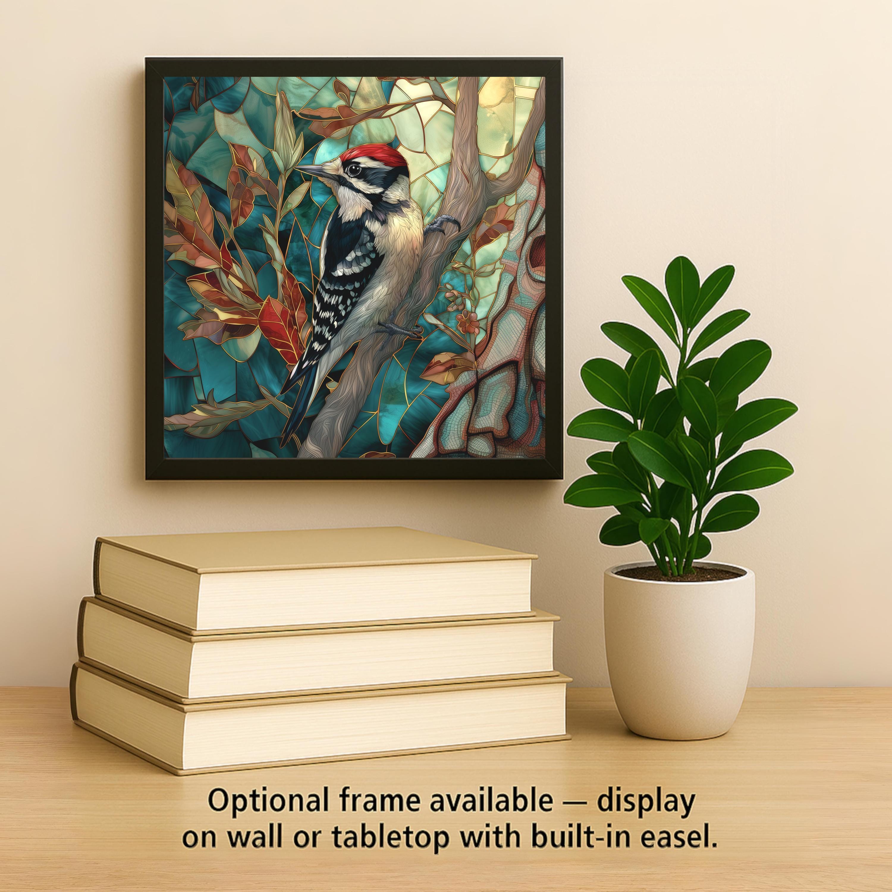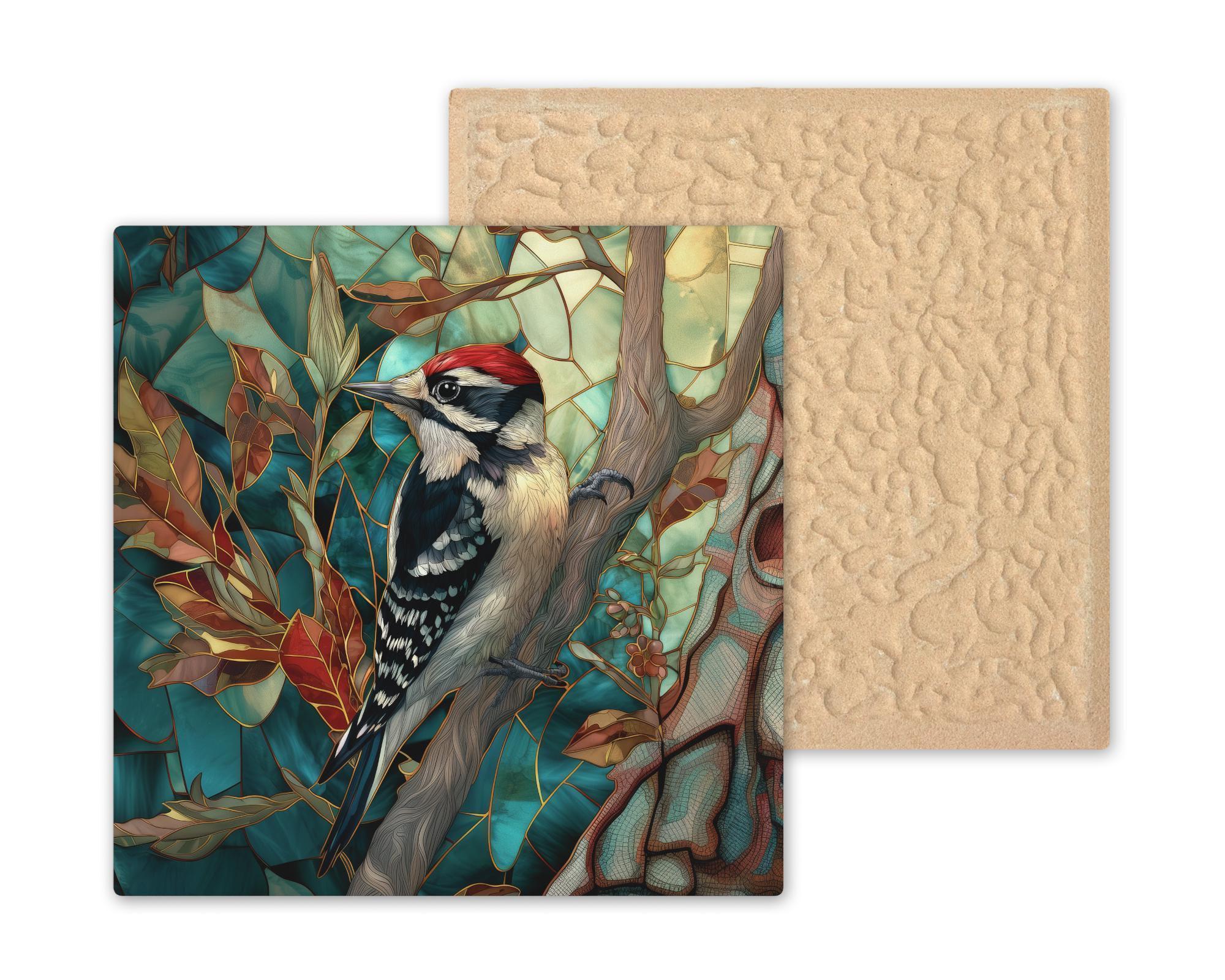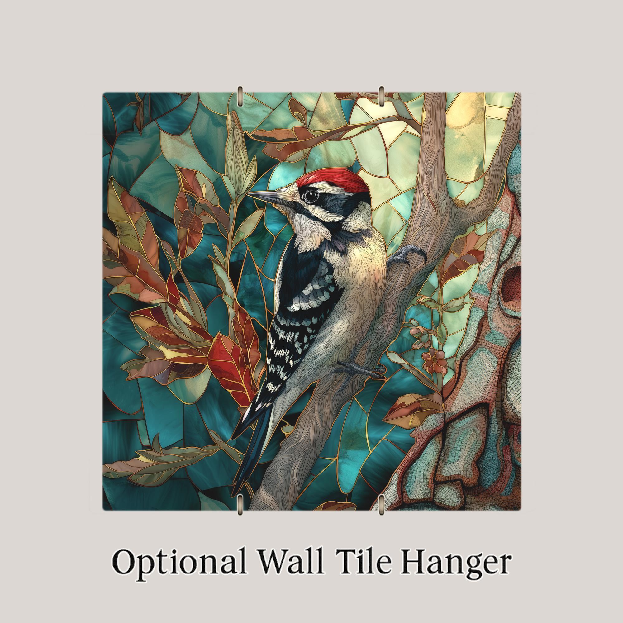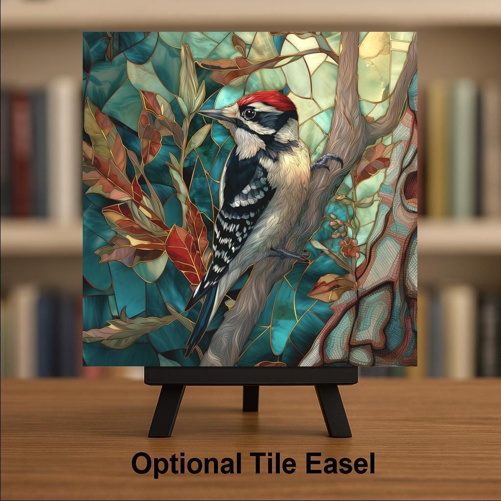 Celebrate the beauty of woodland birds with this enchanting Downy Woodpecker ceramic tile art. Designed in a luminous stained glass-inspired style with Art Nouveau flowing lines, this piece features soft ivory, striking black, and a bright red crown set against a backdrop of teal forest leaves and golden highlights. Perfect for bird lovers, rustic homes, and anyone who appreciates the quiet magic of the woods. Each tile is a high-quality, permanent ceramic print, ready to add story and color to your space. Choose from optional display options: a tile wall hanger for easy mounting, an easel tile stand for shelf or table display, or cork backing for extra protection. Bring a touch of wild elegance to your walls or surprise a nature-loving friend with a truly unique gift.