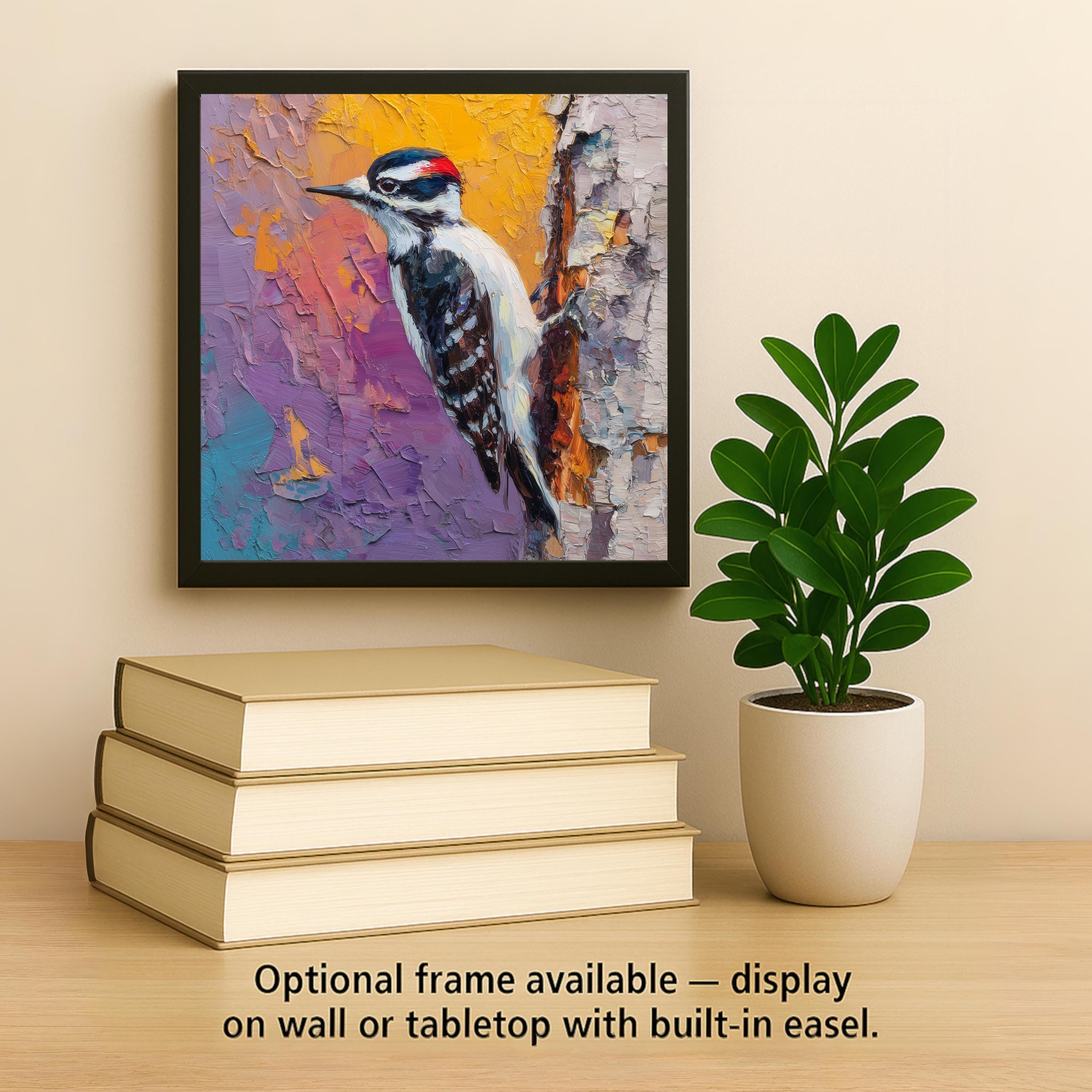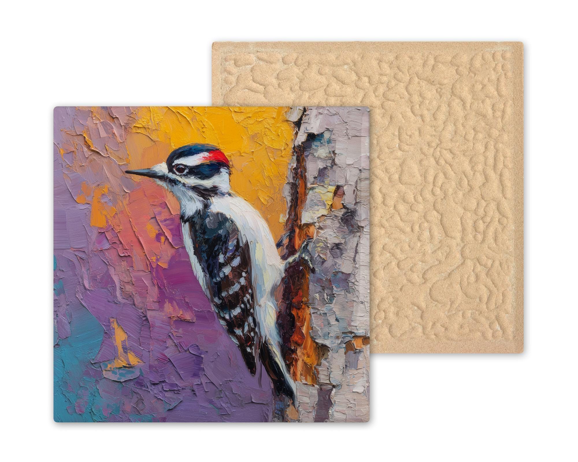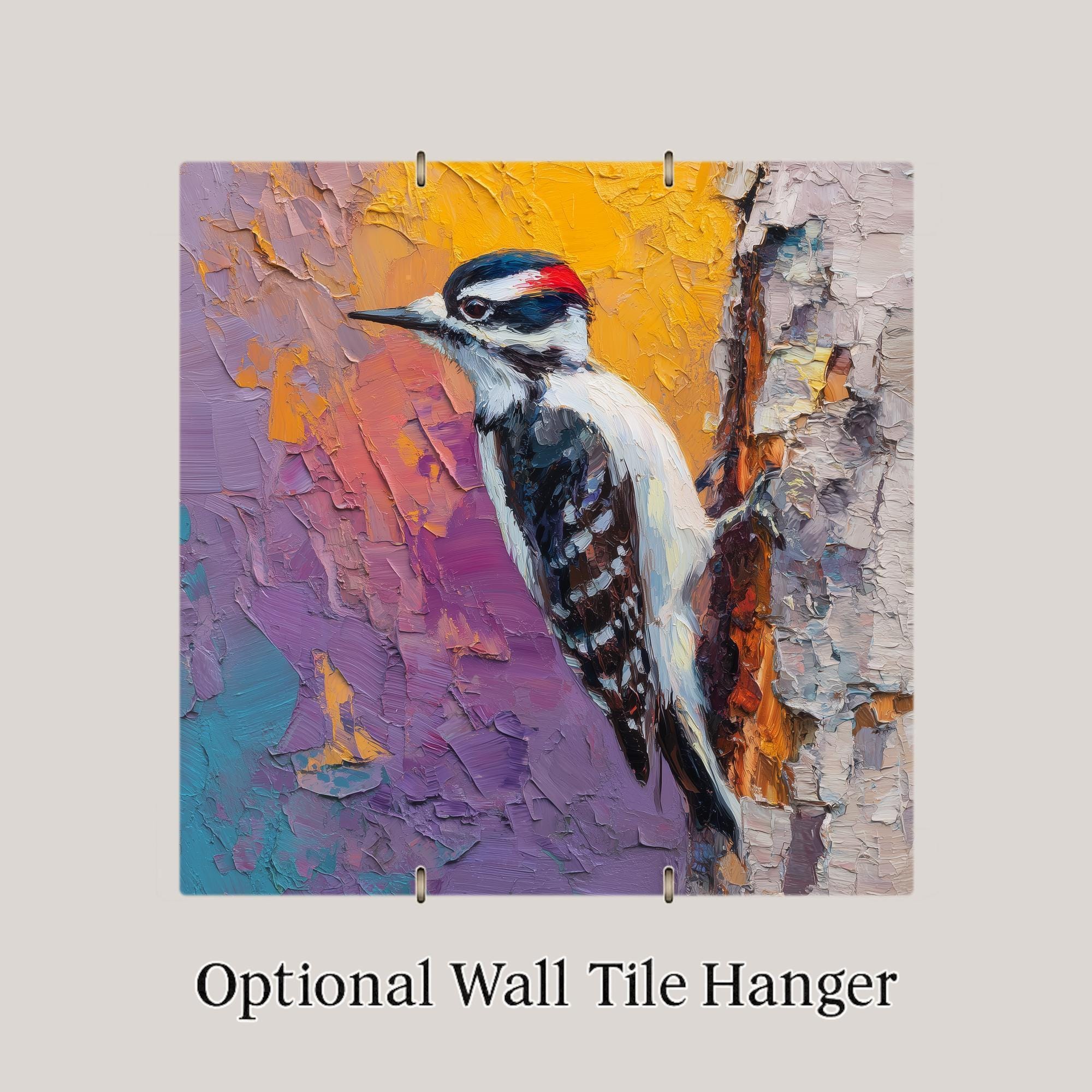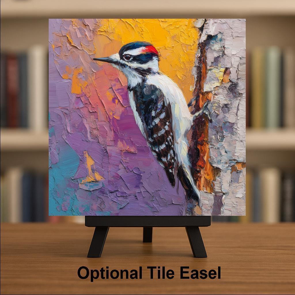 Celebrate your love of birds and vibrant color with this Downy Woodpecker ceramic art tile. Designed in a striking palette knife style, this artwork features layered brushstroke textures and brilliant hues, from bright oranges and deep purples to lively teal accents. Perfect as a statement piece for nature lovers, bird watchers, or anyone who craves bold, joyful decor. Each tile is a permanent, luminous print on ceramic, offering rich detail and lasting beauty. Display options include a tile wall hanger for easy mounting, an easel tile stand for tabletop display, or cork backing for extra versatility. Add a burst of artful energy to your home or gift it to a bird-loving friend — this piece is sure to inspire smiles and spark conversations.