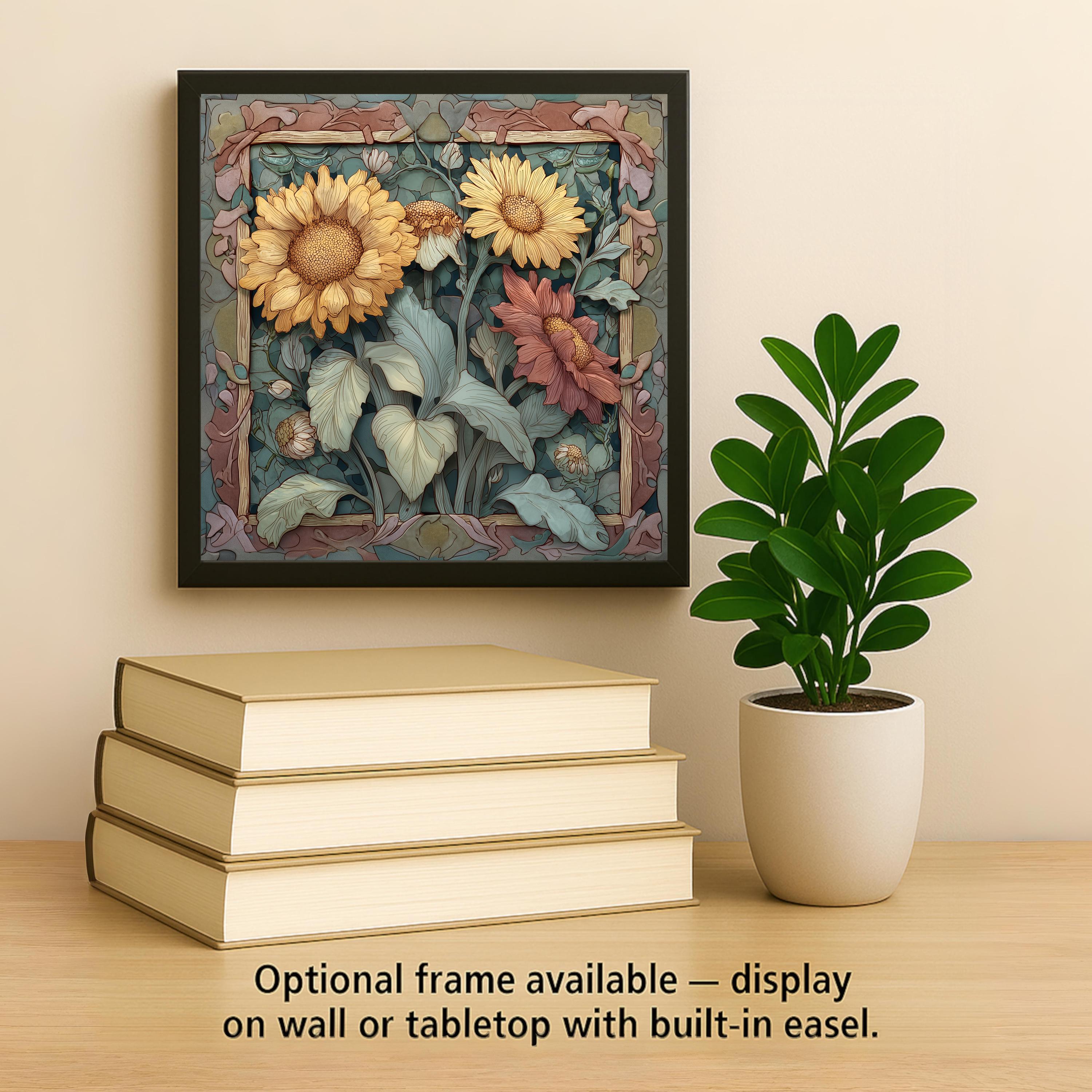 Celebrate the beauty of nature with this sunflower botanical ceramic tile, handcrafted for garden lovers, farmhouse decorators, and floral art collectors. The design features golden yellow sunflowers in full bloom, surrounded by soft sage leaves and a rustic floral border that mimics carved artisan stone. Set against a deep teal background with subtle patina-style shading, it makes a striking statement in kitchen walls, porches, or cottage patios.