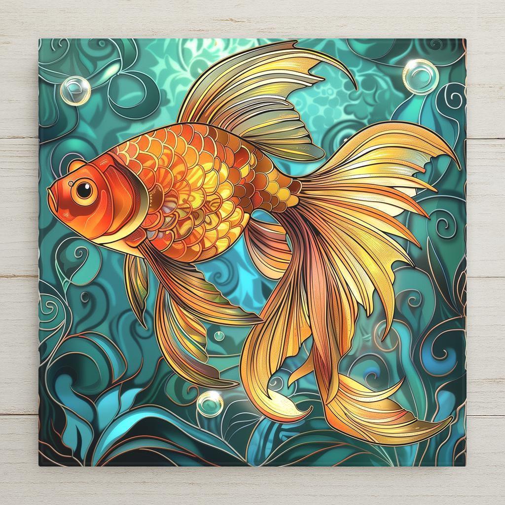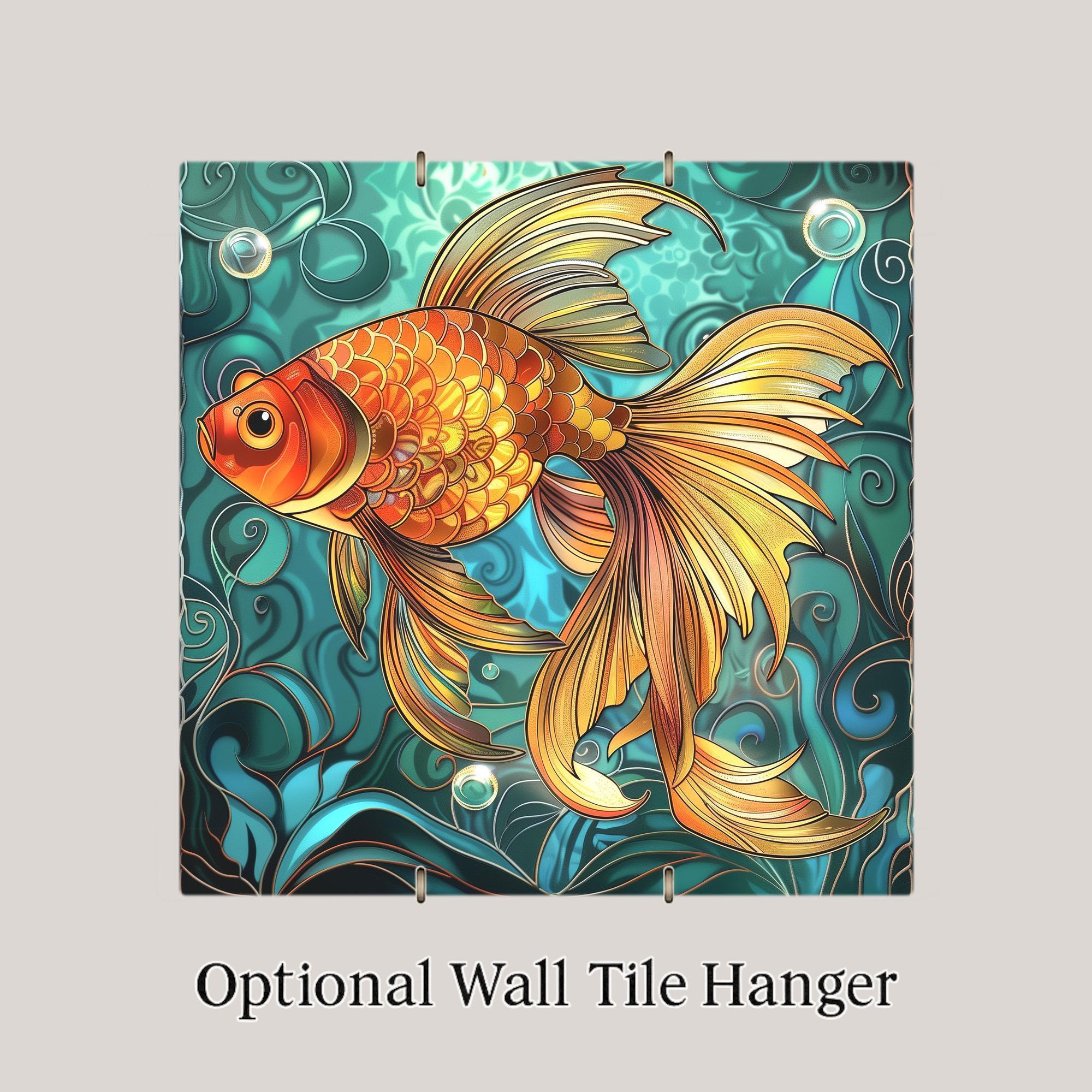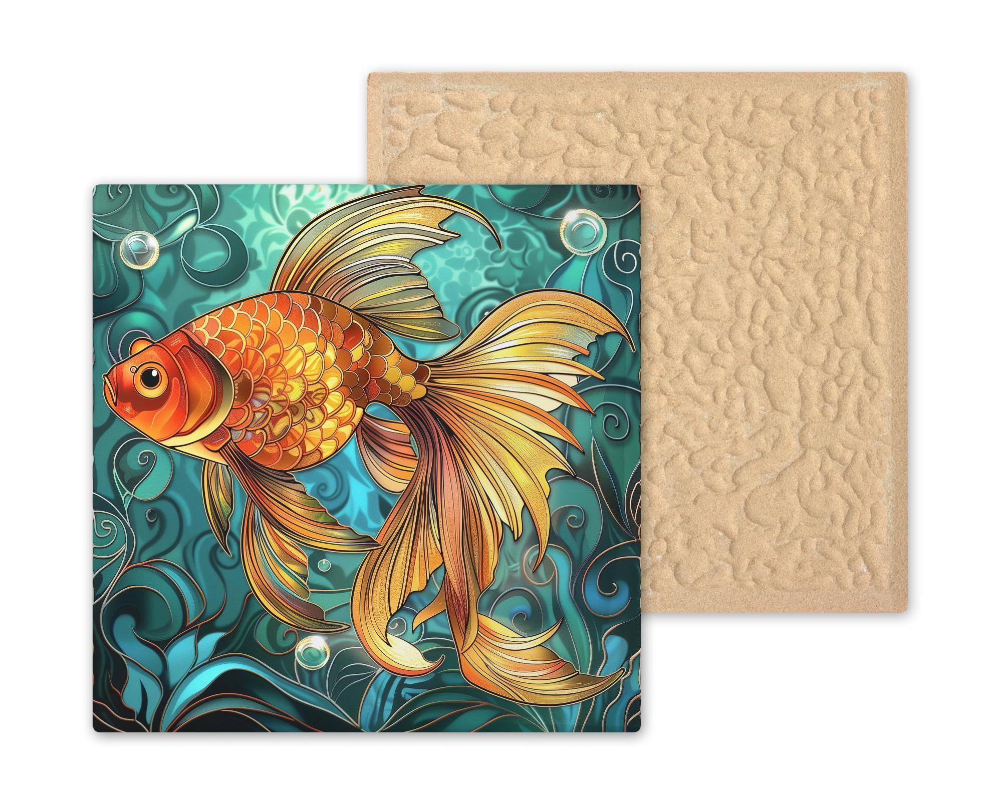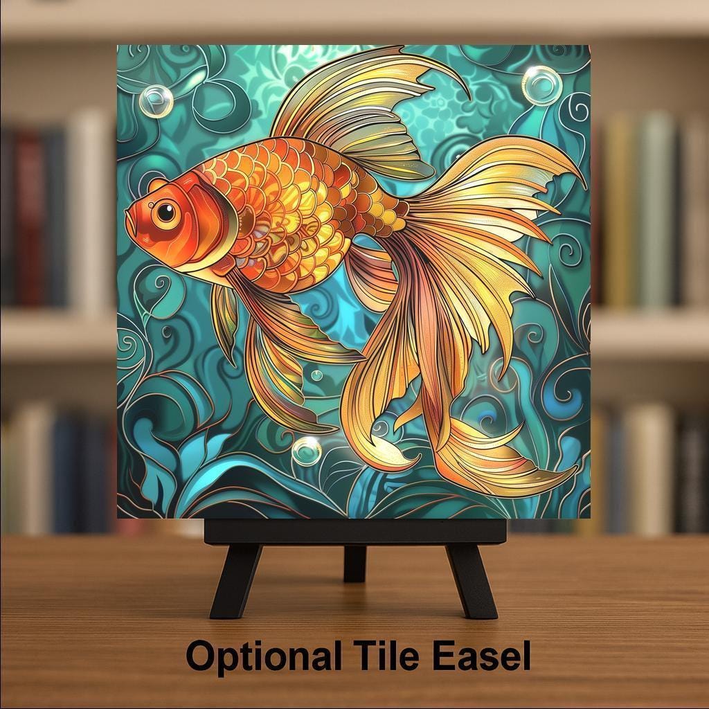 Add a splash of vibrant aquatic charm to your home with this goldfish ceramic tile, featuring a detailed fish design in a stained glass-inspired style. Please note: this is not actual stained glass or mosaic—it’s a professionally printed image on ceramic tile, using premium inks for a fine art finish. The tile's glowing gold, orange, and teal hues bring energy and warmth to any wall, especially in spa bathrooms, beach houses, or cozy reading nooks. Designed for fish lovers and décor enthusiasts alike, it’s perfect as a zen bathroom accent, tropical wall art, or part of a larger gallery collection. Optional accessories include a cork backing, tile wall hanger, or tabletop tile stand. Whether you’re enhancing a nature-inspired room or giving a meaningful gift, this decorative wall tile delivers beauty with low-maintenance durability and artisan charm—without the fragility of glass or mosaic.