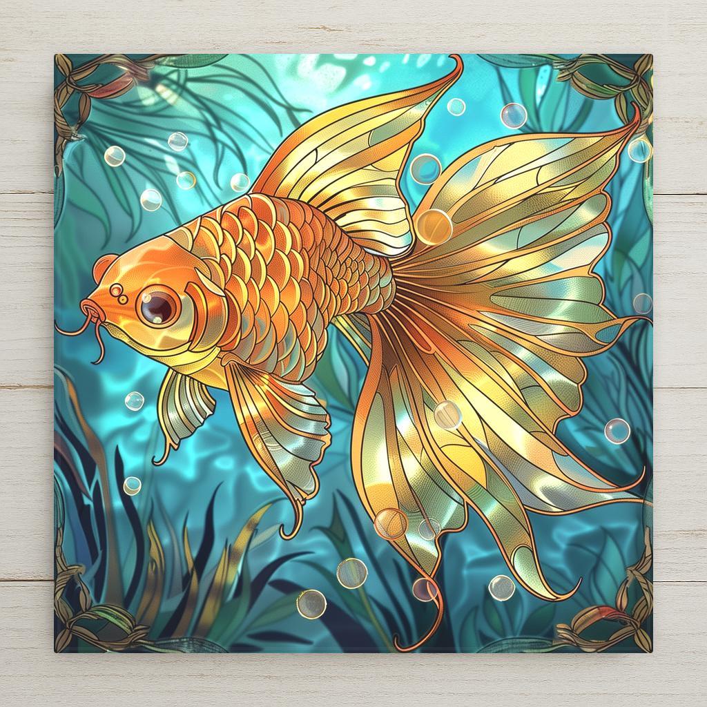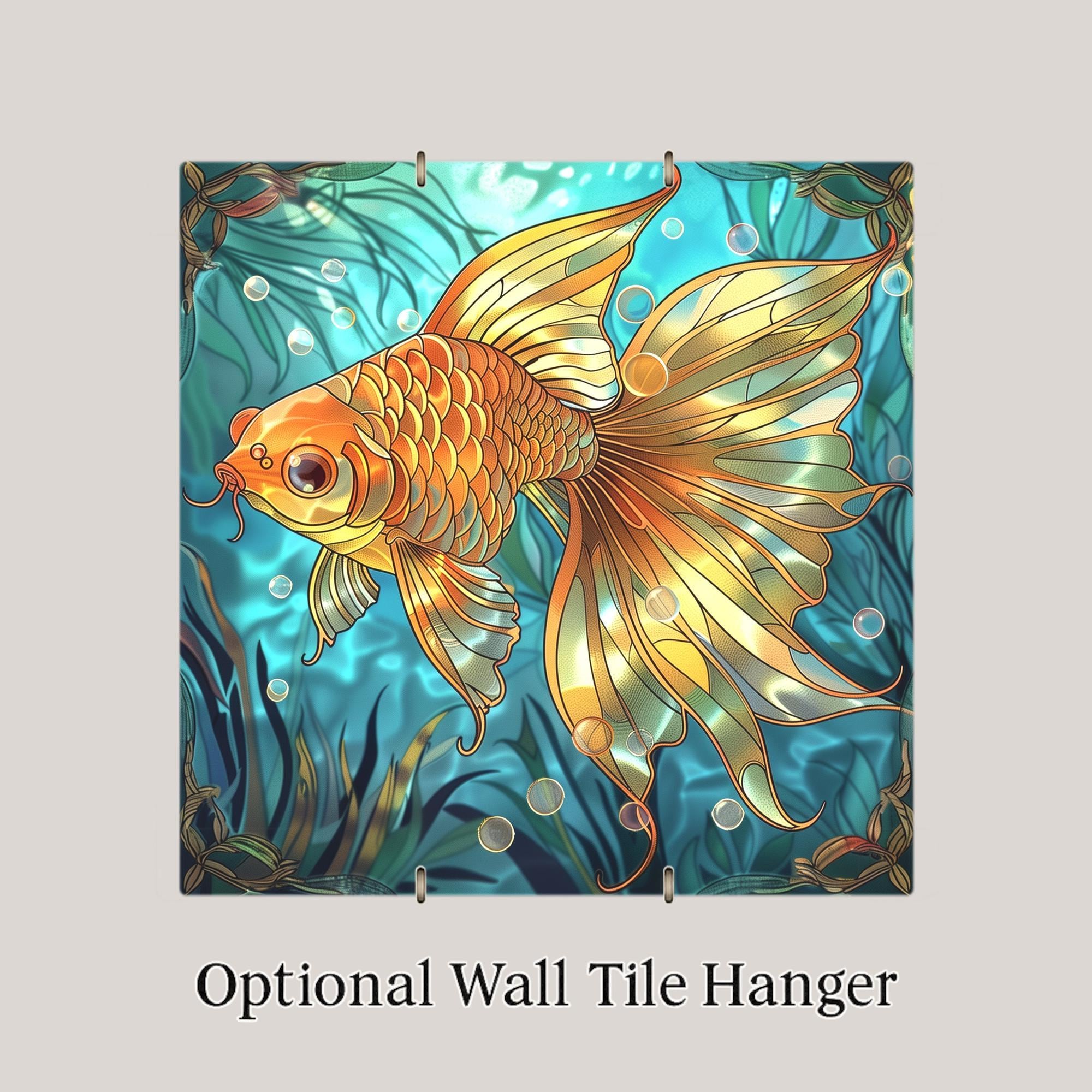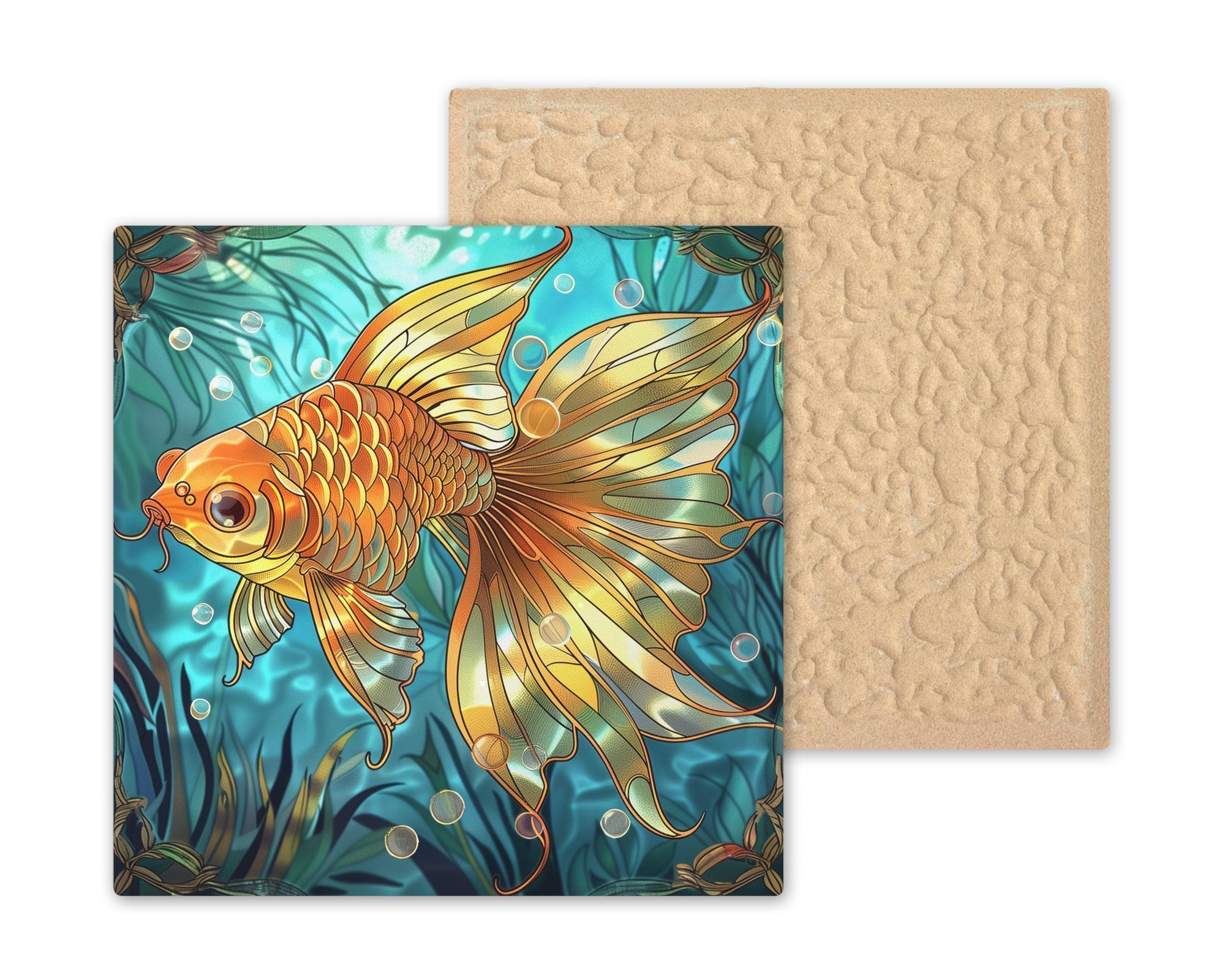 This beautiful goldfish ceramic tile is a rich and vibrant art piece, ideal for any space that needs a touch of nature-inspired elegance. Please note: this is not hand-painted or stained glass—the image is a high-definition permanent print on ceramic tile, designed to look like artistic stained glass with stunning clarity. With glowing oranges and golden scales, the fish design brings warmth and fluid movement to your walls. Whether displayed as boho bathroom decor, tropical kitchen art, or part of a gallery tile collection, it’s versatile and visually striking. The deep teal background creates depth and contrast, making this tile a standout in any light. Add optional features like a tile wall hanger, cork backing, or easel-style stand for easy setup. A perfect gift for fish lovers or those drawn to peaceful, zen-like decor styles.