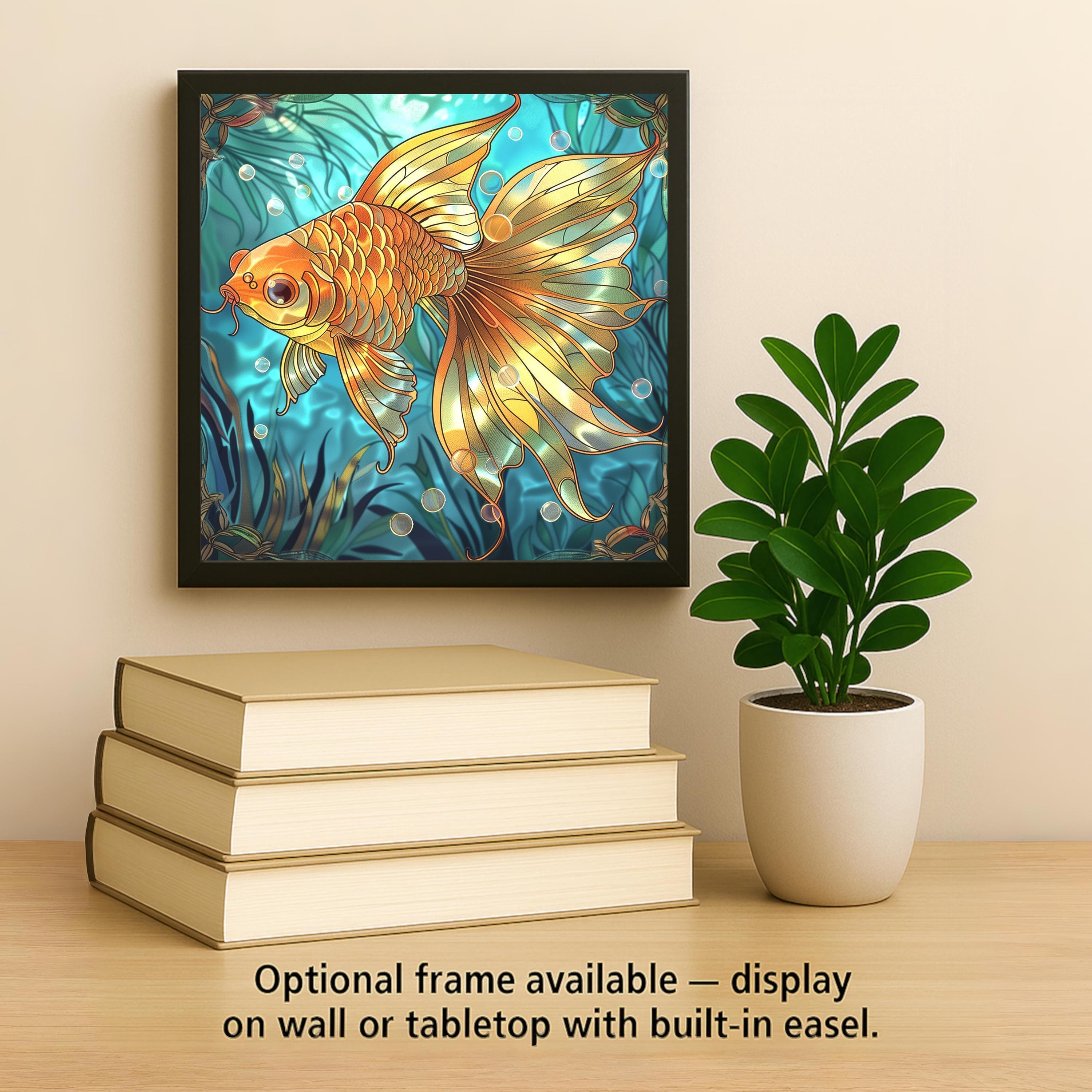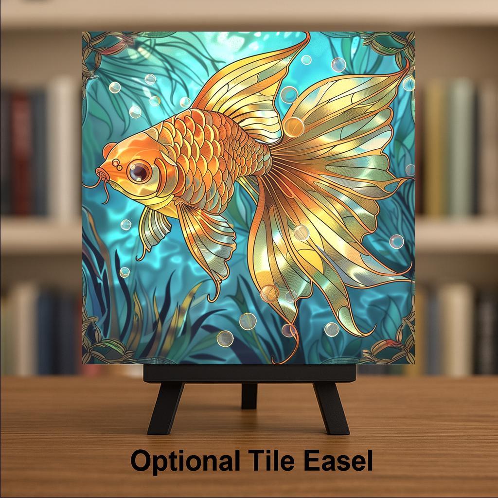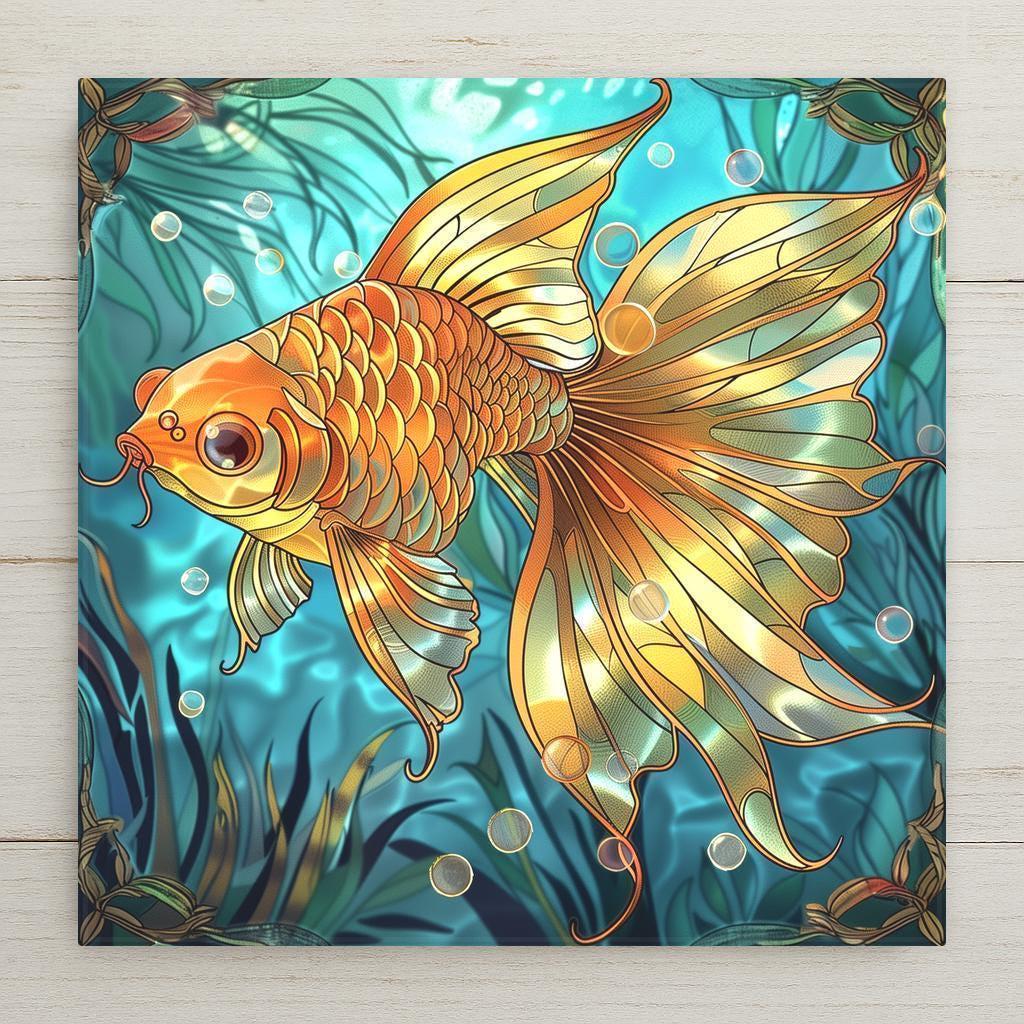 This beautiful goldfish ceramic tile is a rich and vibrant art piece, ideal for any space that needs a touch of nature-inspired elegance. Please note: this is not hand-painted or stained glass—the image is a high-definition permanent print on ceramic tile, designed to look like artistic stained glass with stunning clarity. With glowing oranges and golden scales, the fish design brings warmth and fluid movement to your walls. Whether displayed as boho bathroom decor, tropical kitchen art, or part of a gallery tile collection, it’s versatile and visually striking. The deep teal background creates depth and contrast, making this tile a standout in any light. Add optional features like a tile wall hanger, cork backing, or easel-style stand for easy setup. A perfect gift for fish lovers or those drawn to peaceful, zen-like decor styles.