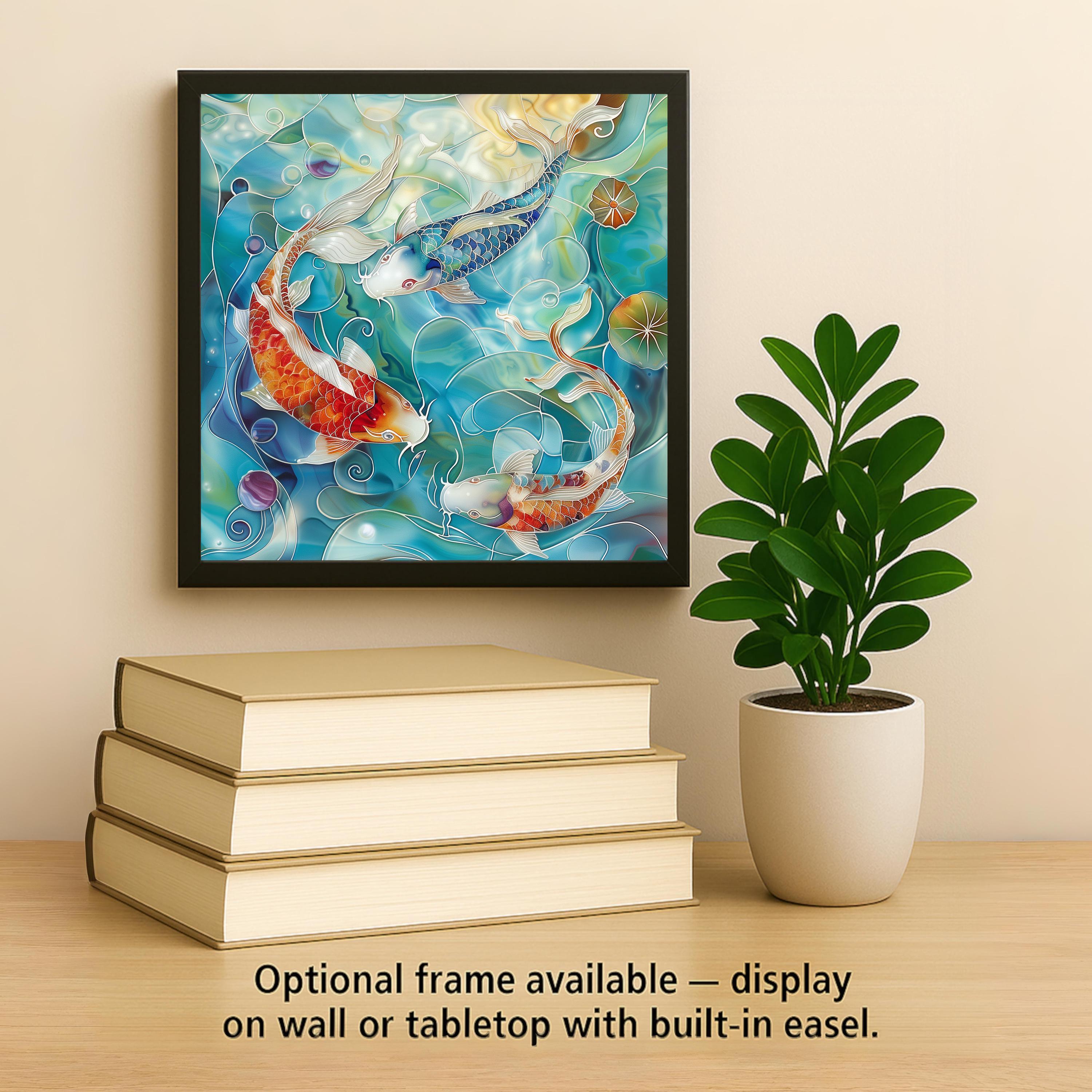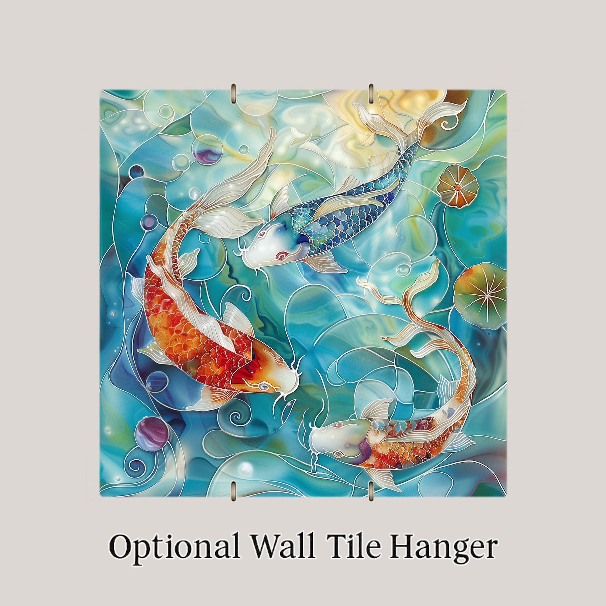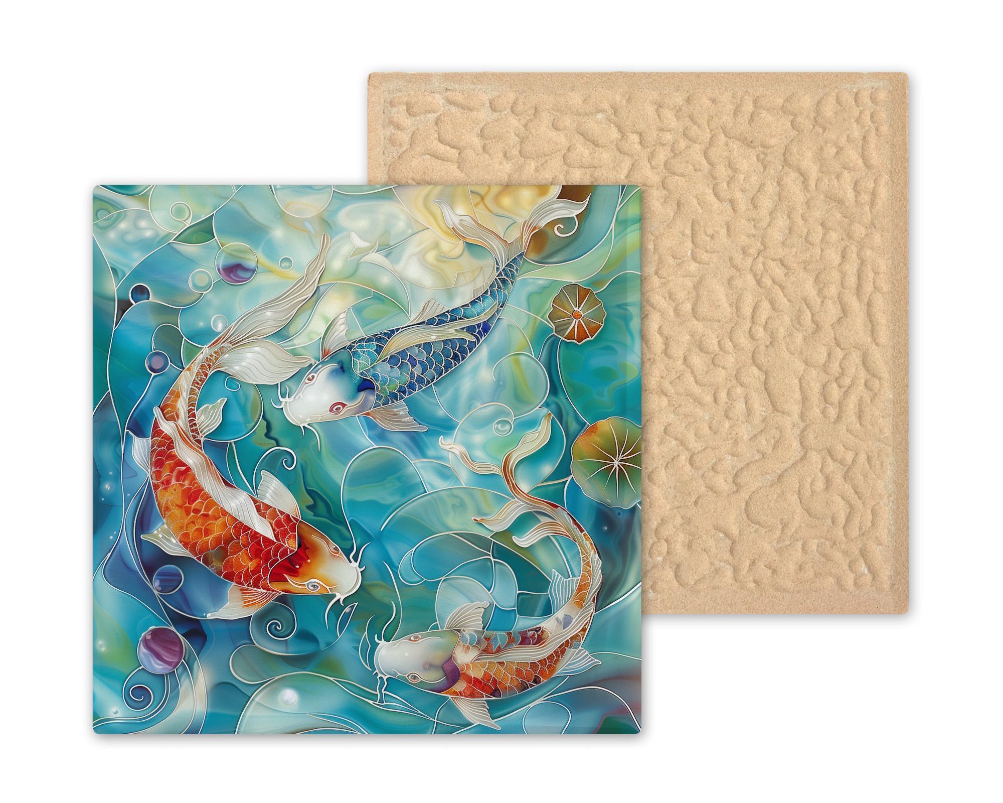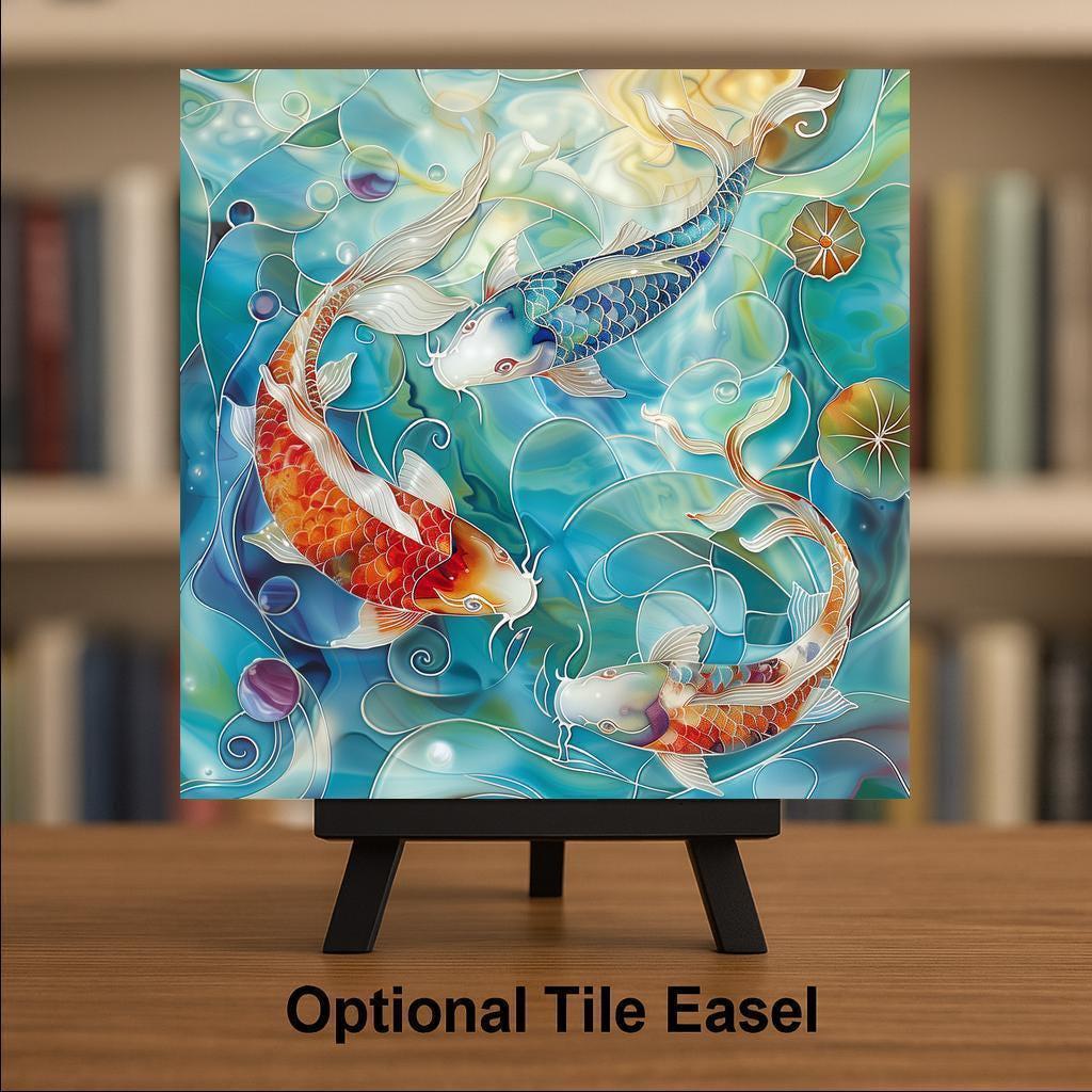 This koi fish ceramic tile is a celebration of harmony, fluidity, and vibrant aquatic beauty. Featuring three koi fish swimming among lily pads and rippling waves, the artwork mimics the look of hand-painted mosaic art while maintaining the clarity and durability of a printed image. Each tile is created with a fine art sublimation process and premium inks, producing rich, vivid colors that resist fading over time. Ideal for home decorators seeking a tranquil vibe, koi lovers, or those who admire Japanese-inspired aesthetics. It makes a great addition to a zen bathroom, aquatic-themed kitchen, or peaceful meditation space. Whether displayed on a shelf, hung on a wall, or incorporated into a decorative arrangement, this tile offers visual calm and elegance. Optional add-ons include a tile stand, tile wall hanger, or cork backing. This is a print on ceramic tile—designed to look like mosaic or painting, but not physically sculpted or hand-painted.
