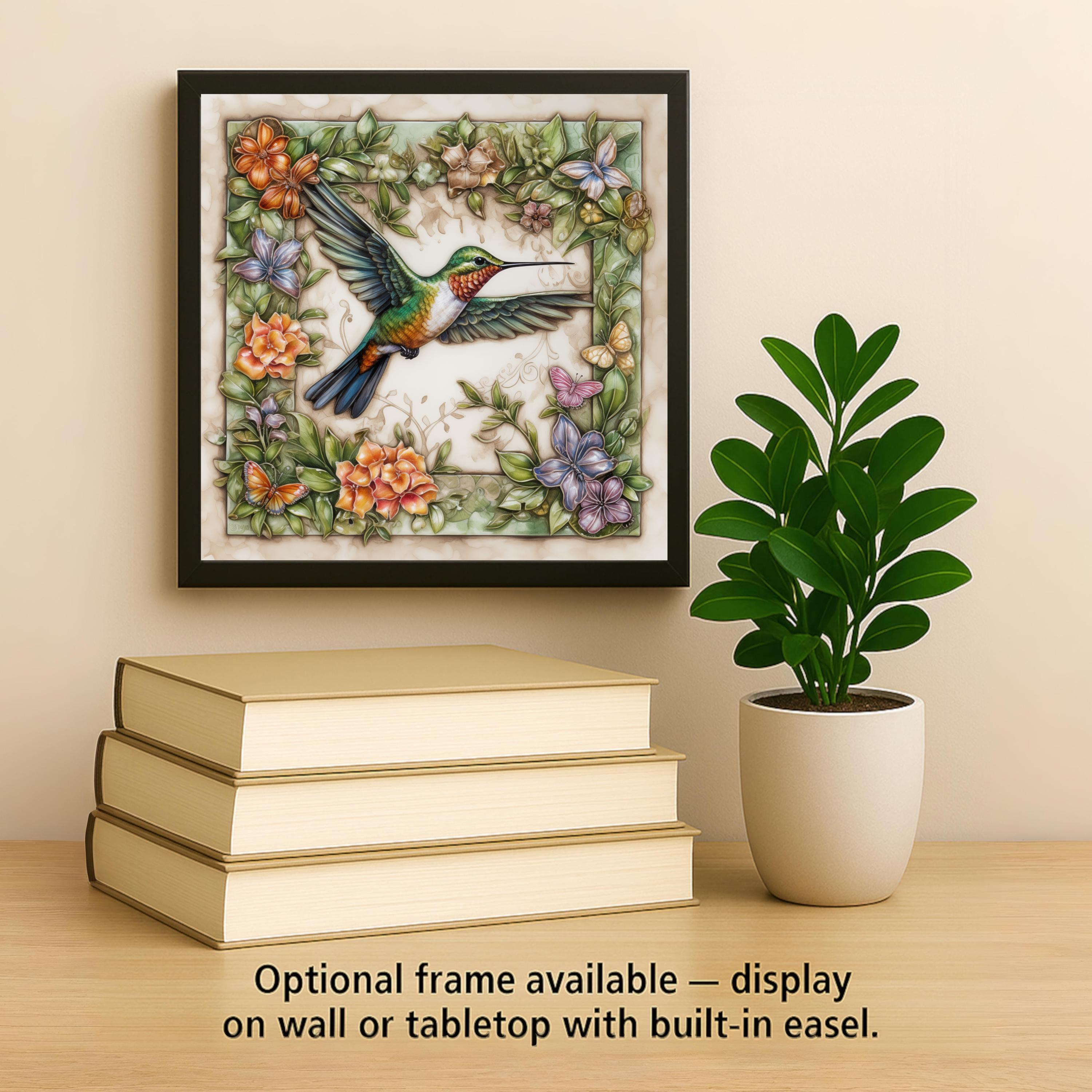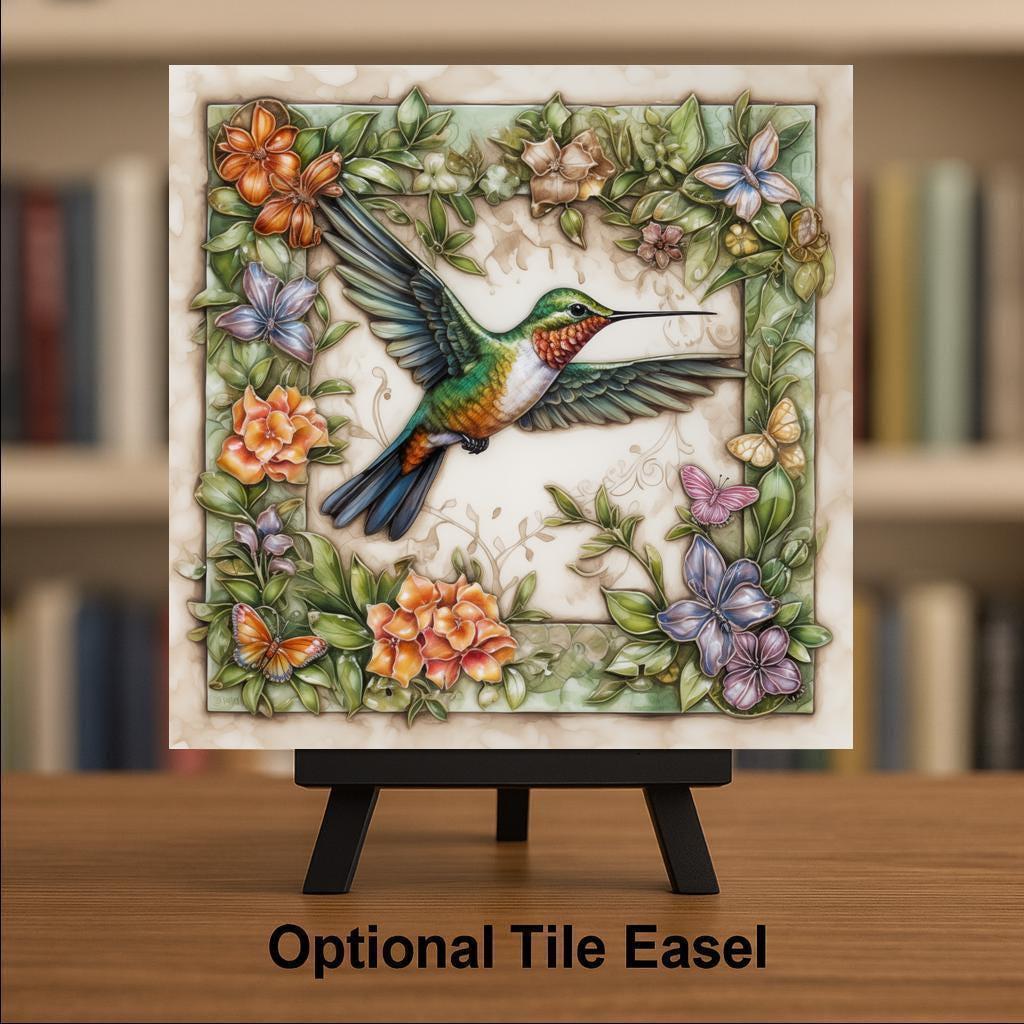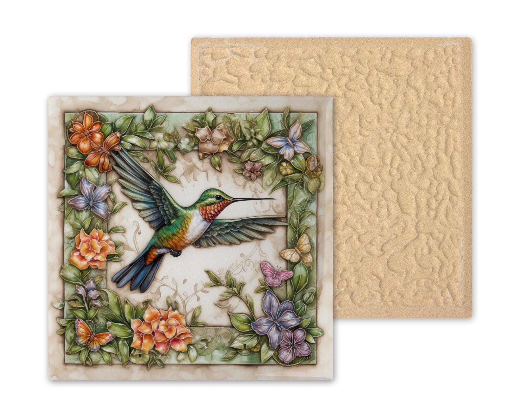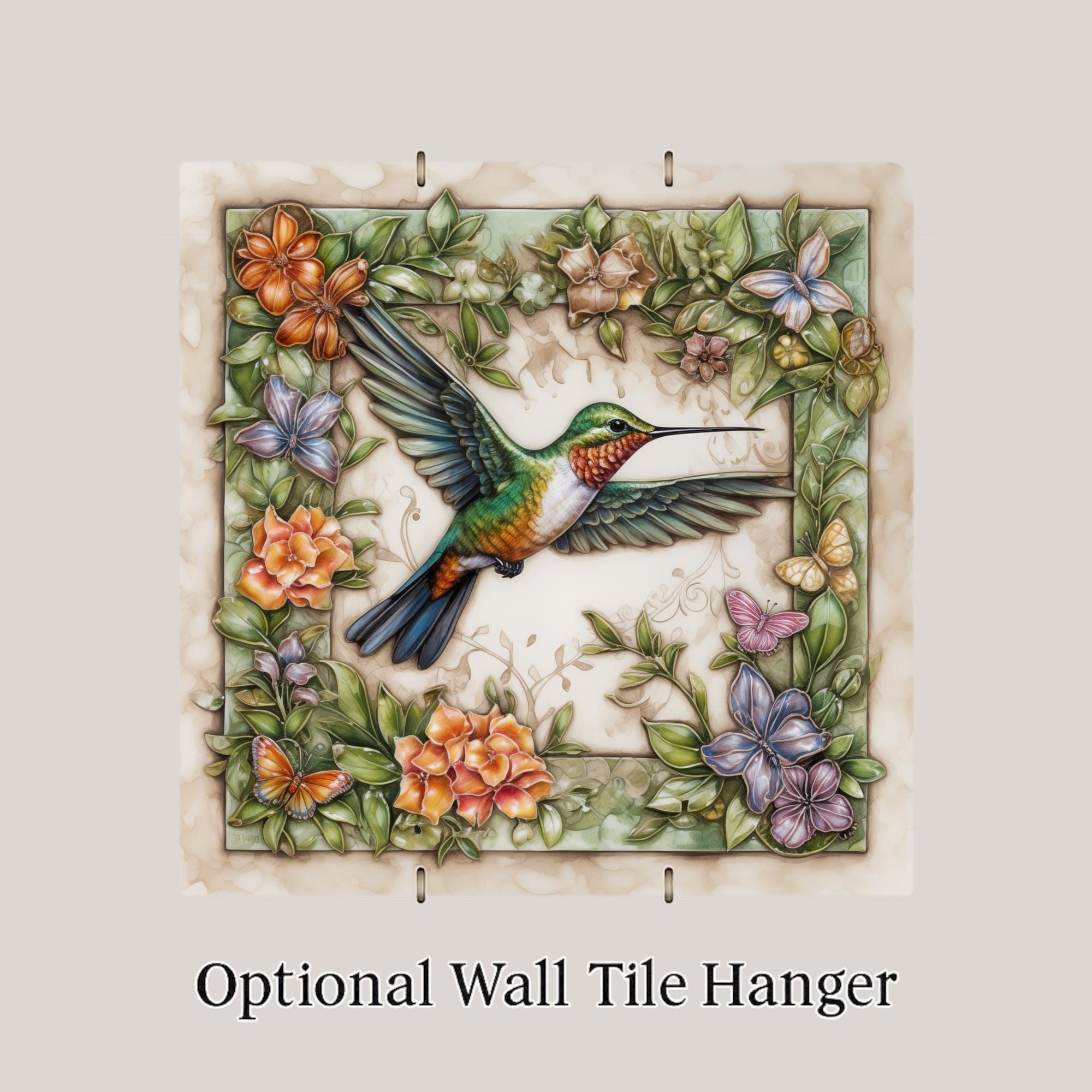 This hummingbird and floral wreath ceramic tile captures the beauty of nature in a richly detailed, high-resolution print. Designed to evoke the feel of a handcrafted piece, the tile features a central hummingbird surrounded by colorful wildflowers and butterflies, giving it a rustic yet elegant charm. It's ideal as a centerpiece for farmhouse kitchen décor, a focal accent for bathroom walls, or a garden-inspired wall hanging.