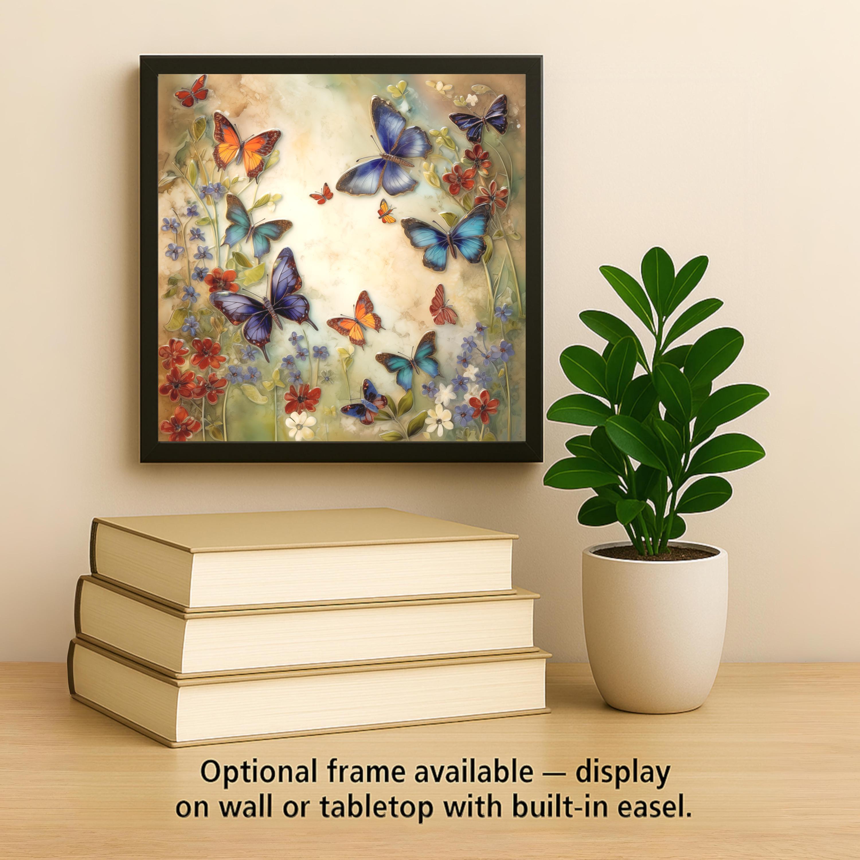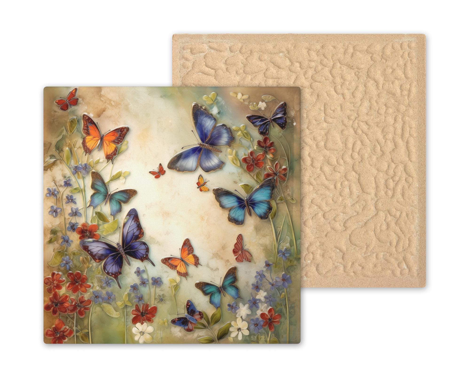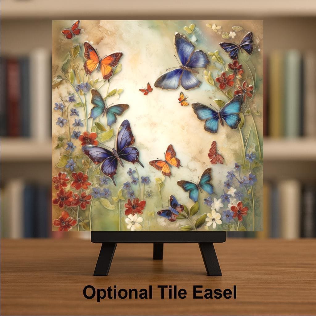 Celebrate the beauty of butterflies in full bloom with this stunning Butterfly Garden Ceramic Tile. Delicate wildflowers and brightly colored wings surround a sunlit backdrop, giving this tile a soft and cheerful aesthetic. It looks like a mosaic or sculpted relief, but it’s a high-resolution permanent print on durable ceramic—no fragile parts, just pure visual joy.