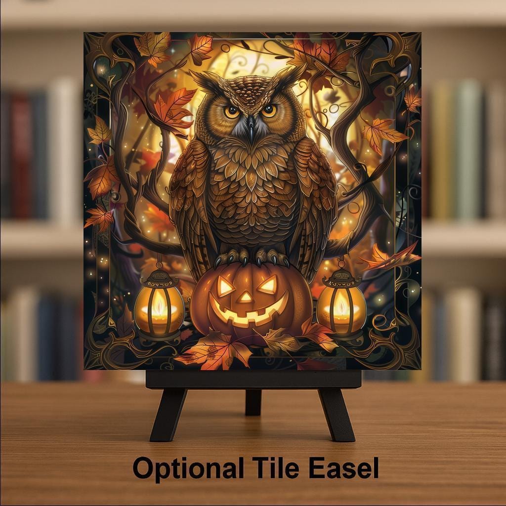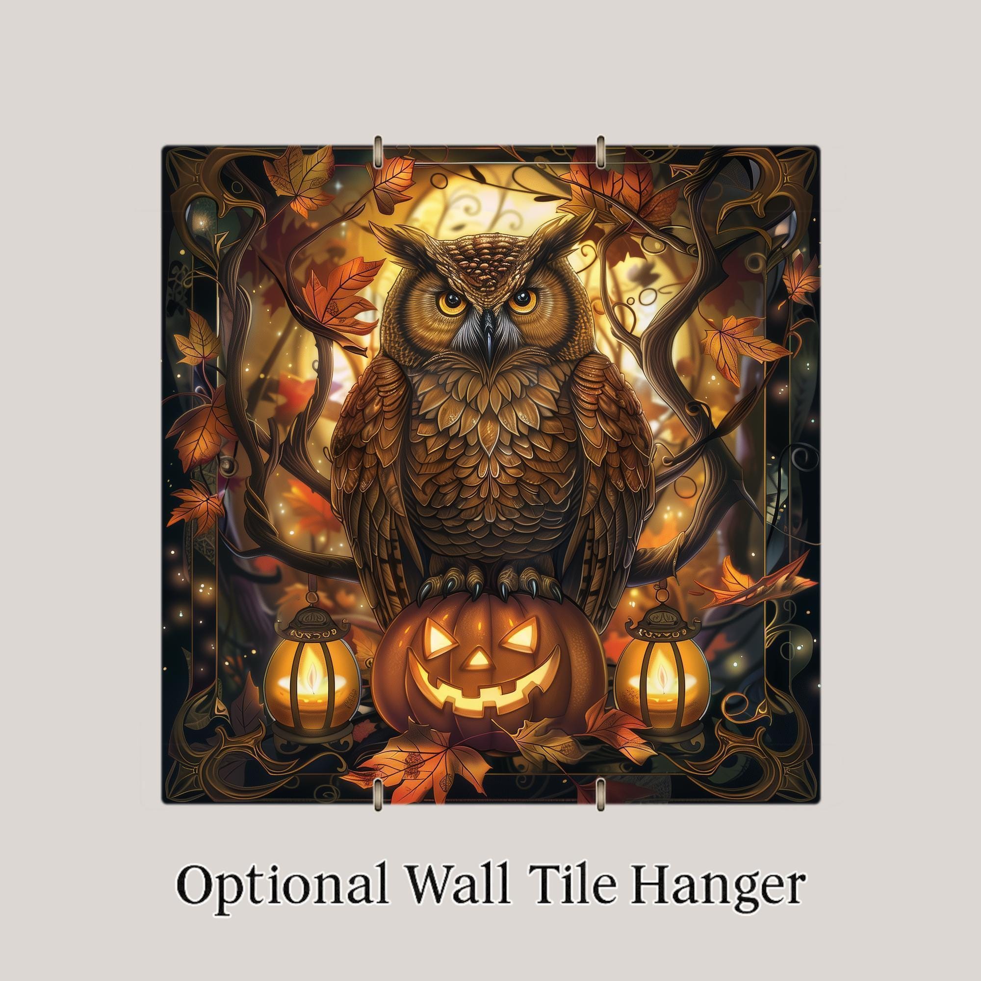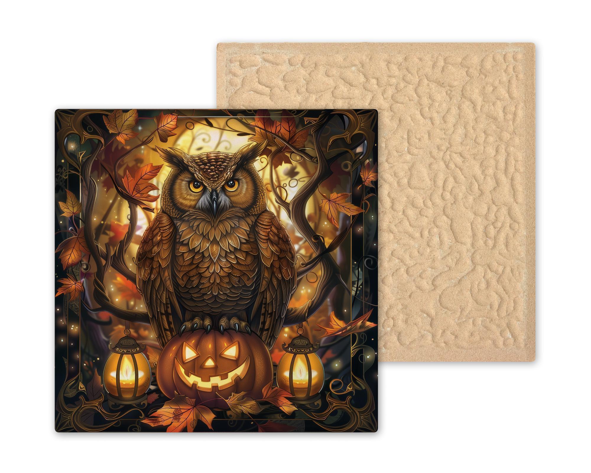 This Halloween owl ceramic tile was designed for the buyer who decorates for fall with intention — not cheap plastic, not generic orange and black, but something that feels handcrafted and genuinely beautiful. The cobalt, amber, and warm gold palette gives this tile the feel of a vintage Halloween illustration rather than a mass-produced seasonal decoration. It is the kind of piece you keep after October is over because it is too good to put away.
