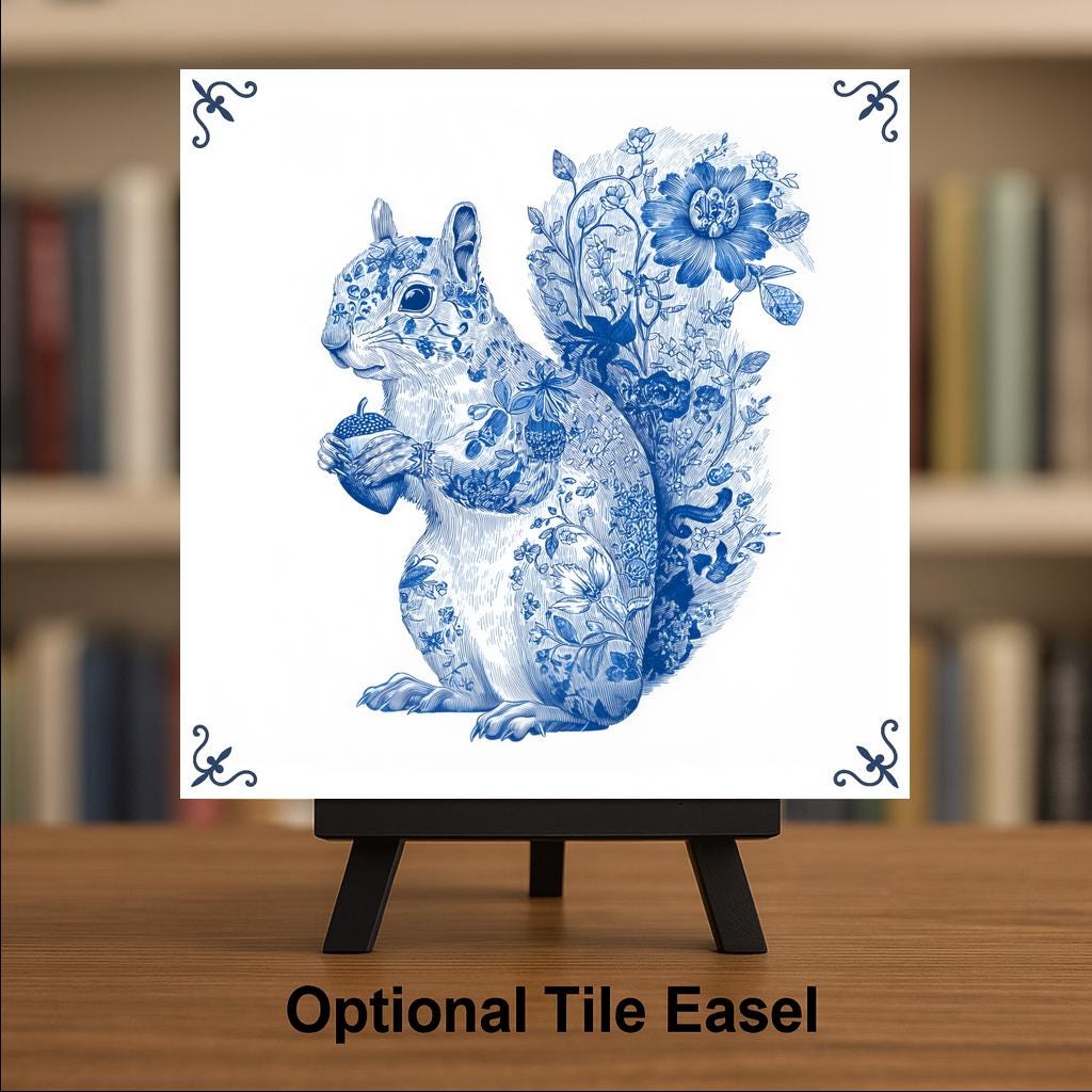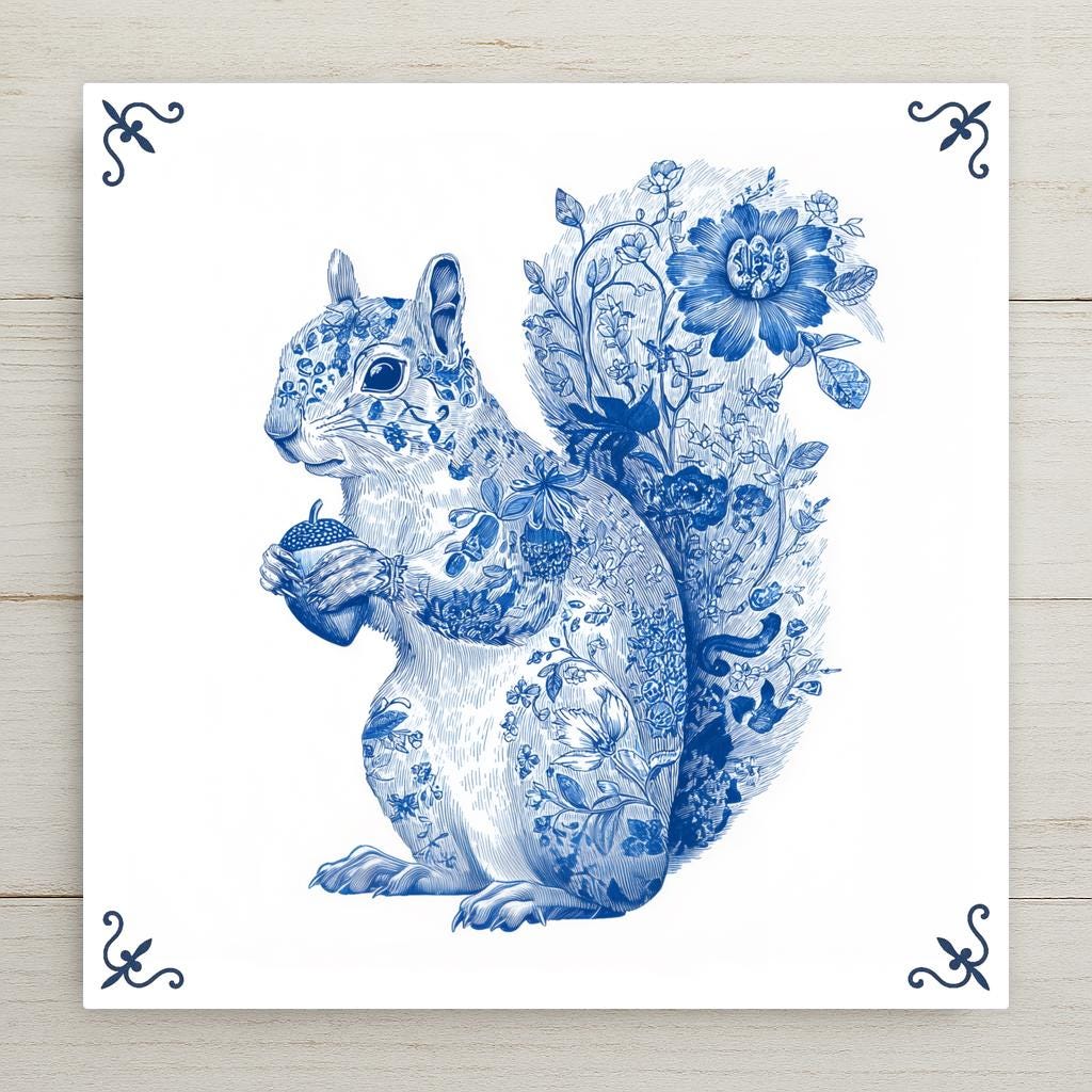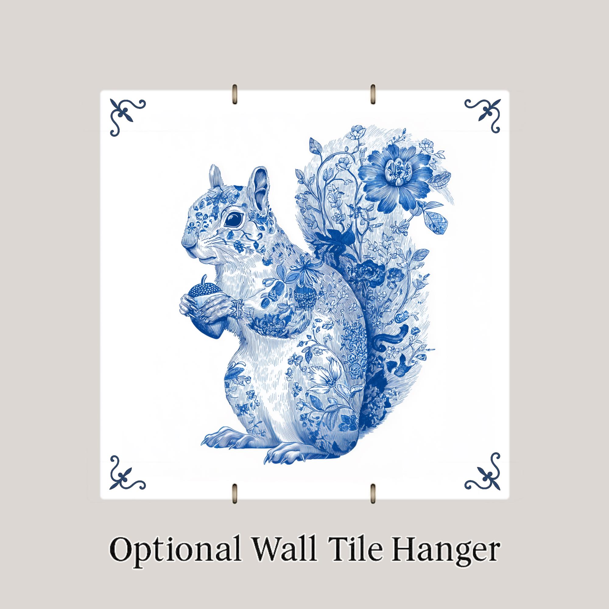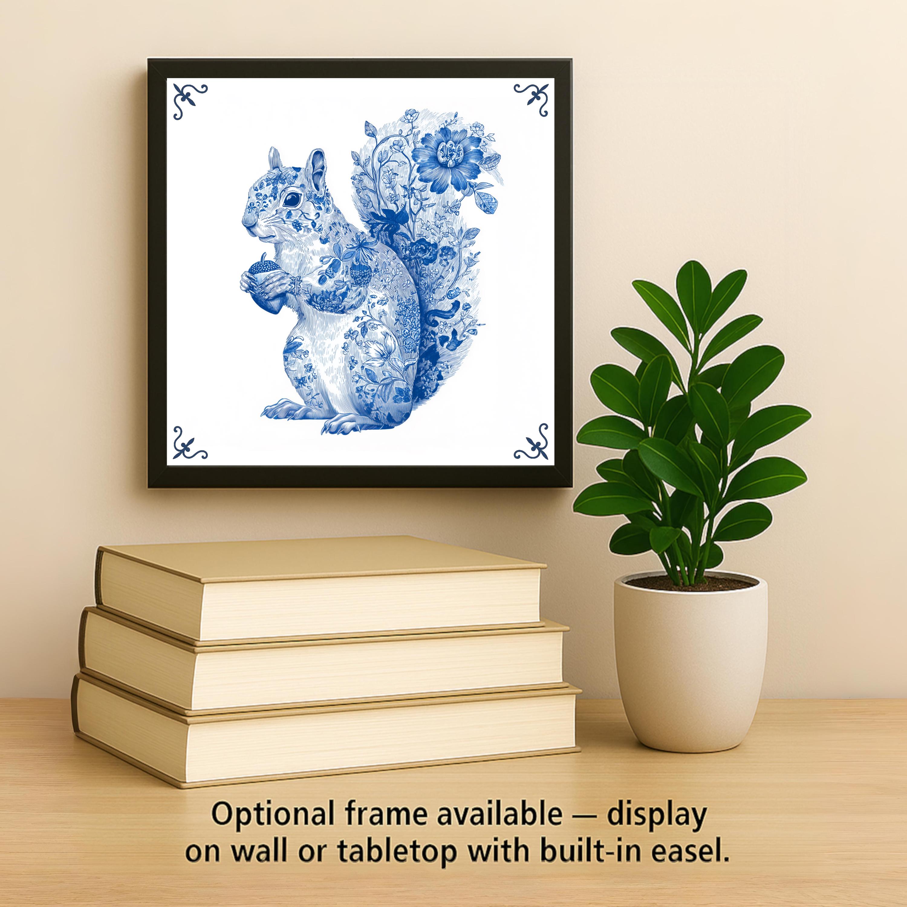 This squirrel tile art combines the refinement of Delftware with the playful spirit of woodland creatures. Floral patterns swirl across the squirrel's form and tail, adding elegance to its acorn-holding pose. The artwork is printed directly onto ceramic with fade-resistant inks, ensuring durability and vibrant color for years to come. Whether for a gift, a woodland-themed gallery wall, or a kitchen nook, this piece offers a dash of blue-and-white beauty. Optional display accessories available.
