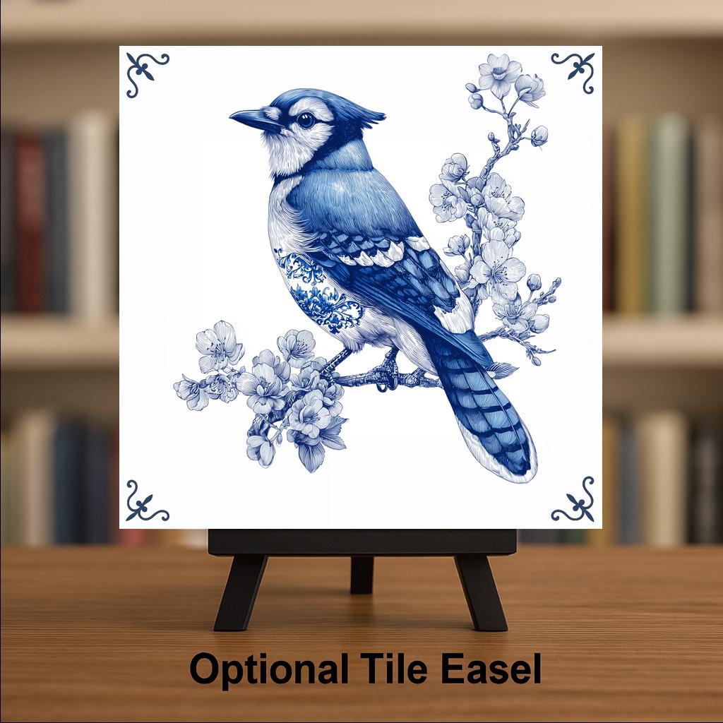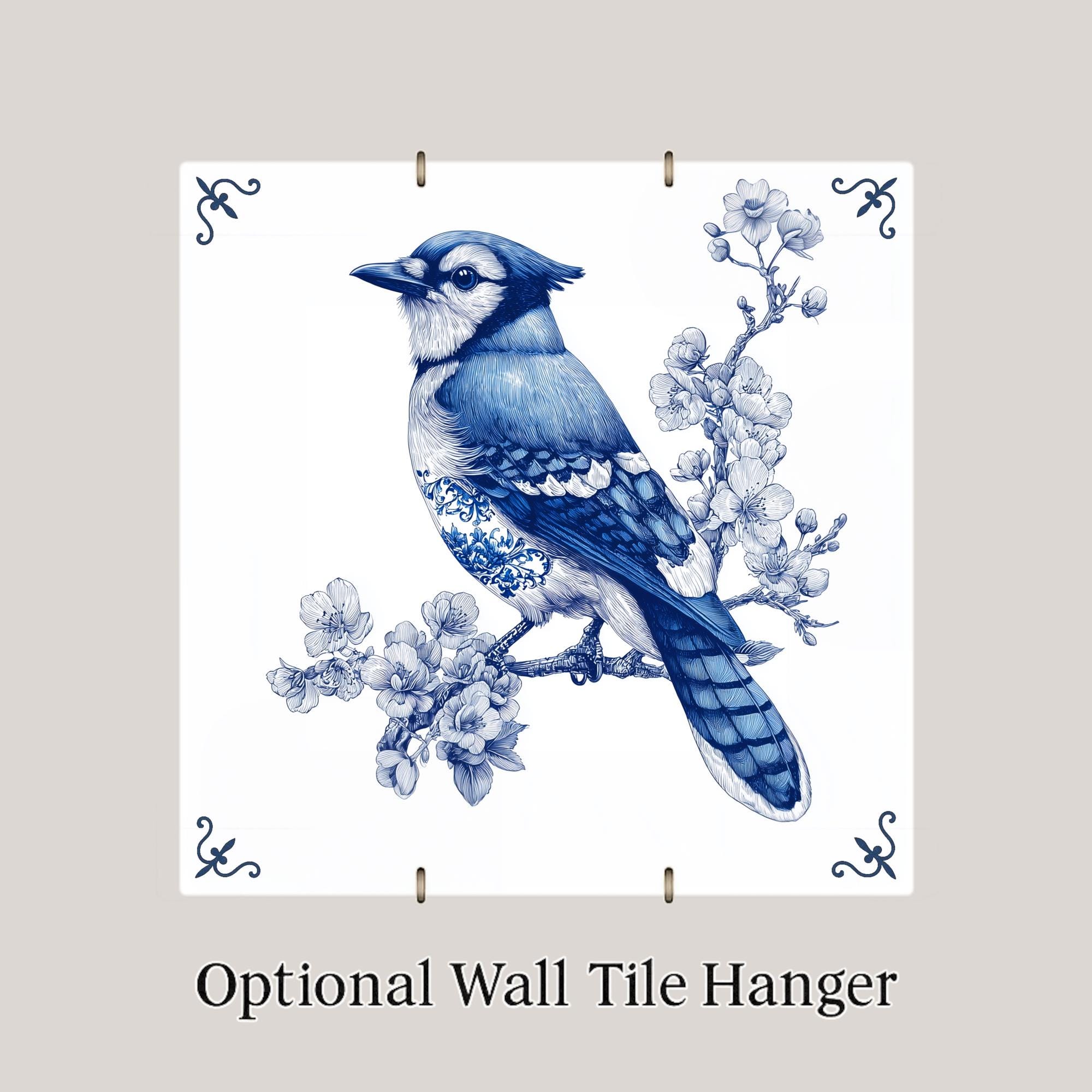 Delft-Inspired Bluejay Ceramic Tile Home Decor: Dutch Blue & White Bird Wall Art with Cherry Blossoms
