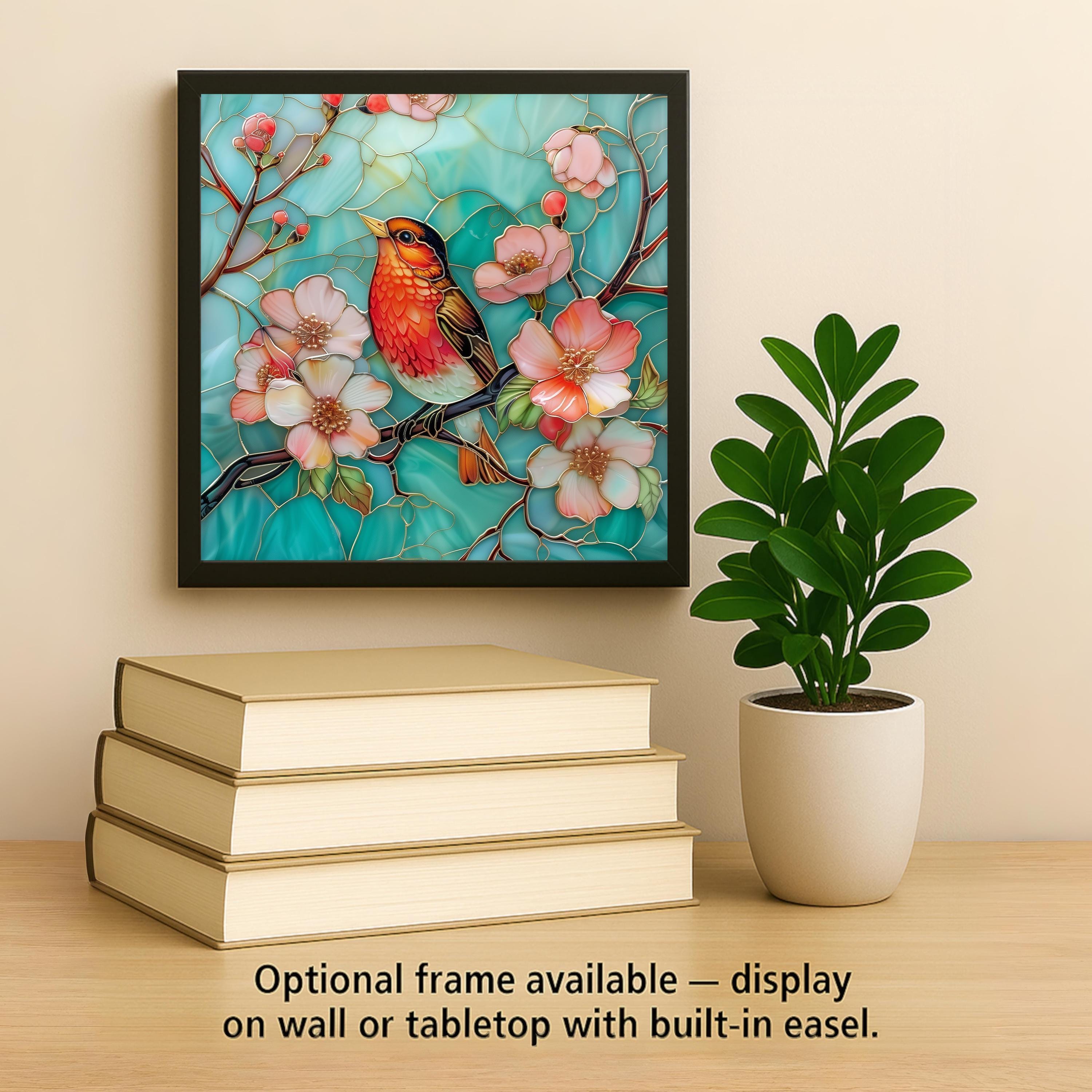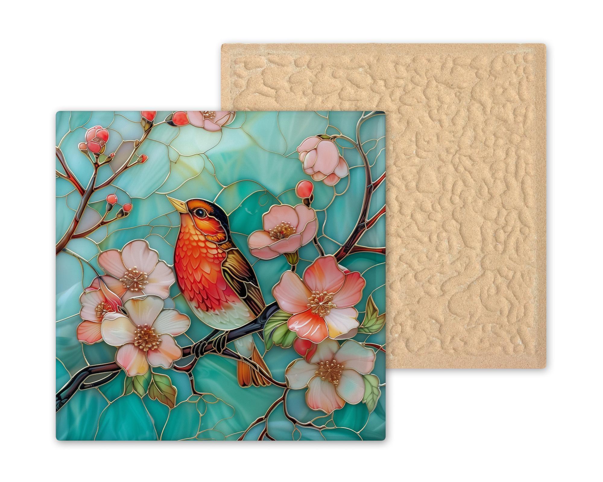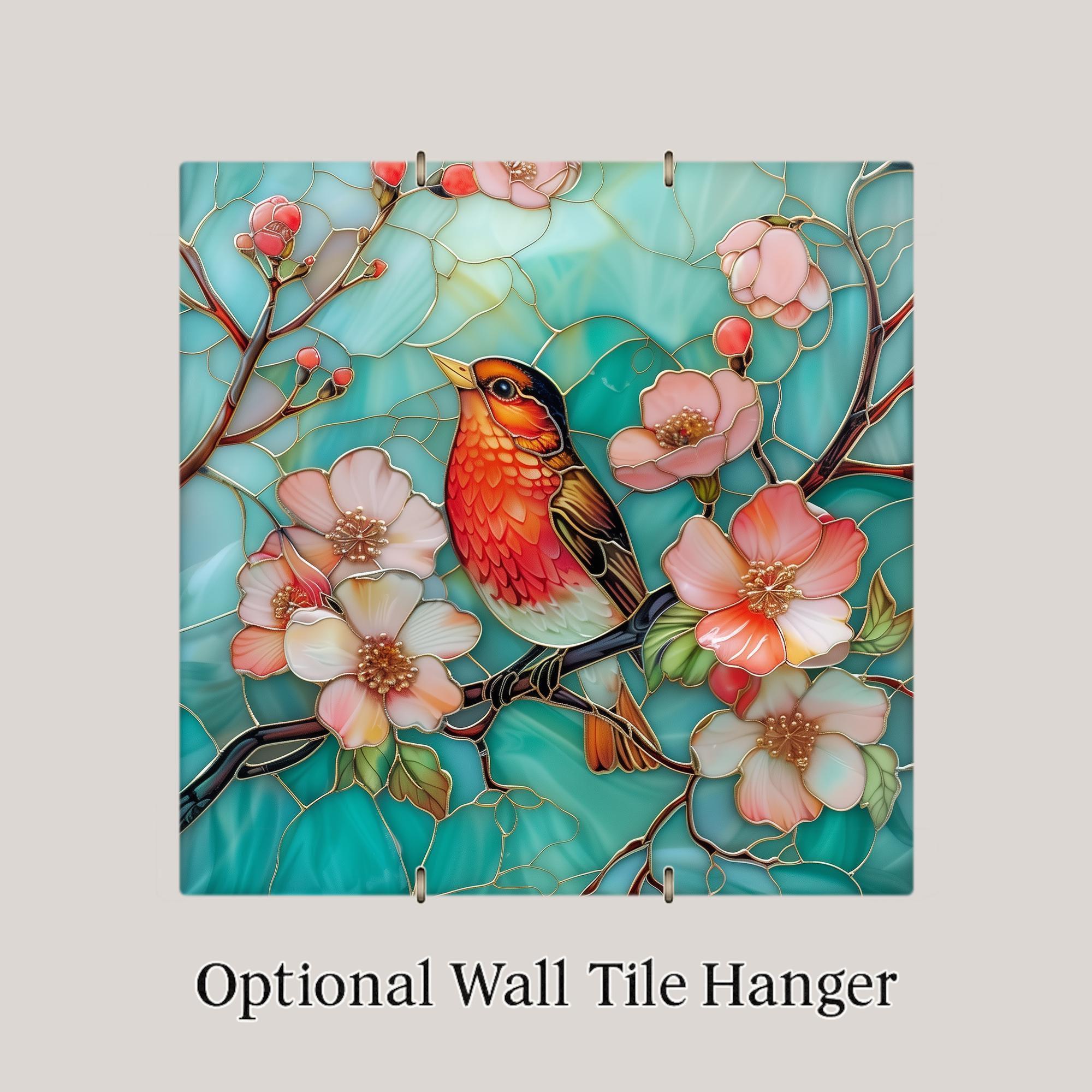 This Red Robin Ceramic Tile features soft cherry blossom blooms and a glowing teal background in a stained glass-inspired design. The robin’s red breast contrasts beautifully with the light pink petals and flowing golden vinework. It’s a graceful celebration of spring, nature, and renewal.