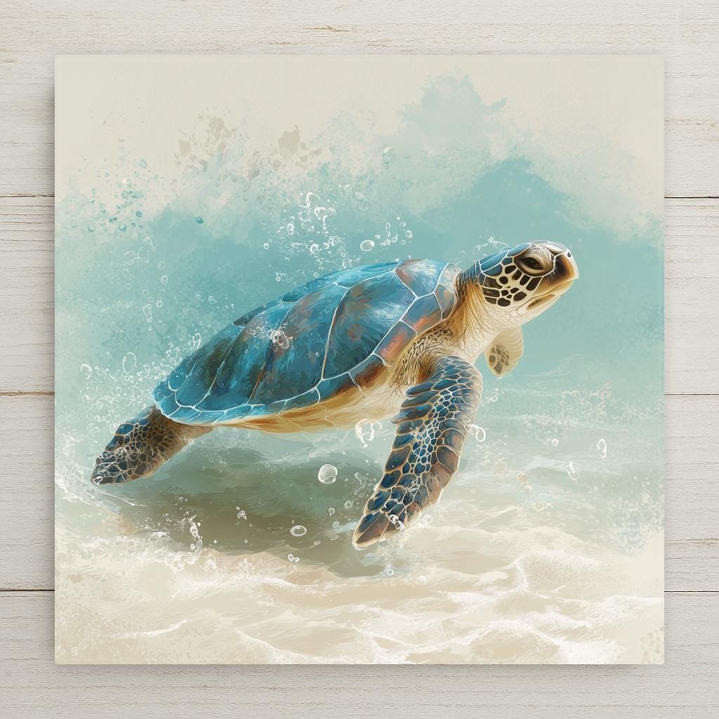 This Sea Turtle Ceramic Tile Art captures the grace of ocean life in soft aqua and teal tones with a warm sand-colored shoreline. The turtle appears mid-swim, surrounded by swirling surf and gentle light reflections, evoking a peaceful beach moment.