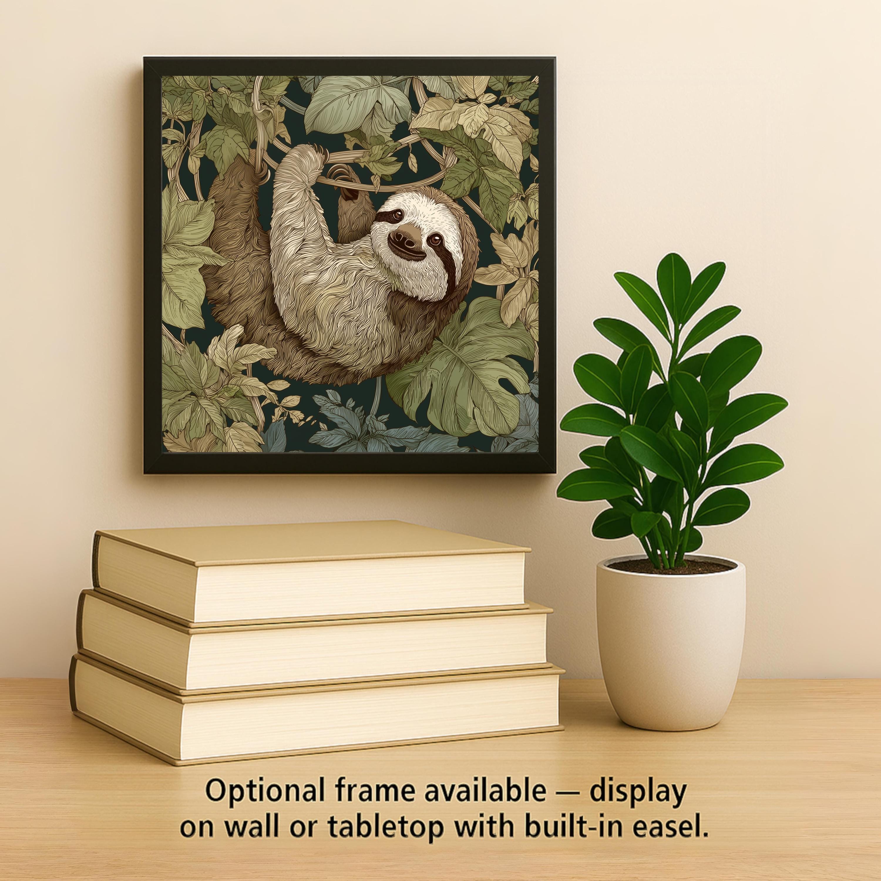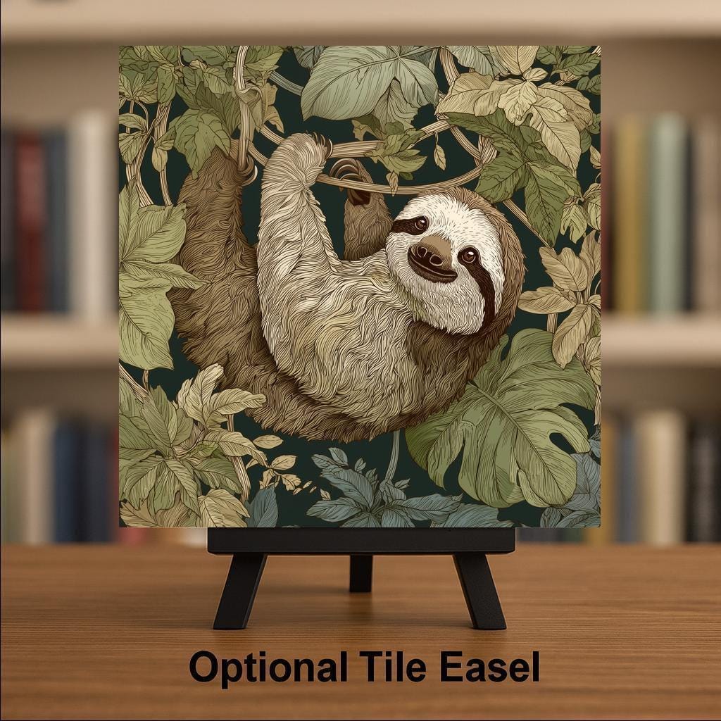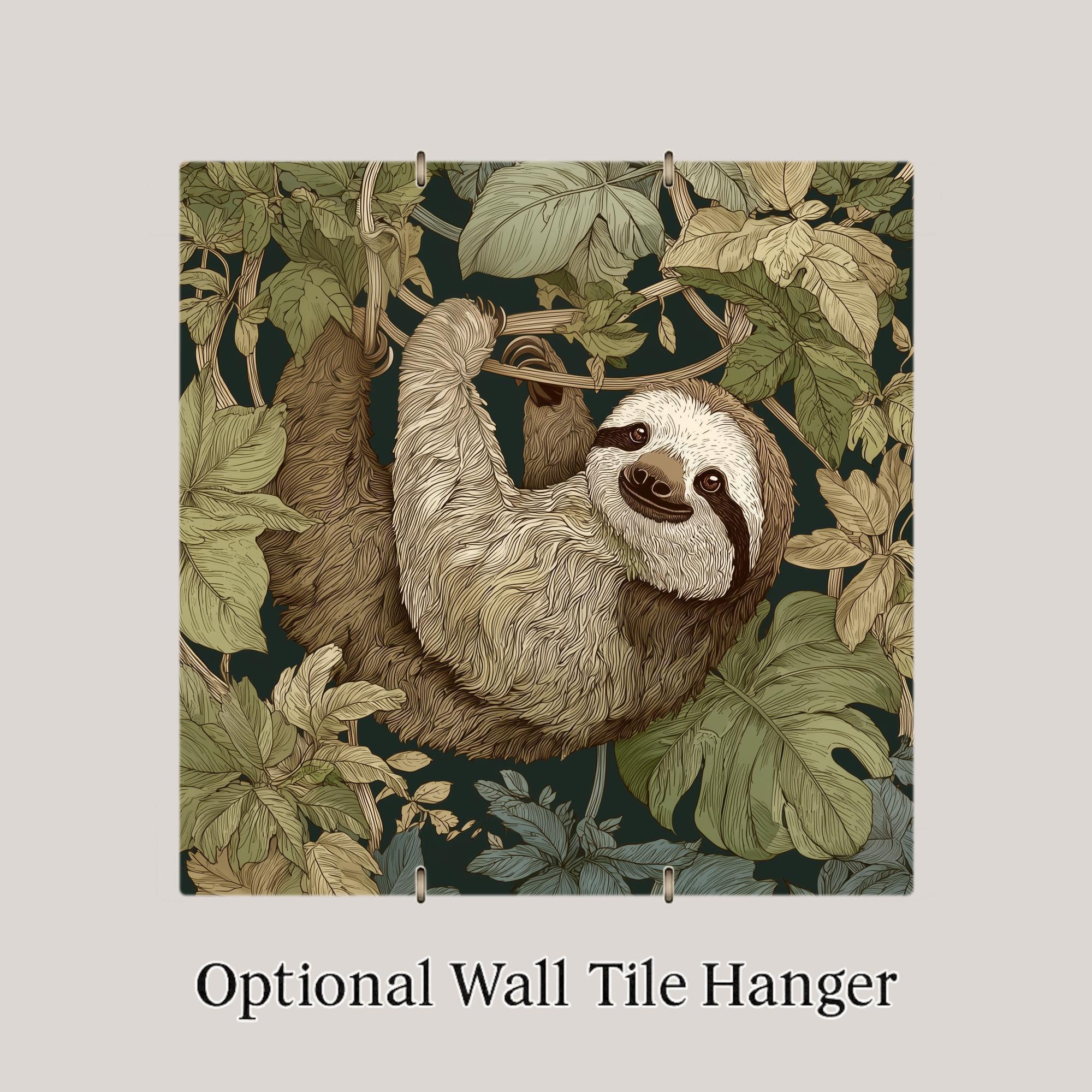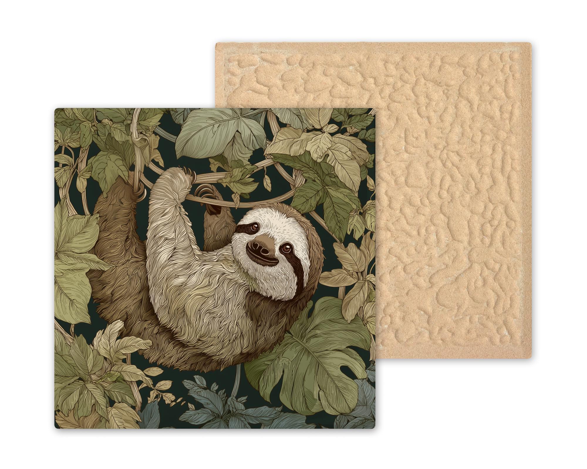 This ceramic tile features a laid-back sloth surrounded by moss green jungle leaves and warm earth brown vines. The intricate linework brings the fur and foliage to life, creating a relaxing and artistic accent for any room.