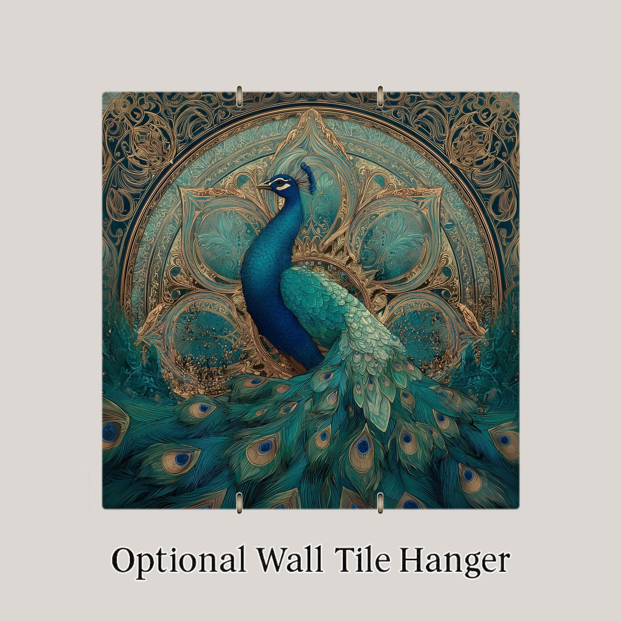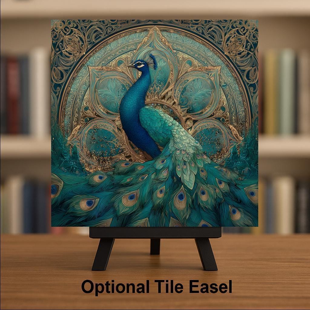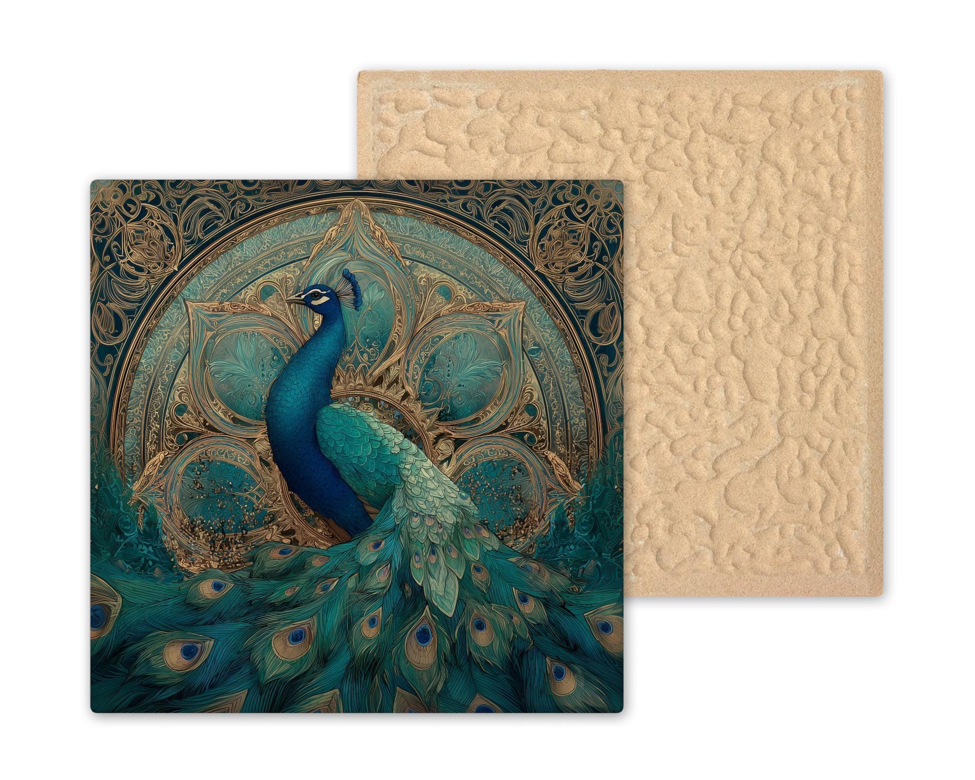 This elegant ceramic tile features a proud peacock with luminous turquoise plumage surrounded by golden mandala accents. The intricate detailing and deep, layered color give the illusion of depth and movement, making this piece perfect for anyone who loves luxury-inspired art and nature themes.