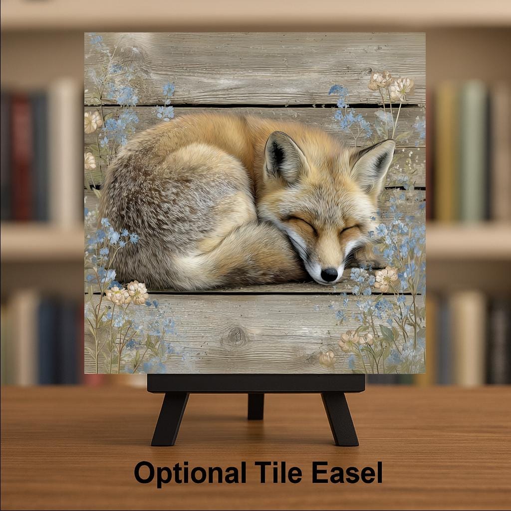 This ceramic art tile features a curled-up fox in warm tan fur, framed by delicate blue wildflowers and weathered wood planks. The peaceful expression and natural textures give the tile a calming, homestead feel that’s perfect for rustic, woodland, or country-themed interiors.