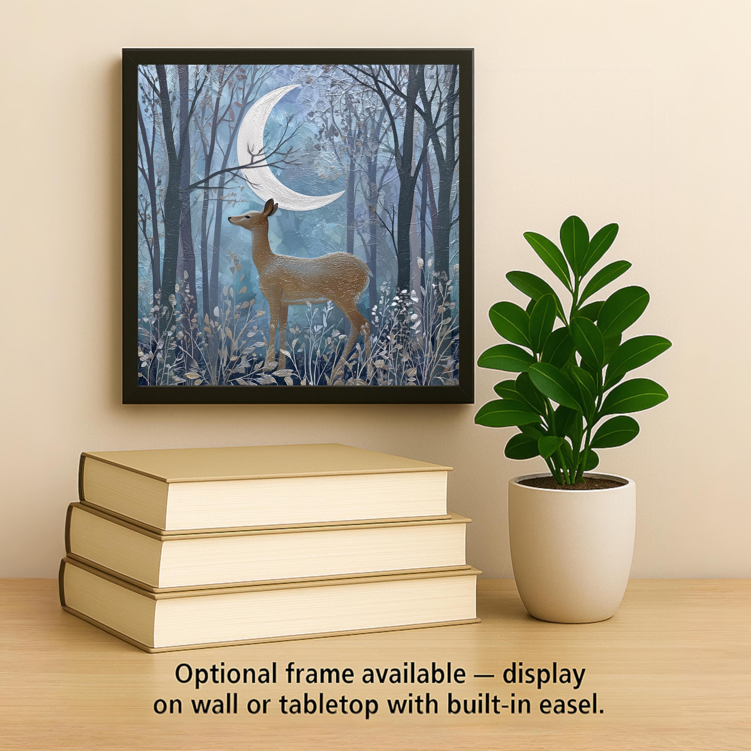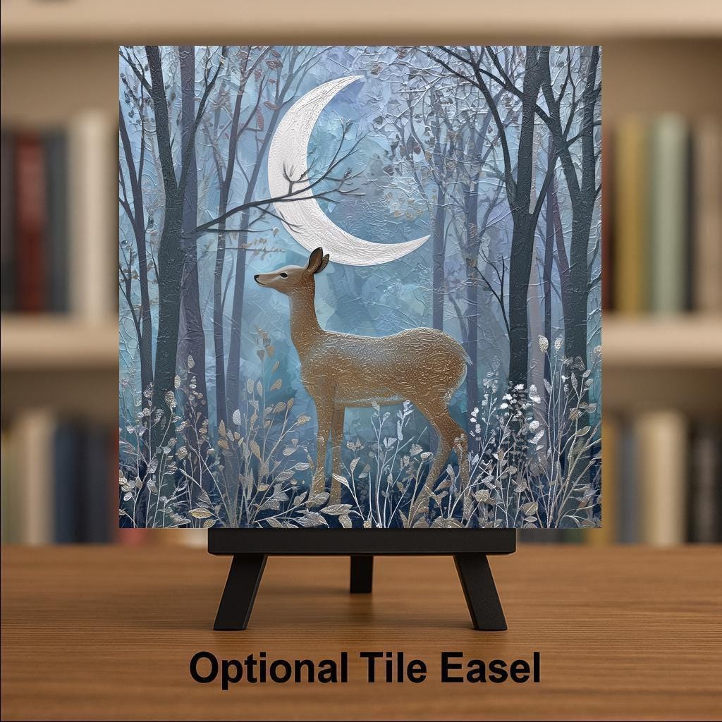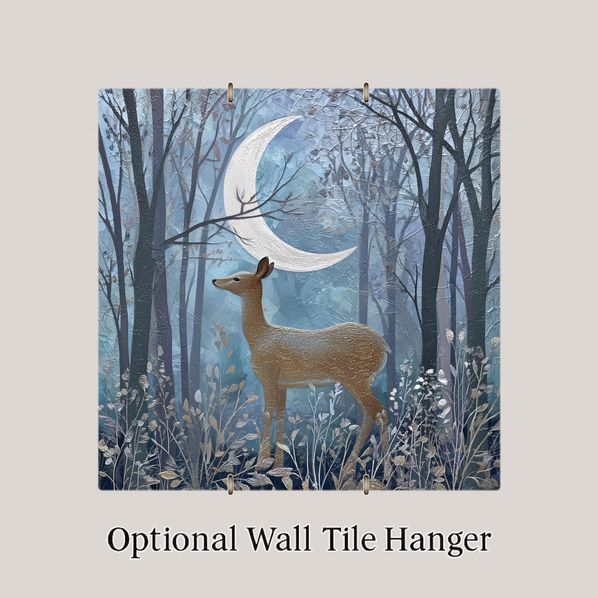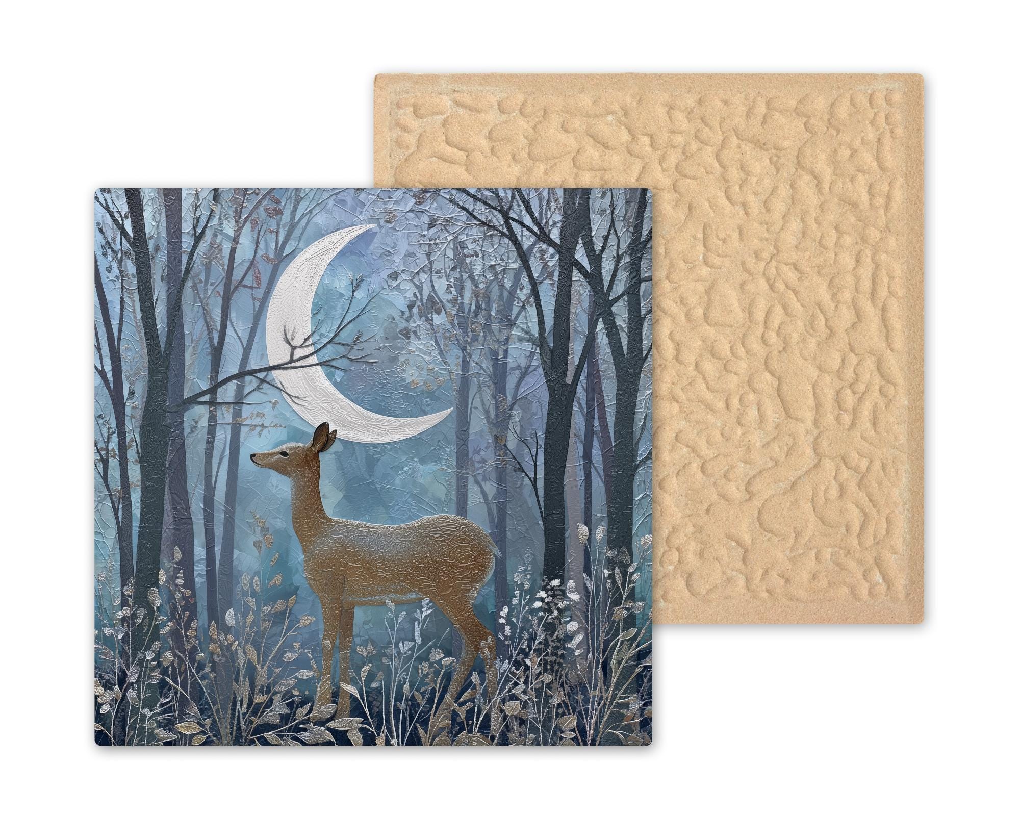 This serene ceramic tile features a tan deer standing beneath a silver crescent moon in a forest of cool blue trees. The background glows with layered twilight textures and soft foliage, capturing the quiet stillness of a moonlit night.
