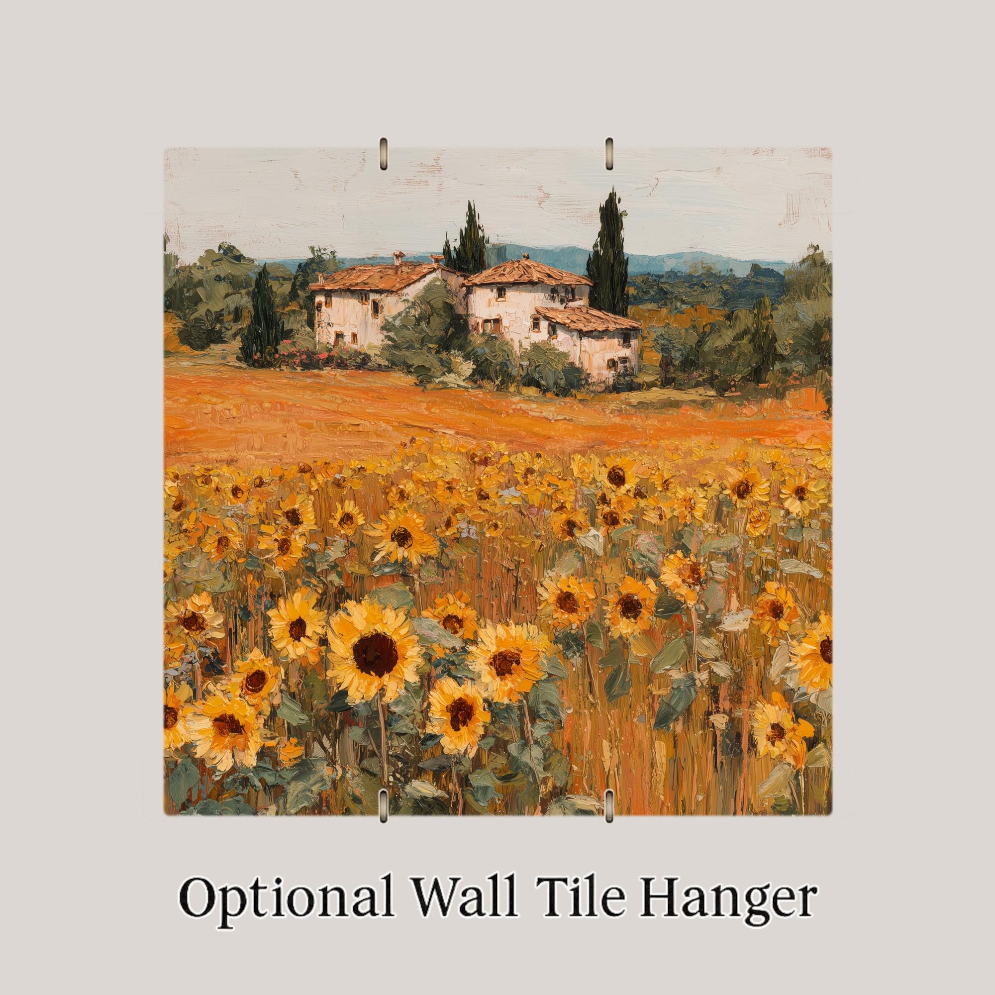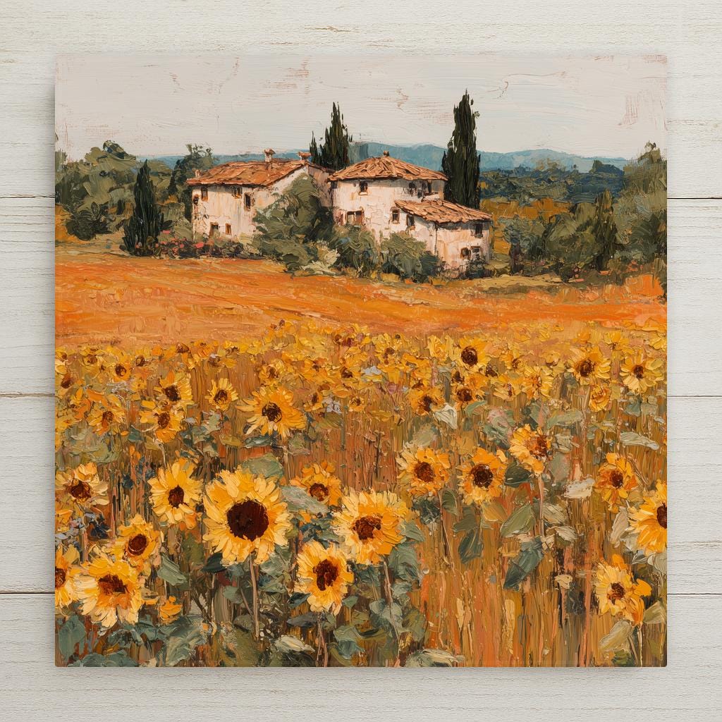 This ceramic tile features a vibrant sunflower field painted in warm yellow and orange hues, with a Tuscan-style farmhouse in the distance. The textured brushwork gives it the feel of a traditional oil painting while offering the durability and practicality of ceramic.