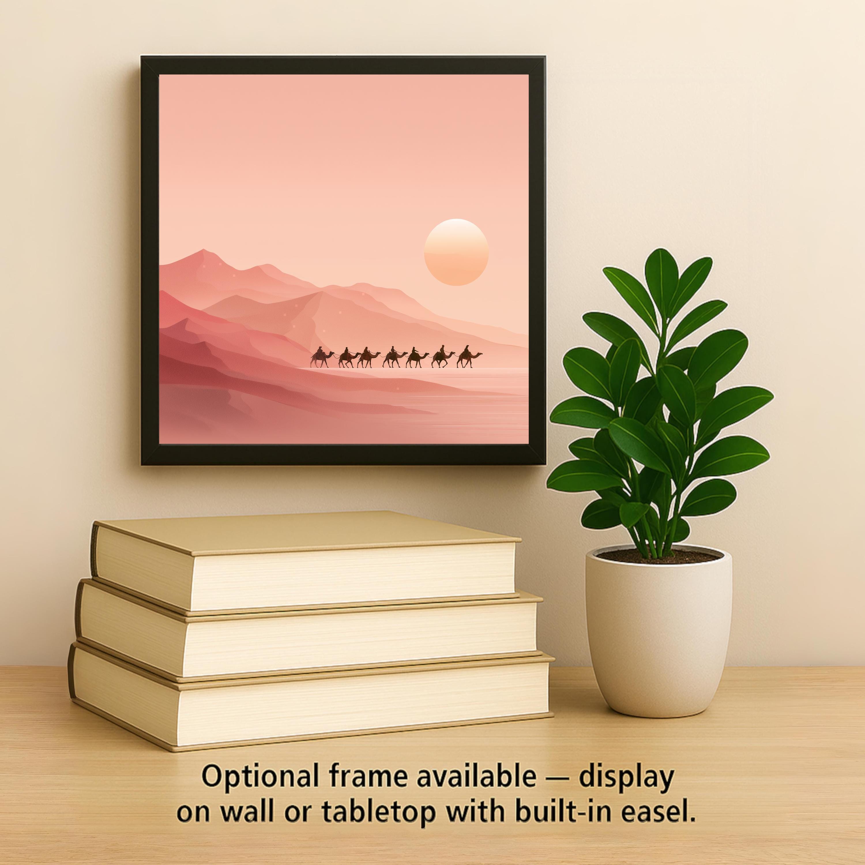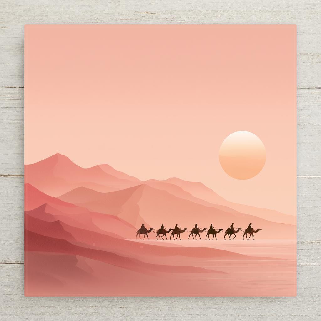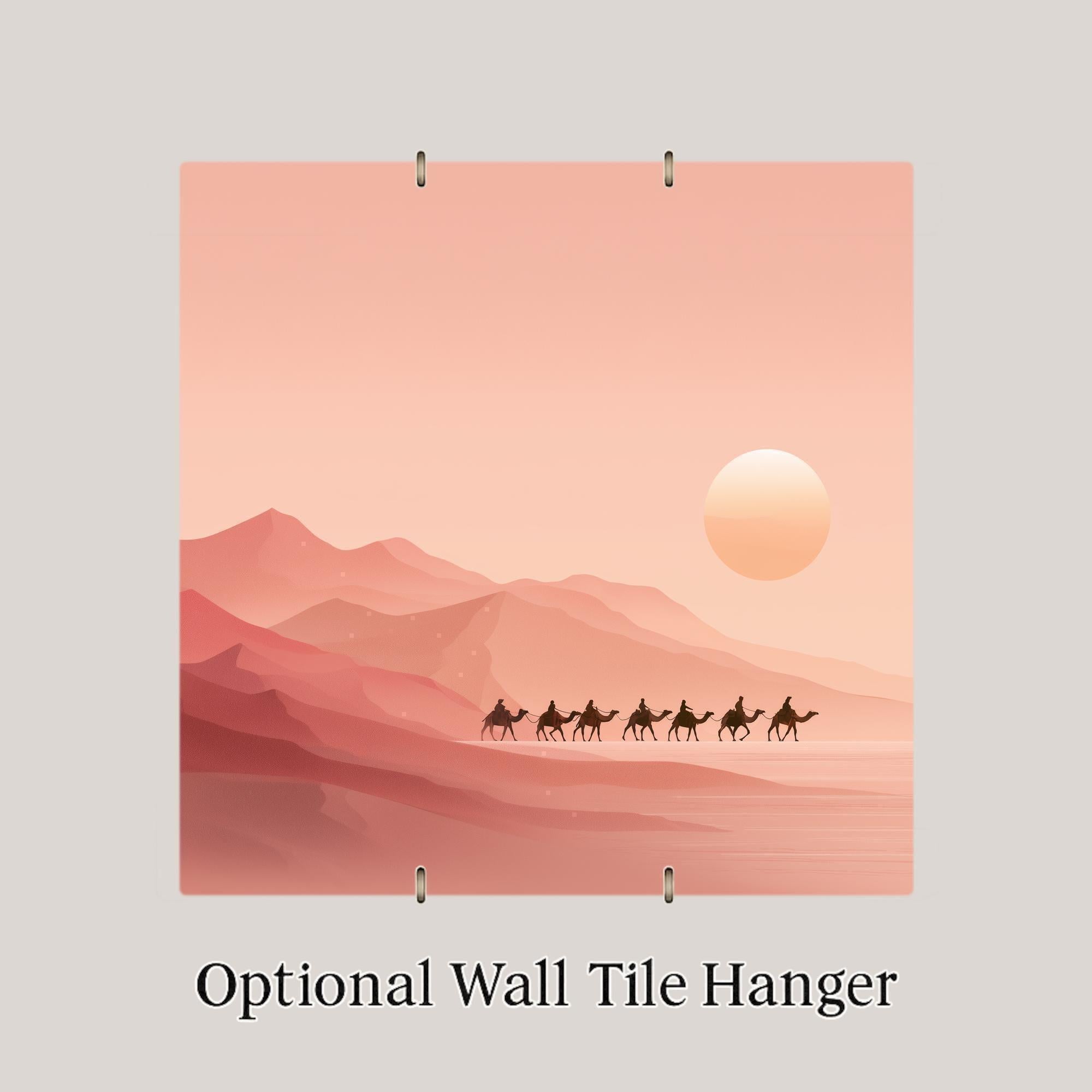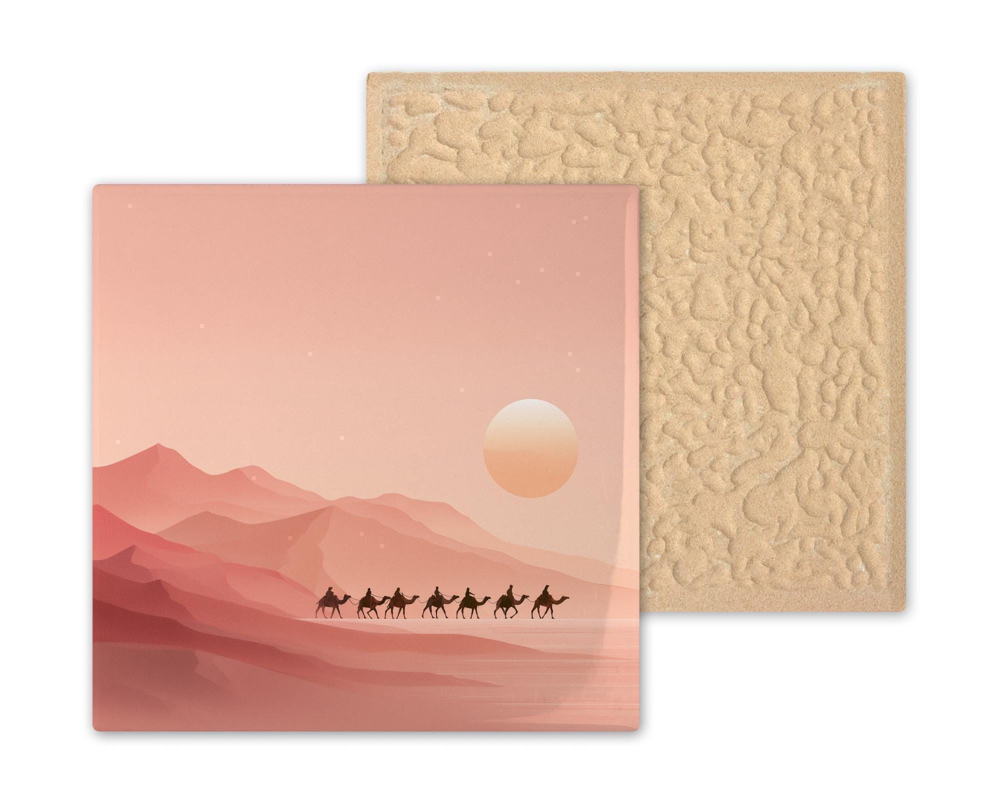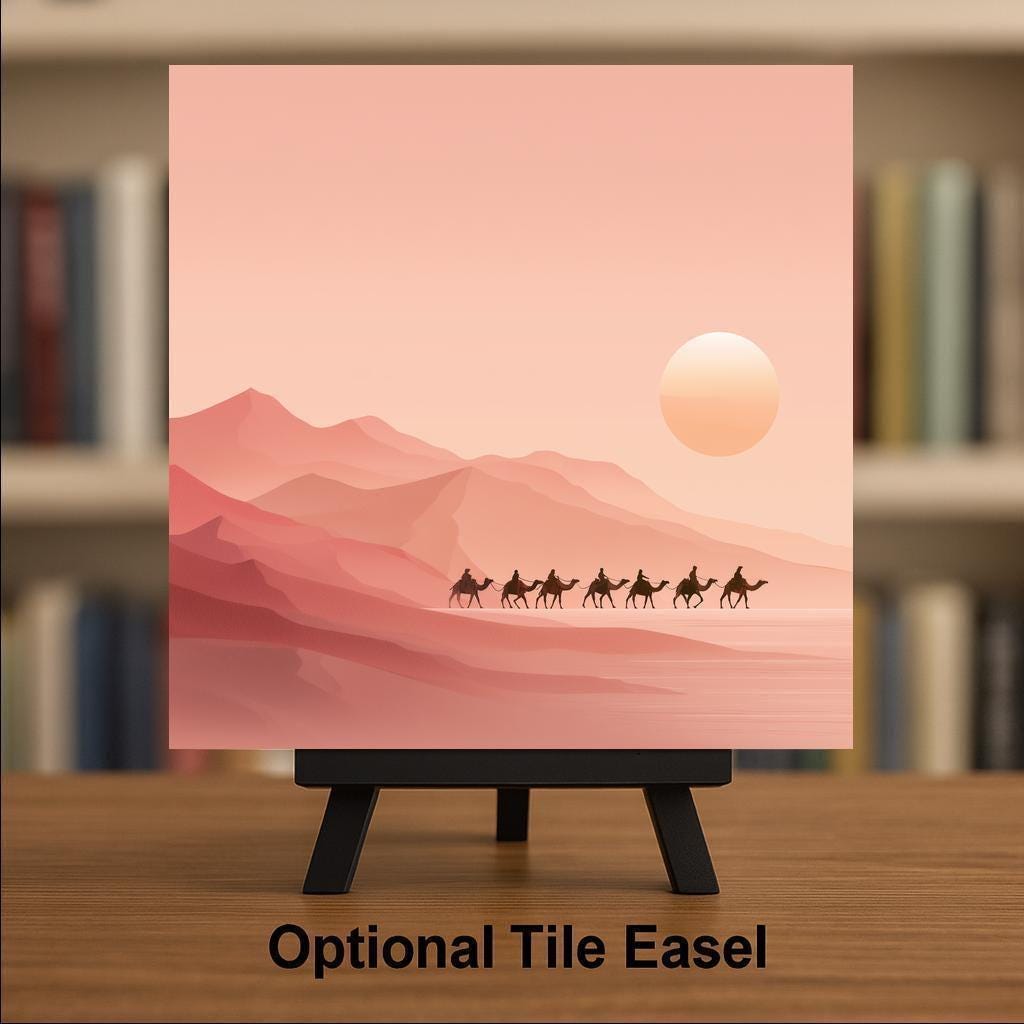 This ceramic tile features a peaceful desert caravan scene in muted peach and rose hues. The simple silhouettes of camels and riders crossing the sunlit dunes offer a moment of stillness and wanderlust. The warm tones create a soft ambiance that complements natural wood, rattan, or minimalist decor.