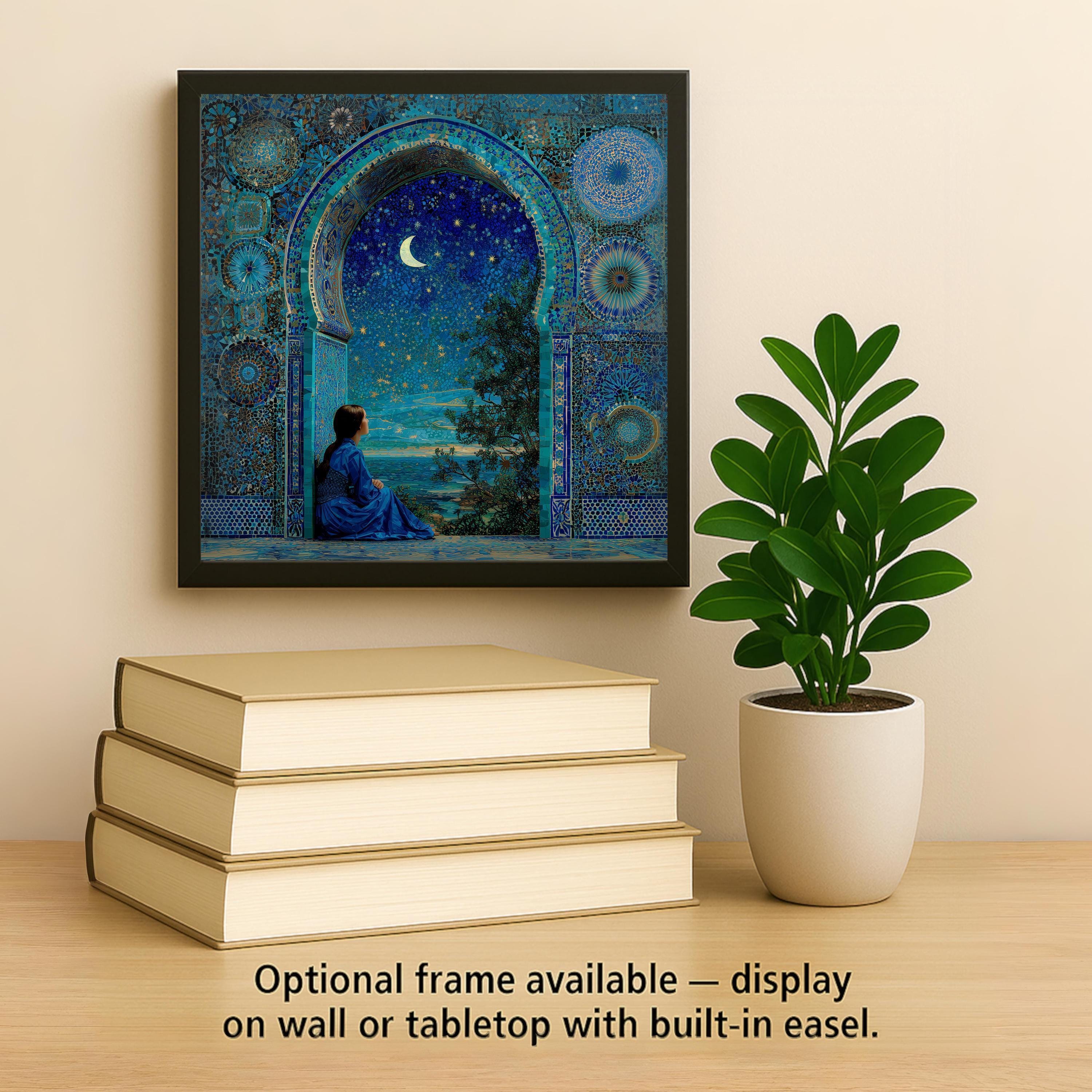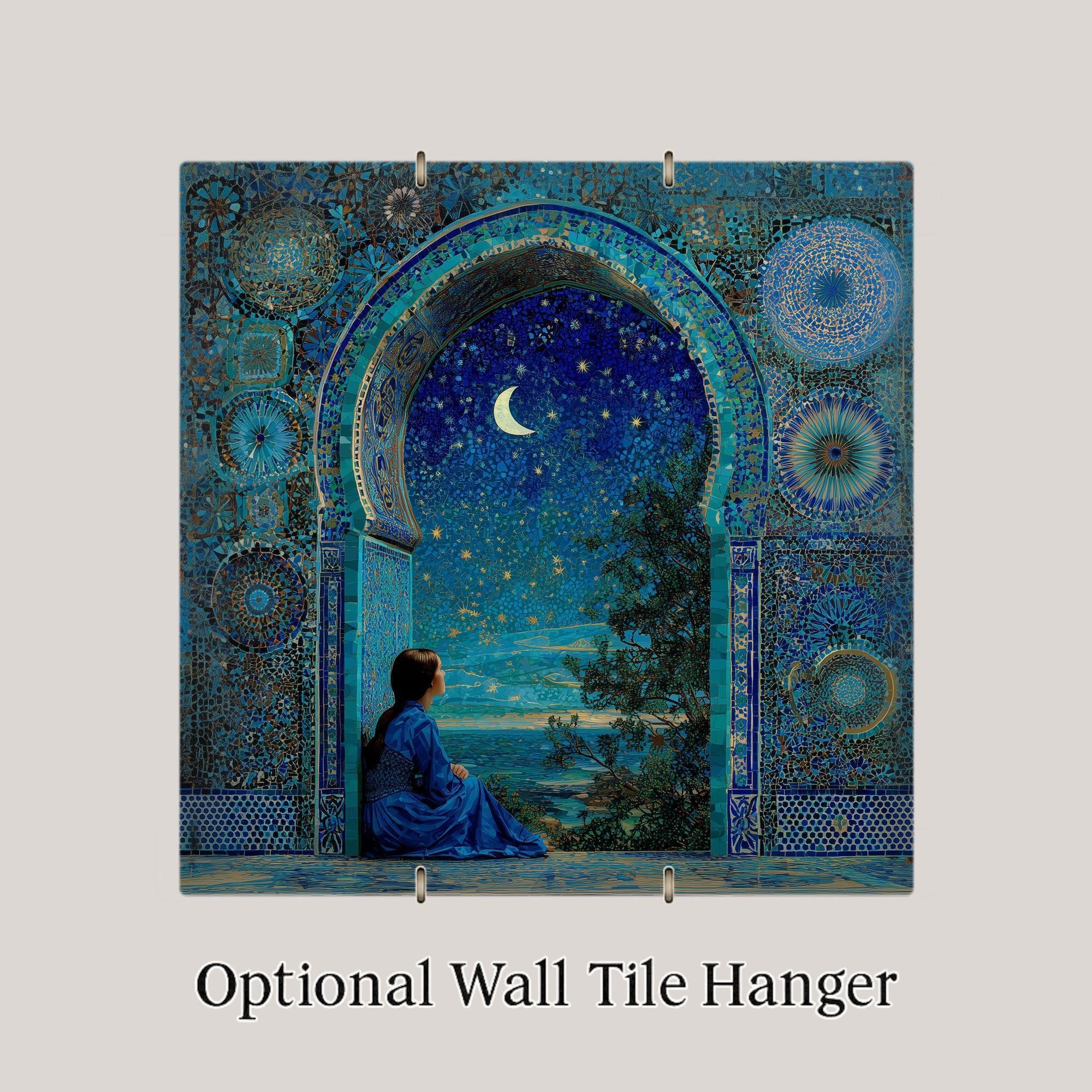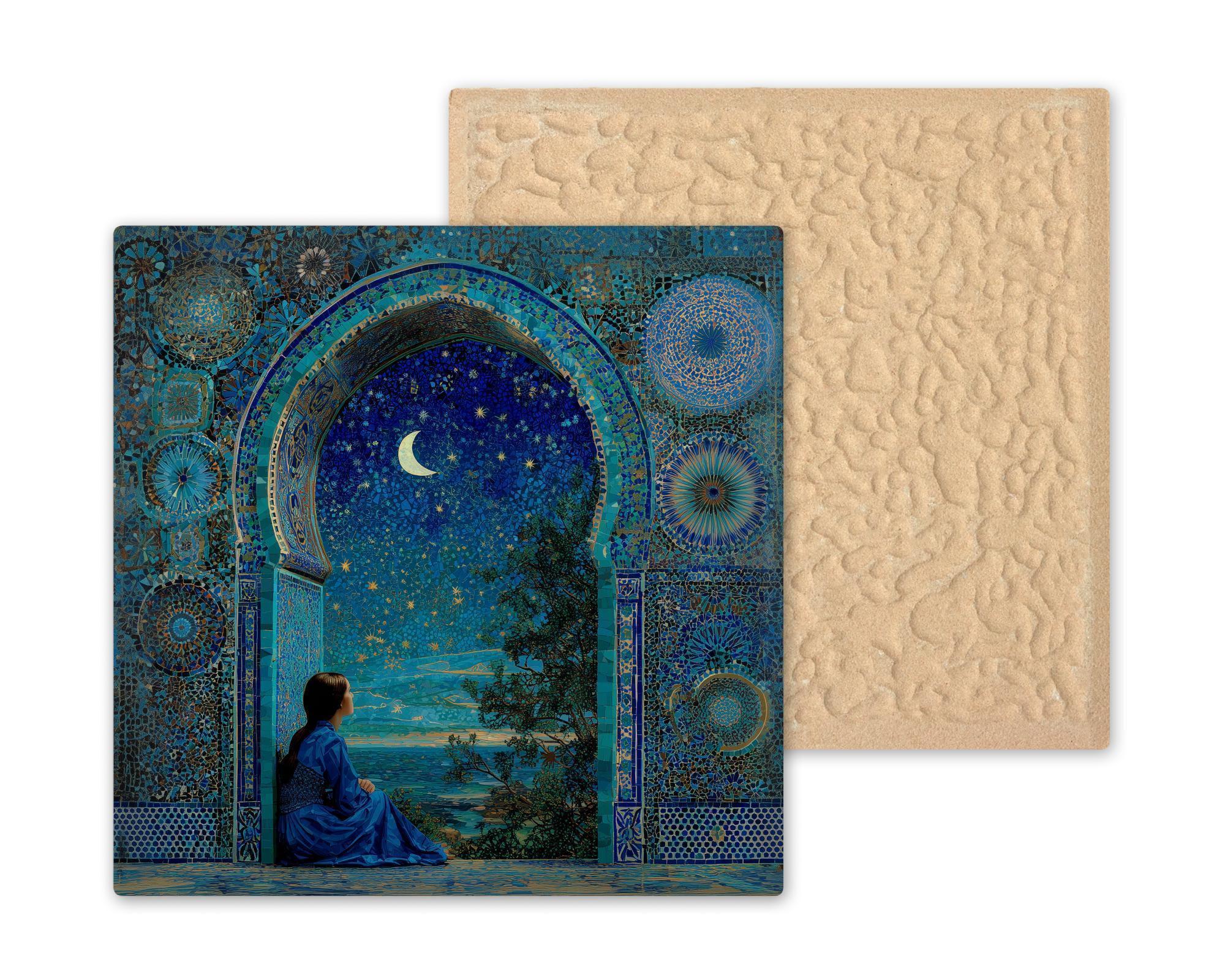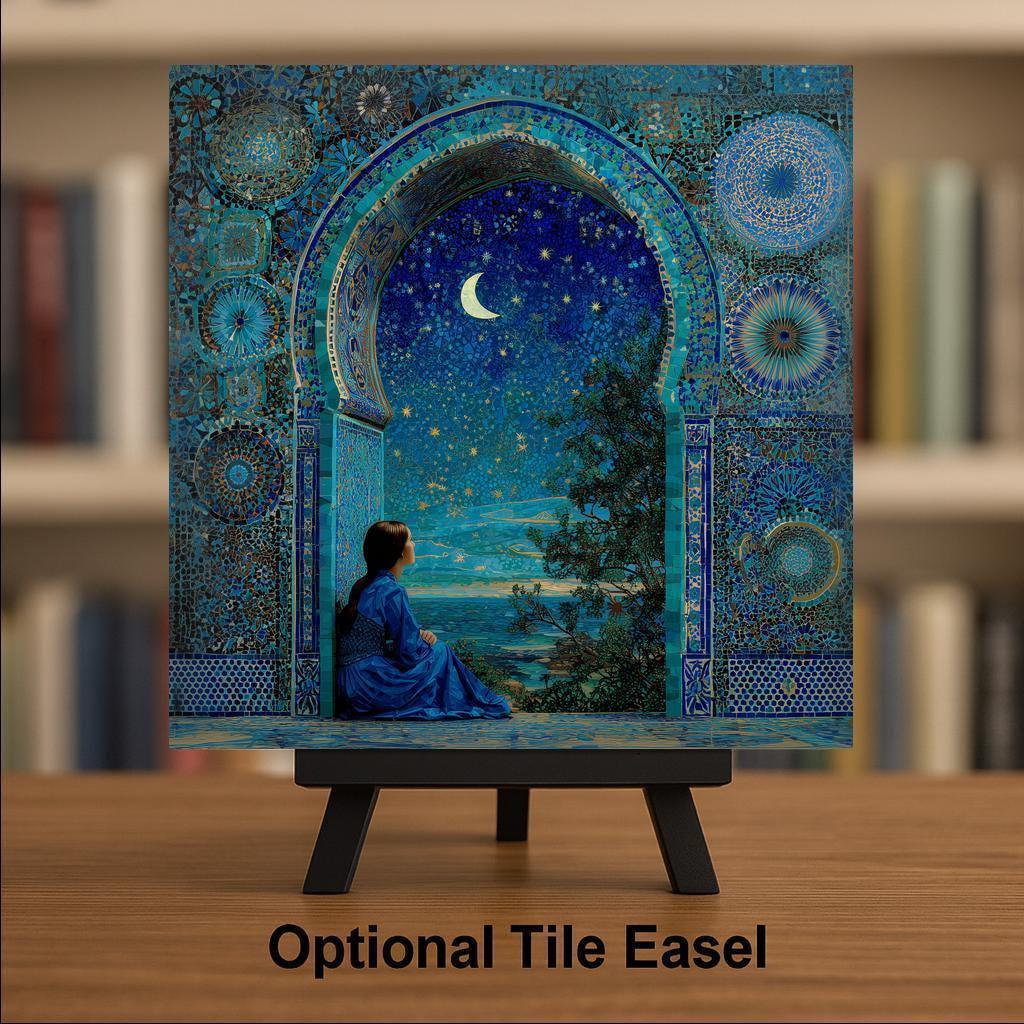 This enchanting ceramic tile features a star-filled sky in shimmering navy and turquoise hues, framed by ornate mosaic tilework. A young woman sits in quiet reflection beneath a crescent moon, capturing the magic of stargazing and stillness.