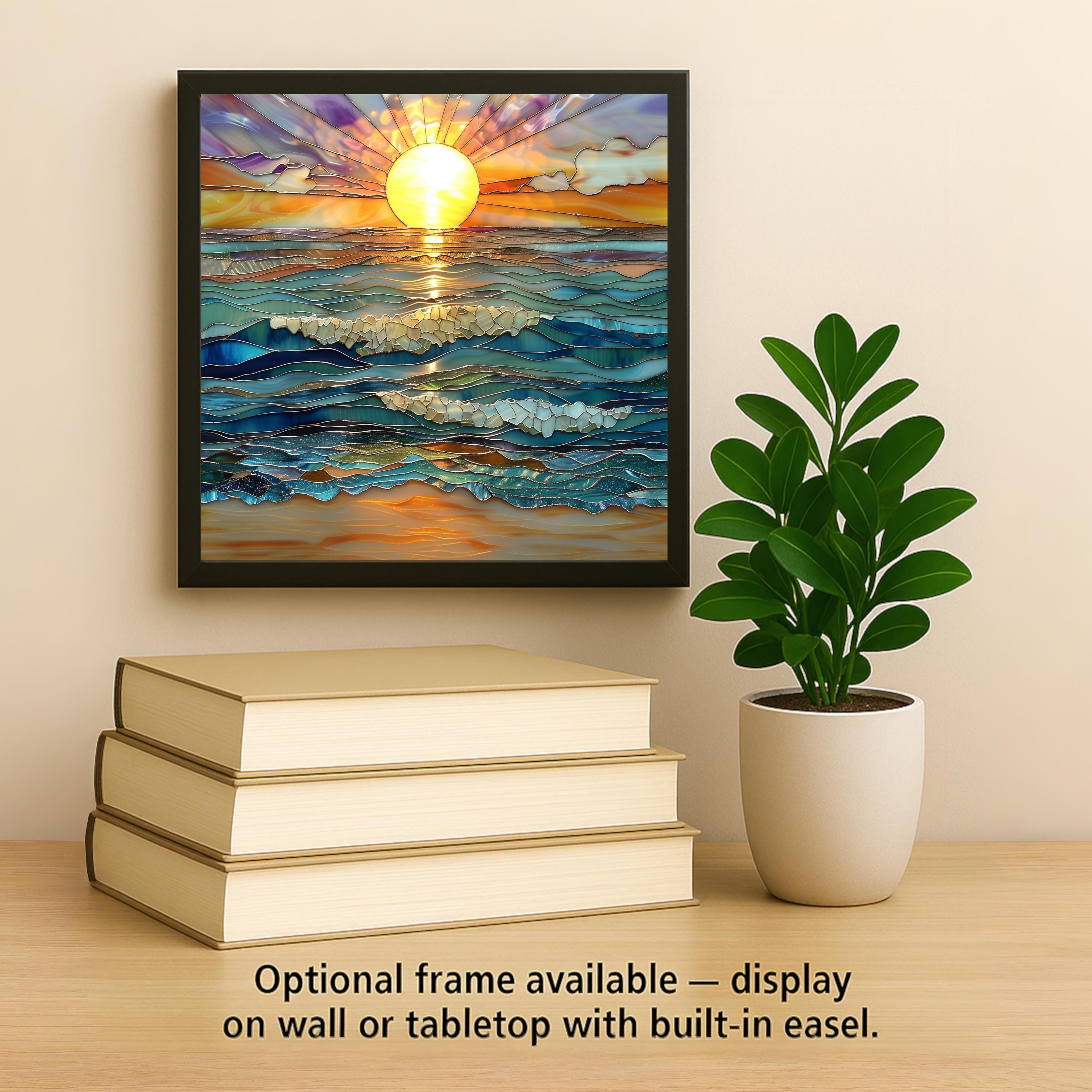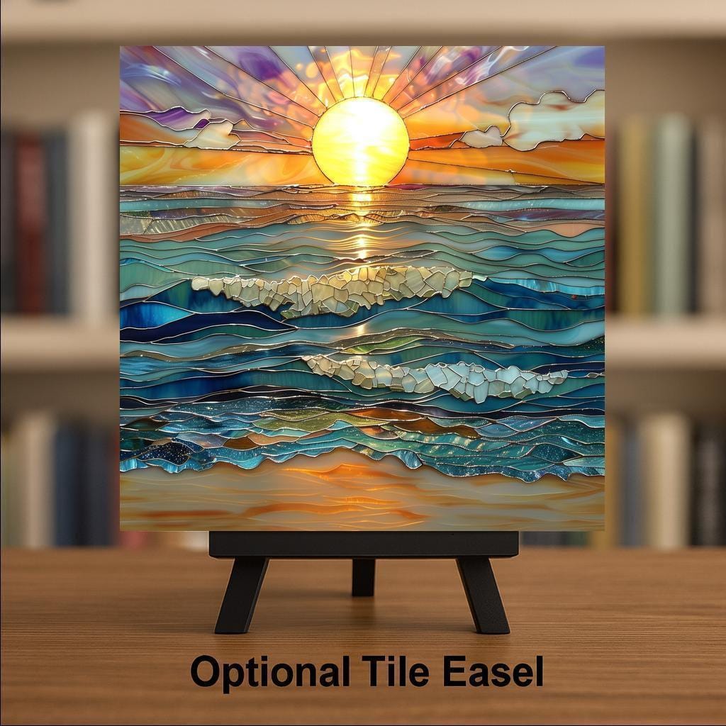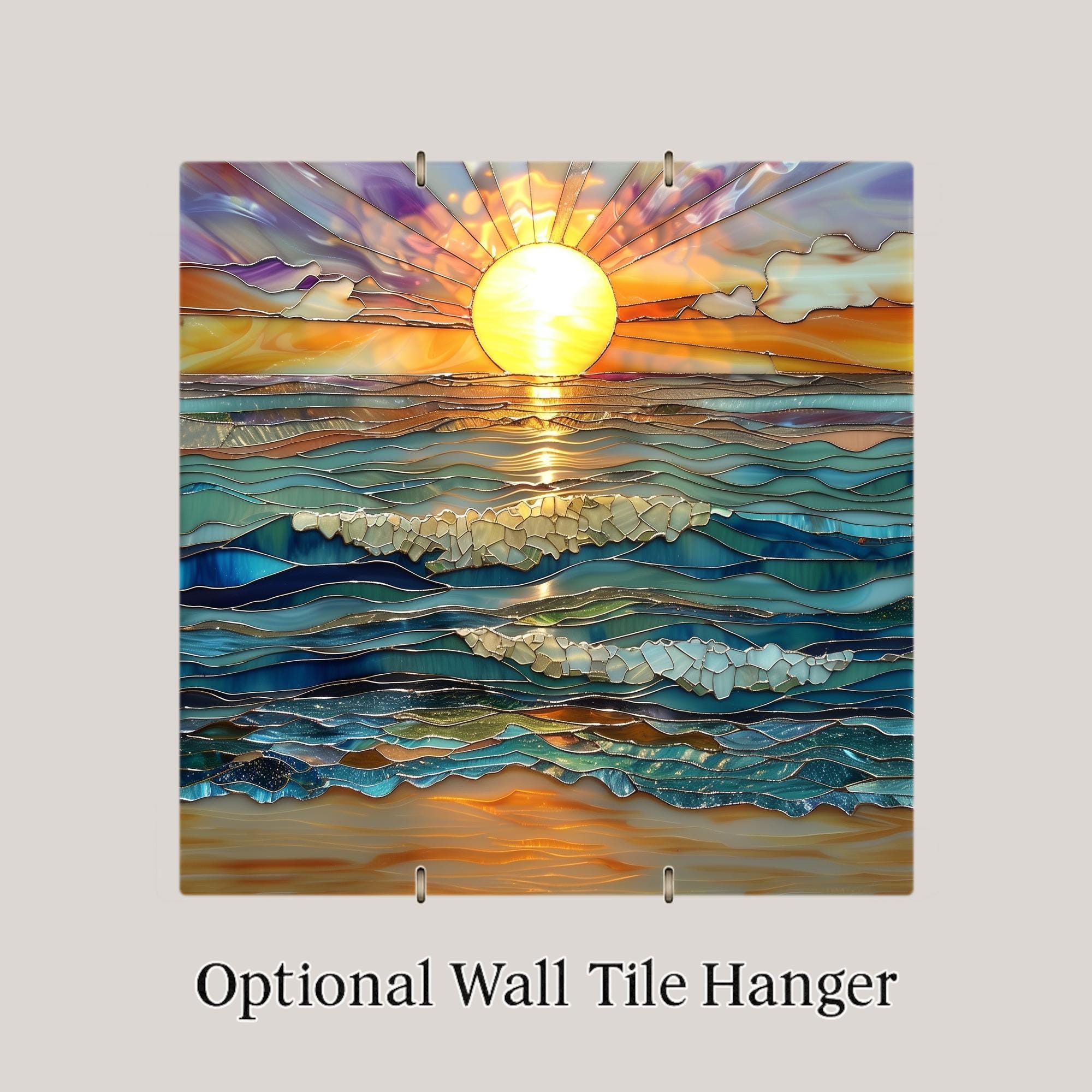 This ceramic tile features stylized ocean waves under a radiant golden sunset. Aqua blues, sparkling whites, and molten gold glass-effect textures create the illusion of stained glass, capturing the sun’s final burst of light over the sea.