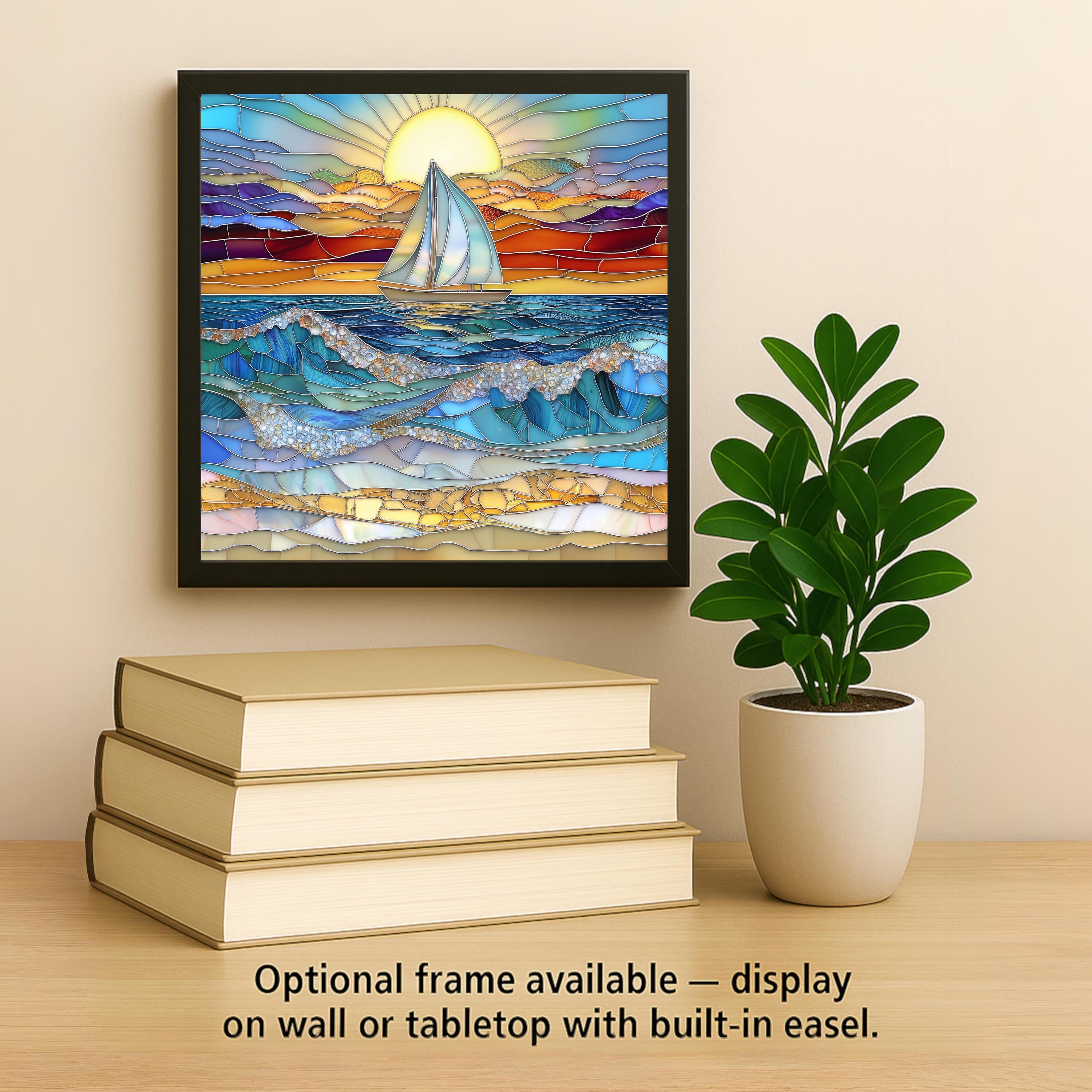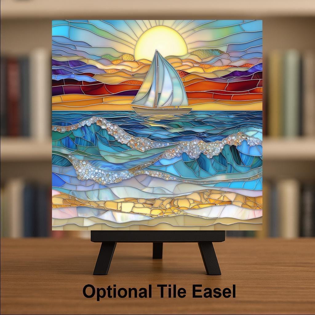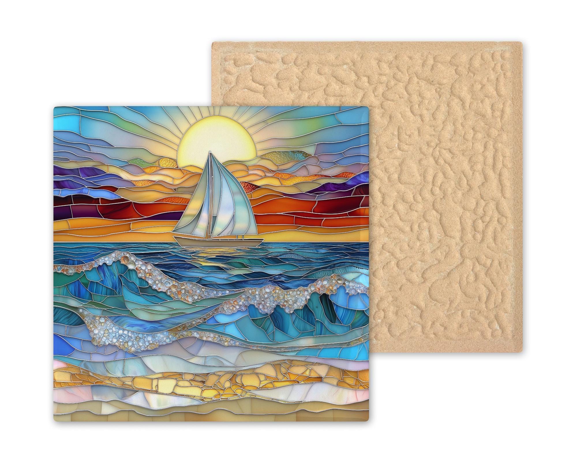 This Sunset Ocean Waves Sailboat Ceramic Tile Art glows with nautical charm. Featuring a sailboat drifting across a deep blue ocean beneath a brilliant golden sunset, it evokes the calm and beauty of a summer evening by the sea. The stained glass-style artwork is highly detailed, with flowing waves made of rich aqua, sapphire, and teal tones topped with textured white foam. In the foreground, gold and tan mosaic-style stones form a radiant beach shoreline, completing the vibrant coastal scene.