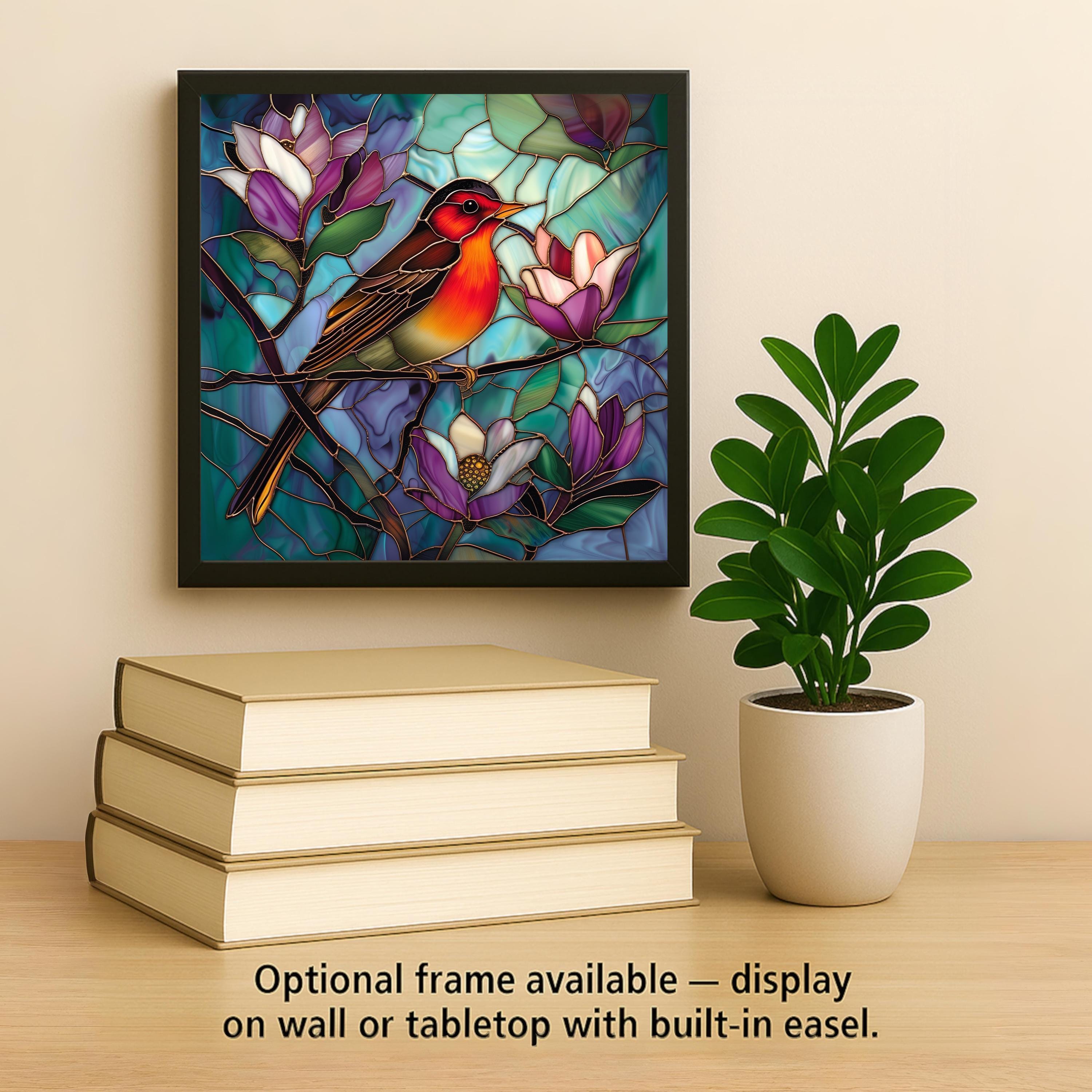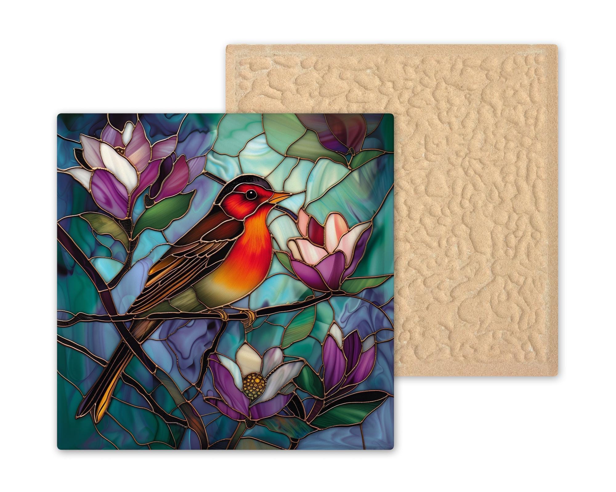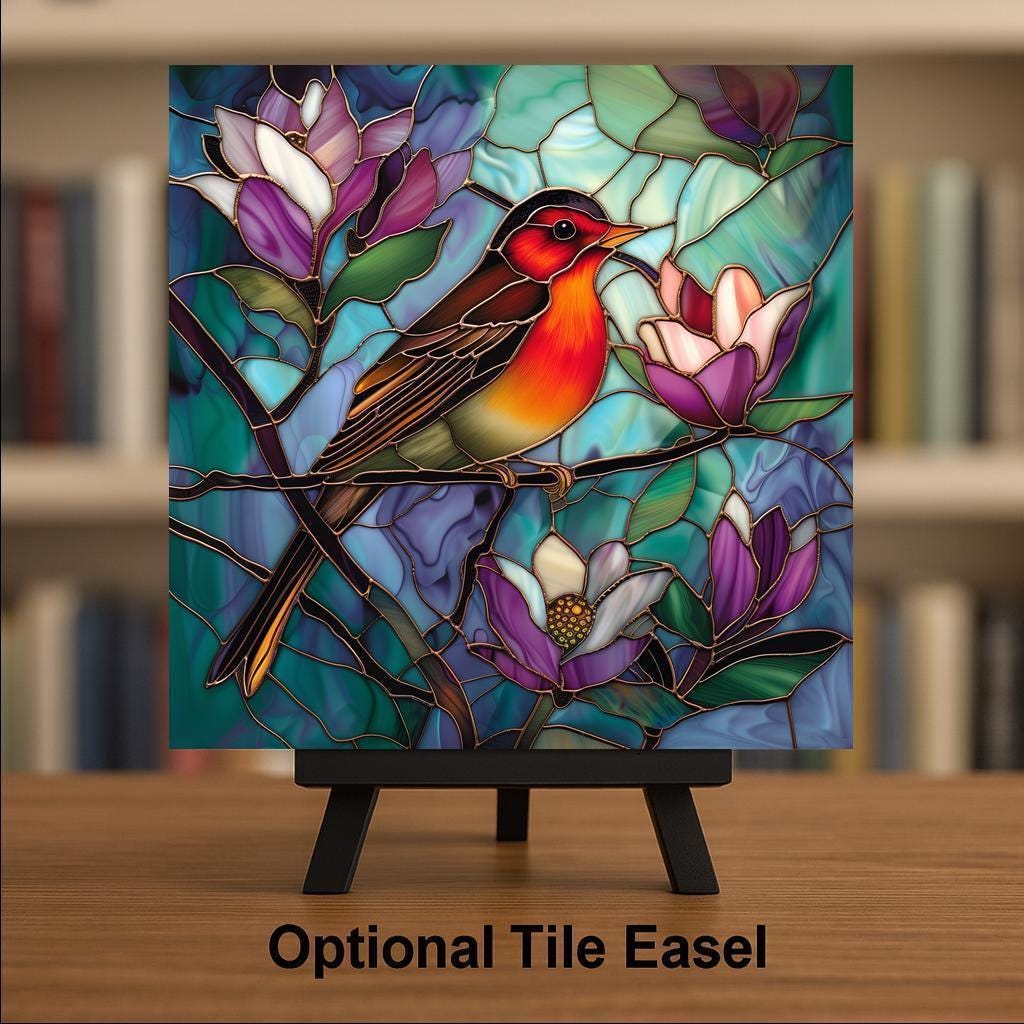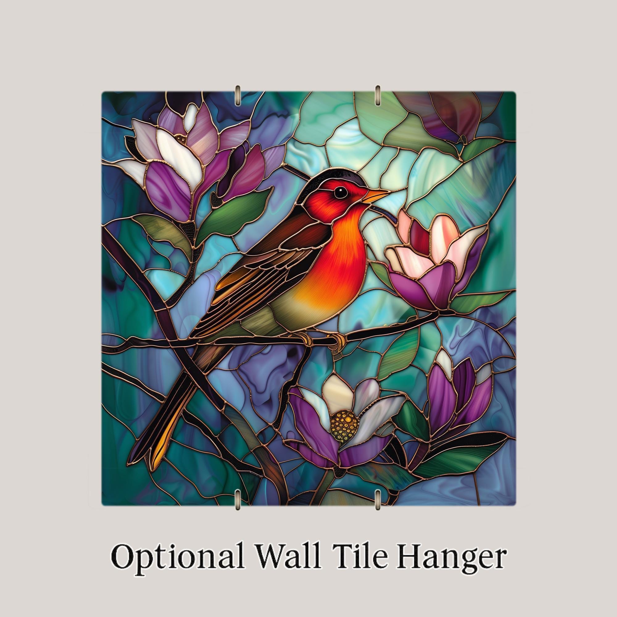 Celebrate the elegance of nature with this Magnolia Red Robin Ceramic Tile Art. Designed to mimic the glow of stained glass, this richly colored piece features a red robin nestled among magnolia blooms in vivid purples, soft whites, and deep greens. The background swirls with shades of teal and aqua, giving it a dreamlike, enchanting quality. This tile makes a perfect gift for bird watchers, flower lovers, or anyone who appreciates detailed handmade art. It works beautifully as wall decor or a functional accent tile. Add an optional tile wall hanger or stand for easy display, or request cork backing if you’d like to use it as a coaster or trivet. Don’t see the bird or flower combo you want? Reach out—we’re happy to help bring your vision to life.