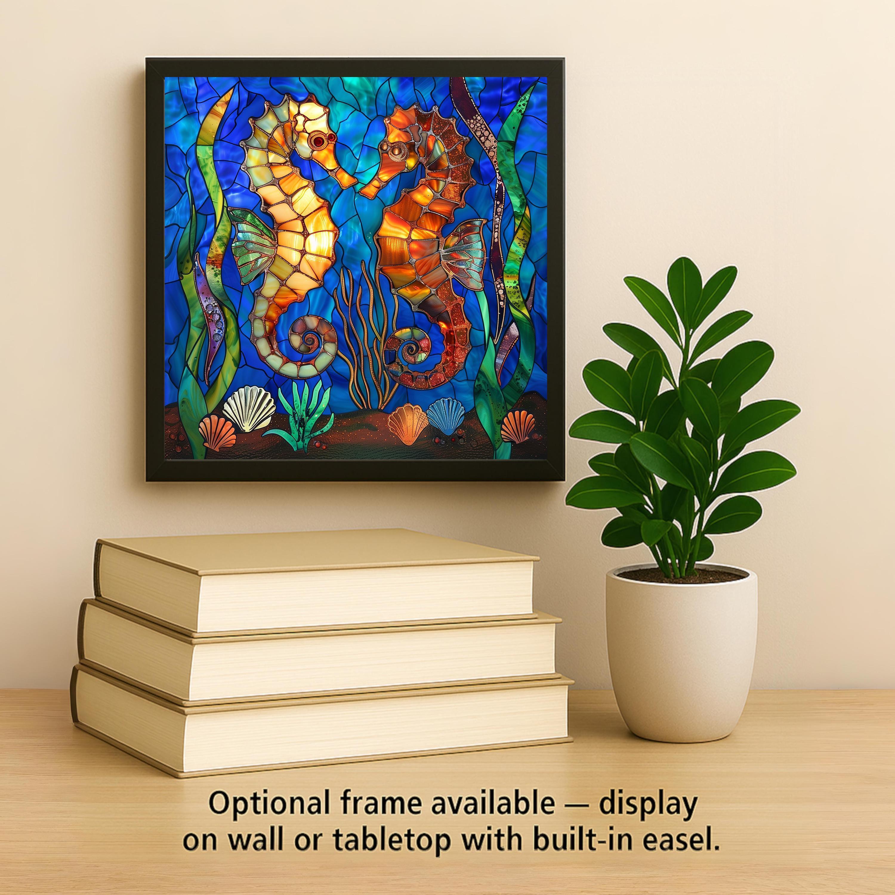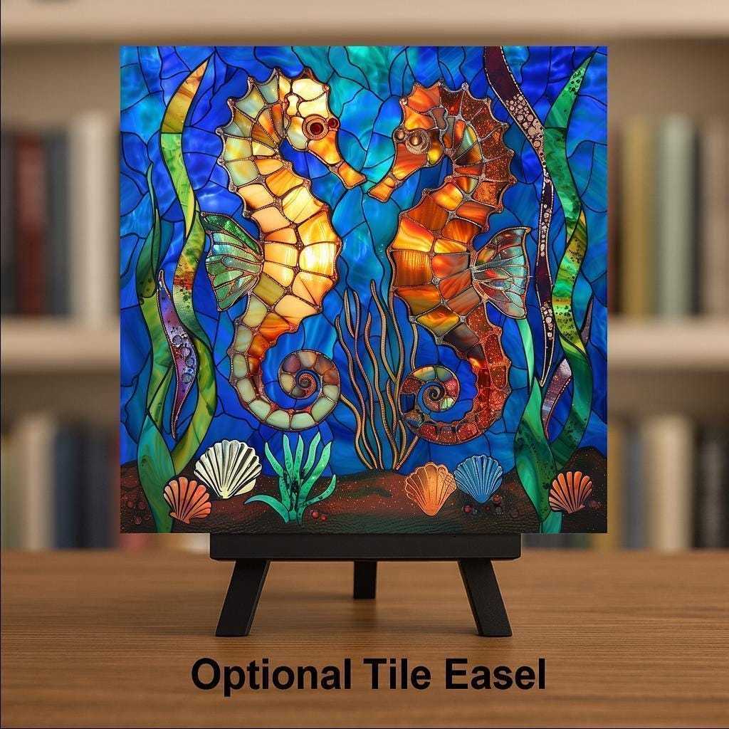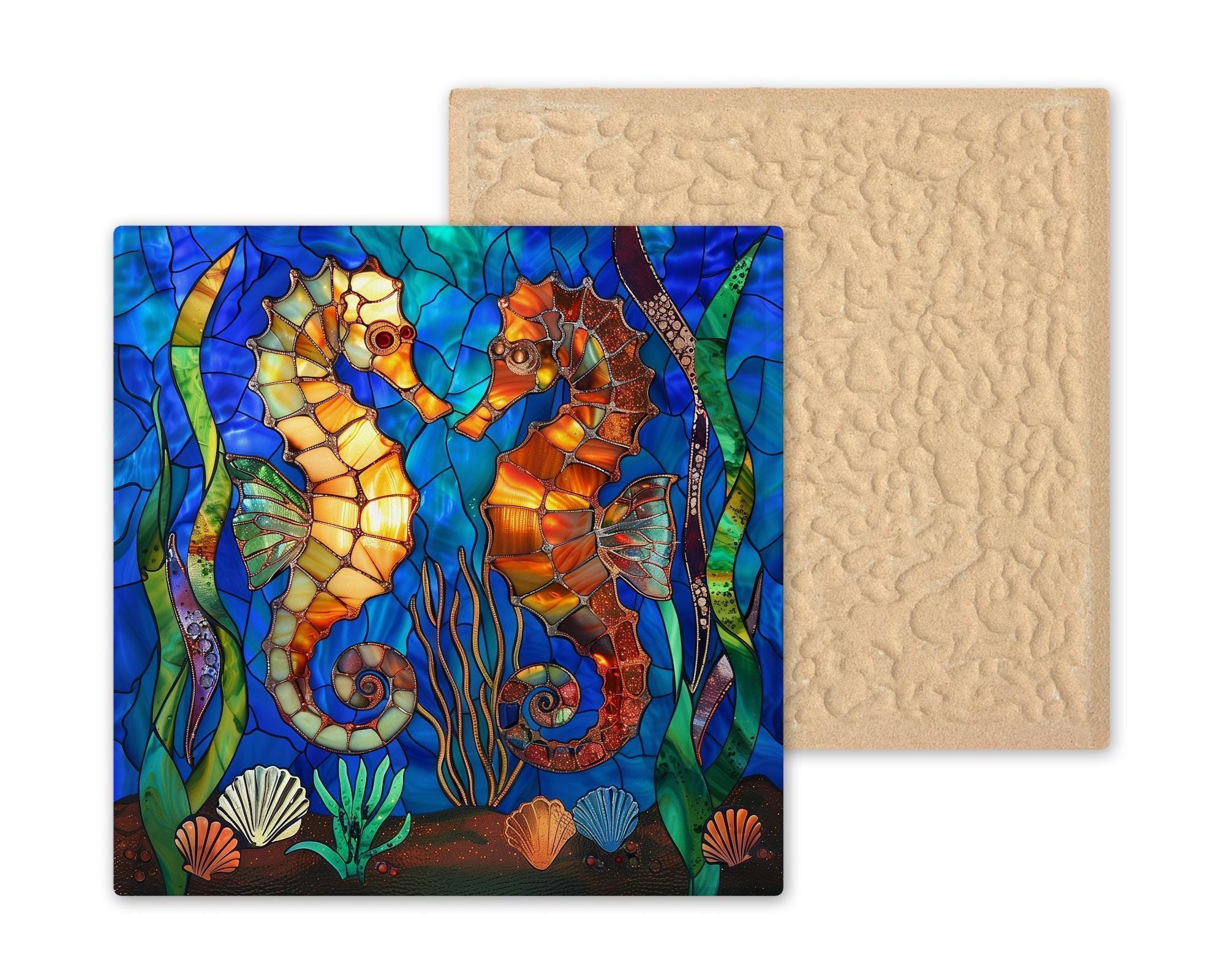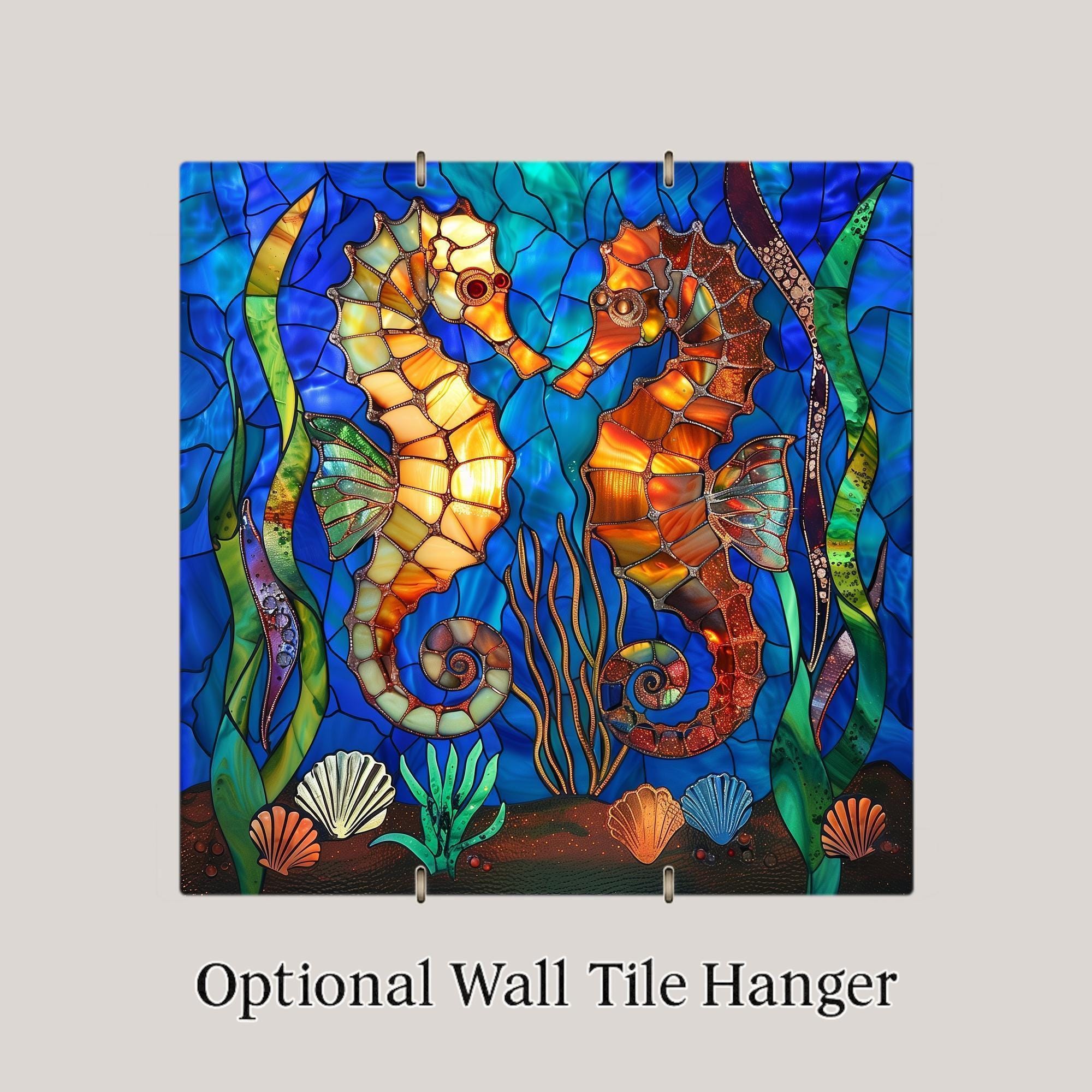Add a touch of coastal elegance to your home with this seahorse stained glass style ceramic tile wall art. Two seahorses face each other in a dance of color, framed by sea plants and seashells against a deep blue ocean backdrop. The golden and orange hues shine brilliantly against the aquatic tones, evoking the beauty of sunlight filtering through the sea.