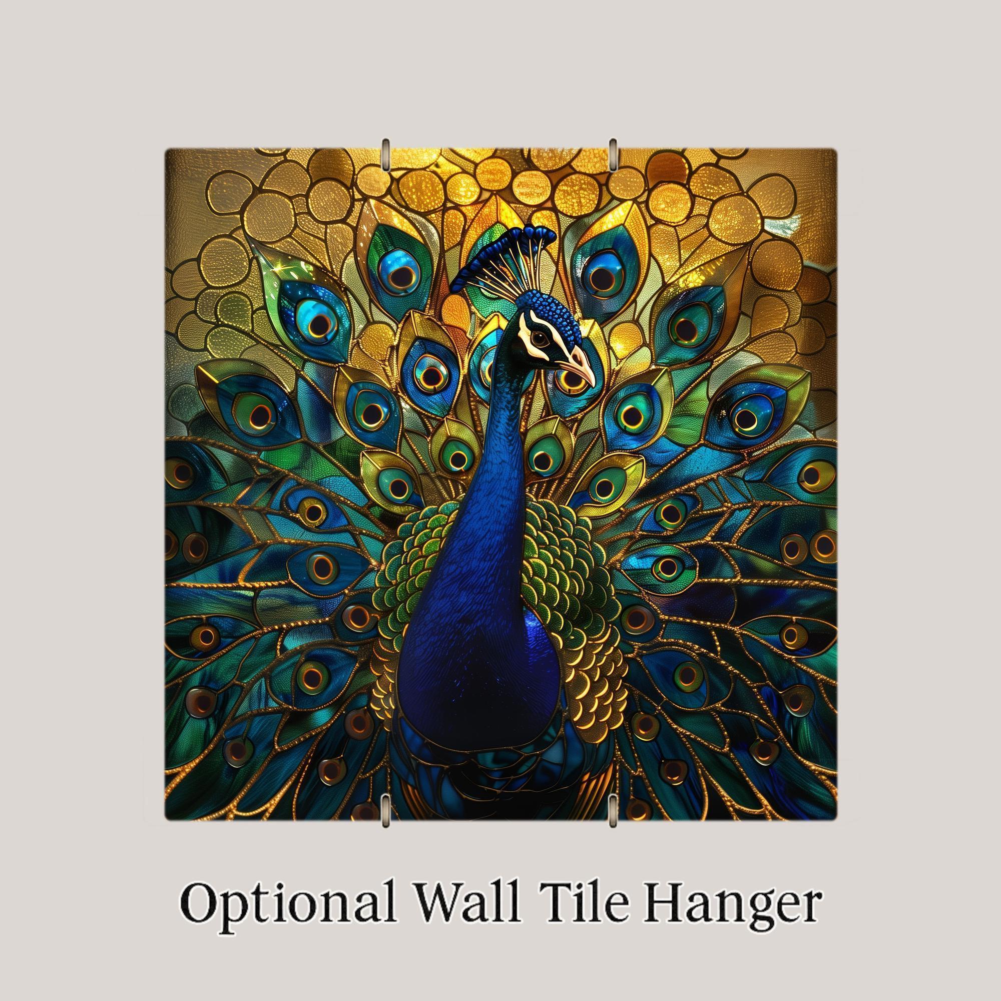Celebrate the majesty of the peacock with this stained glass style ceramic tile wall art, an artwork full of glowing color and detail. Featuring a regal peacock with feathers fanning out in shimmering blues, greens, and golds, this design radiates sophistication and artistry. The luminous patterns bring a bold statement piece to your décor, perfect for both modern and classic interiors.