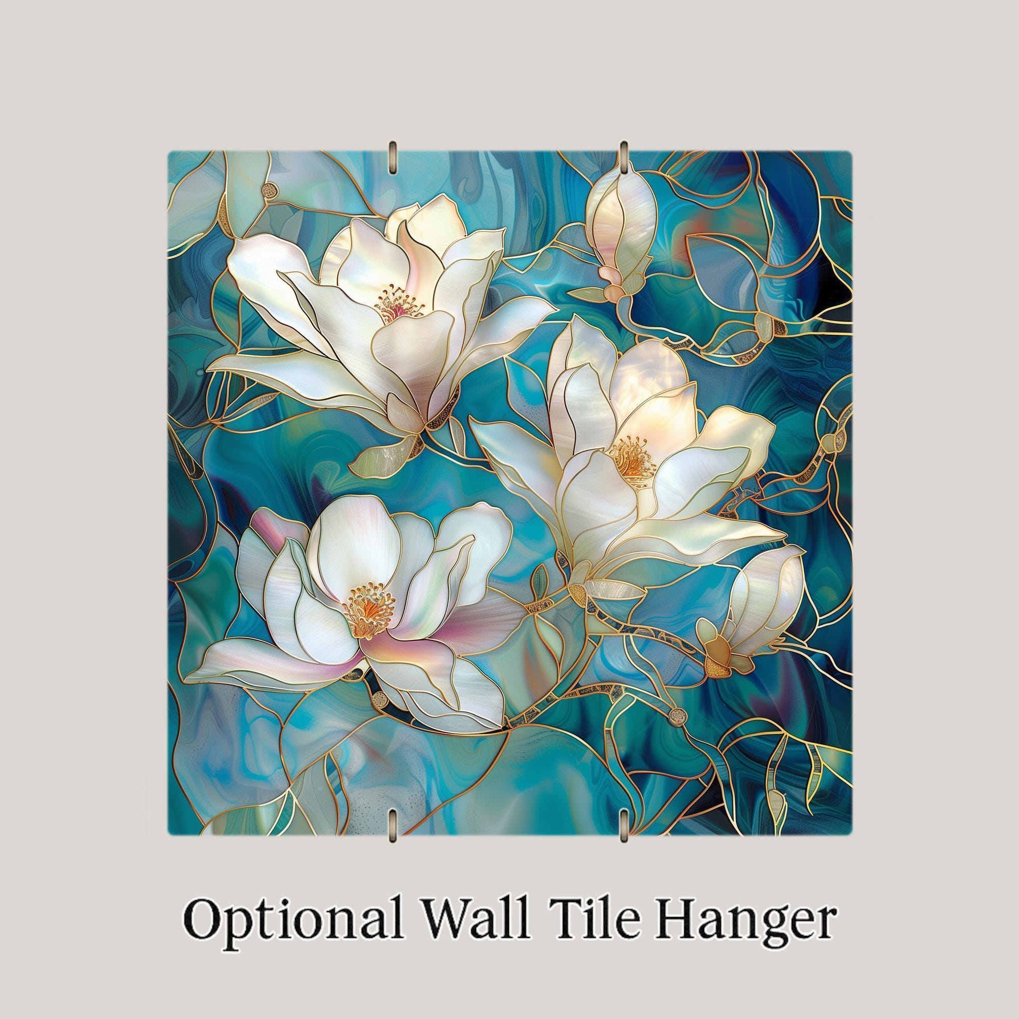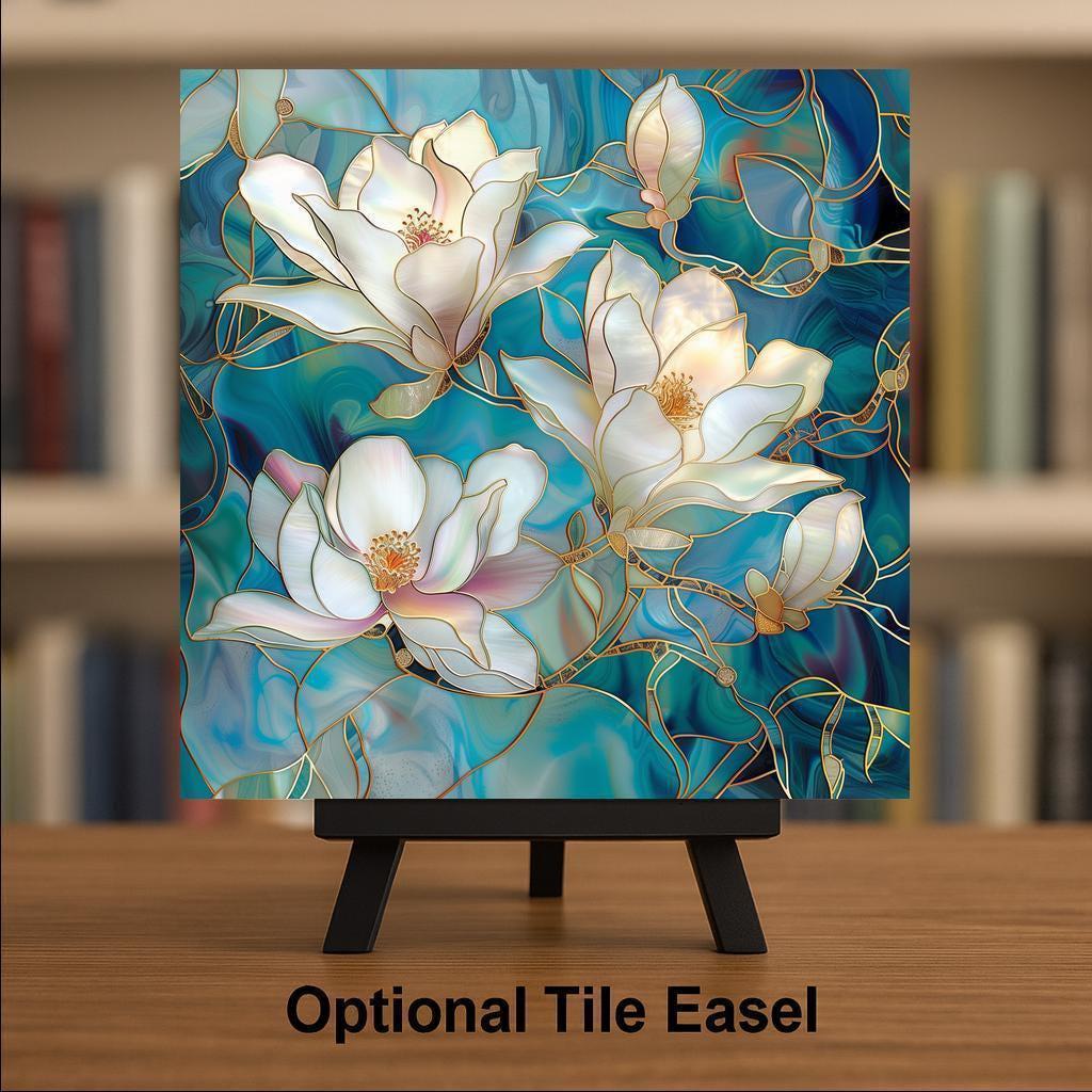 Celebrate the natural grace of magnolia blossoms with this Art Nouveau-inspired Stained Glass Ceramic Tile Art. Featuring soft white and blush petals outlined in glowing gold against a swirling teal background, this tile radiates elegance and charm. The detailed floral composition makes it a versatile art piece for wall displays, mantels, or tabletops, while the luminous jewel-toned colors add richness and depth to any room.