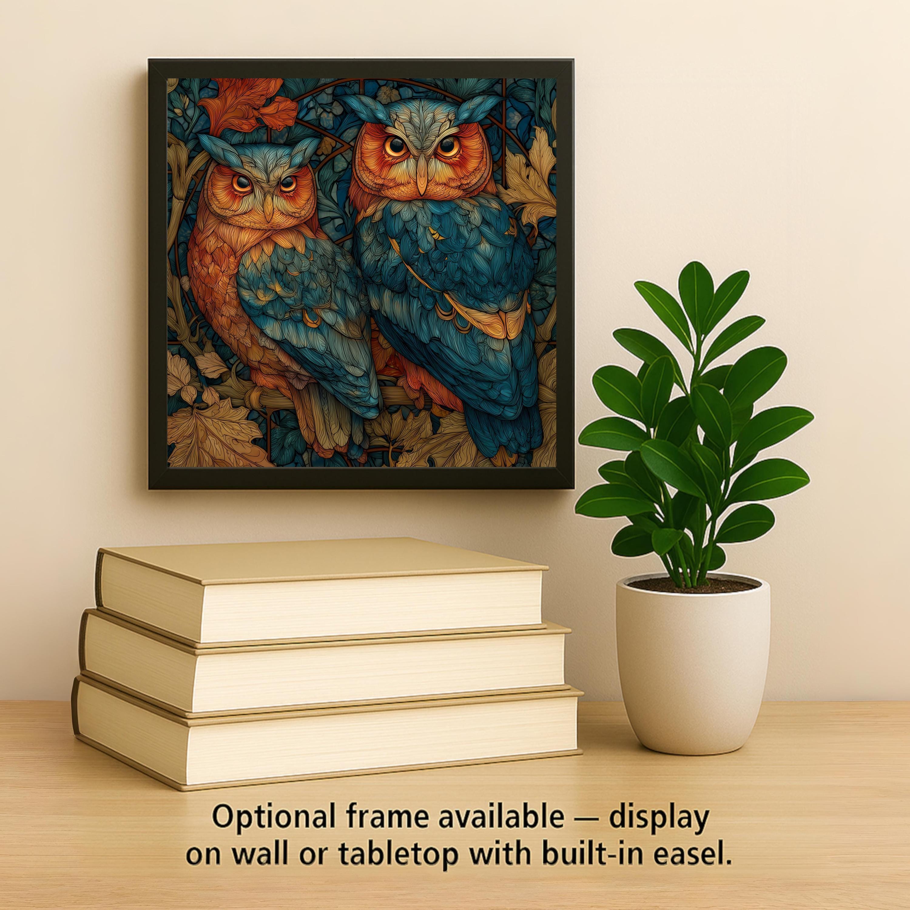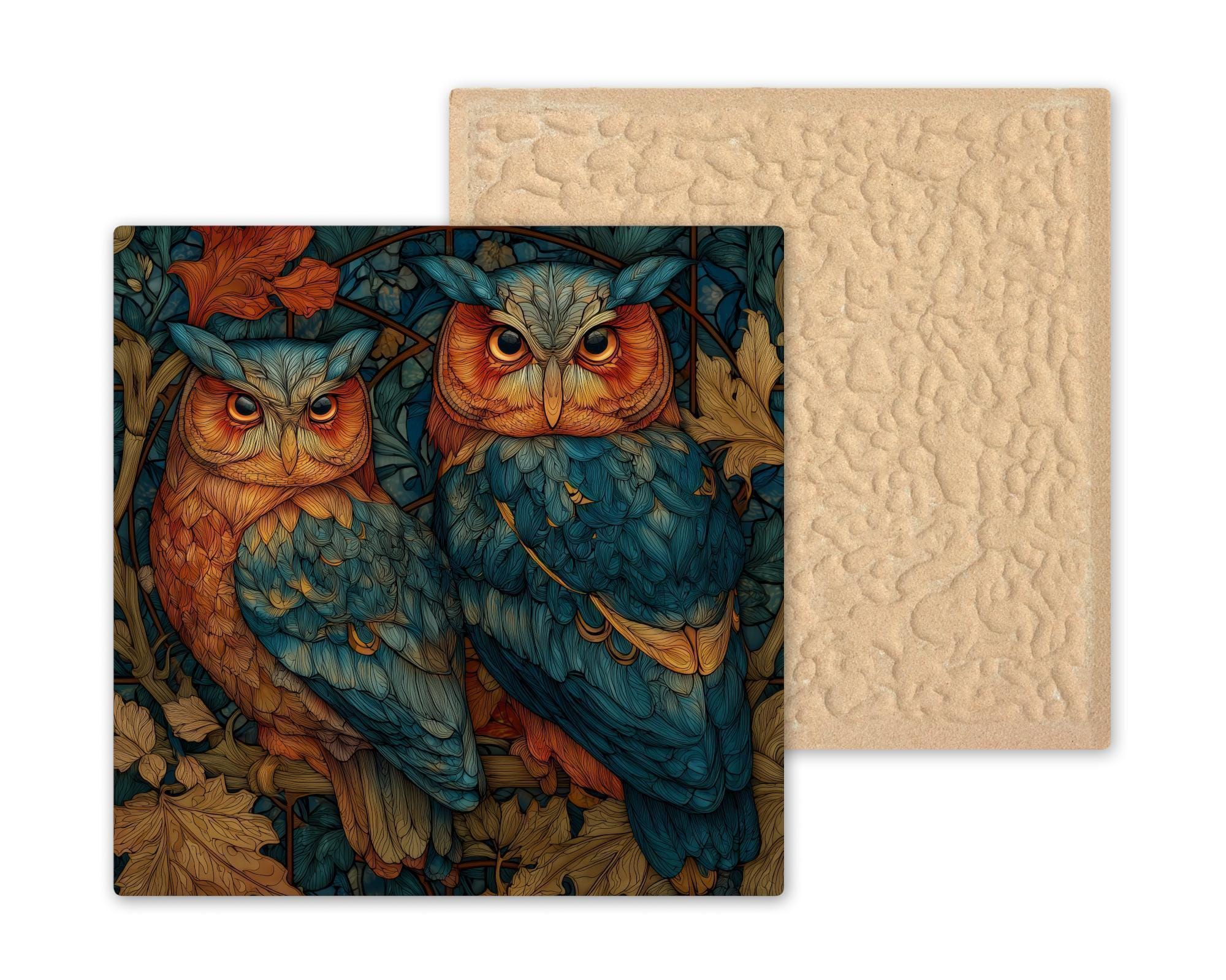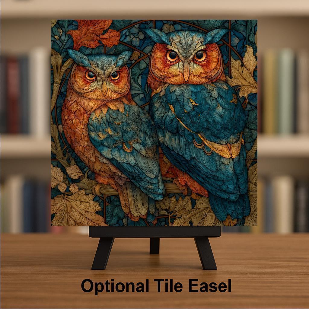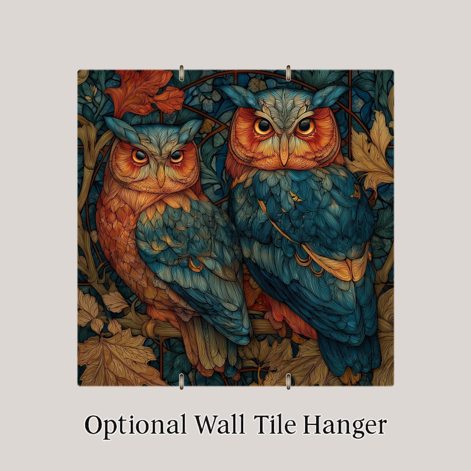 Add woodland elegance to your home with this stained glass owl ceramic tile wall art, featuring two majestic owls surrounded by autumn leaves. The glowing teal and orange tones create a luminous effect, blending rustic forest charm with the artistry of stained glass.