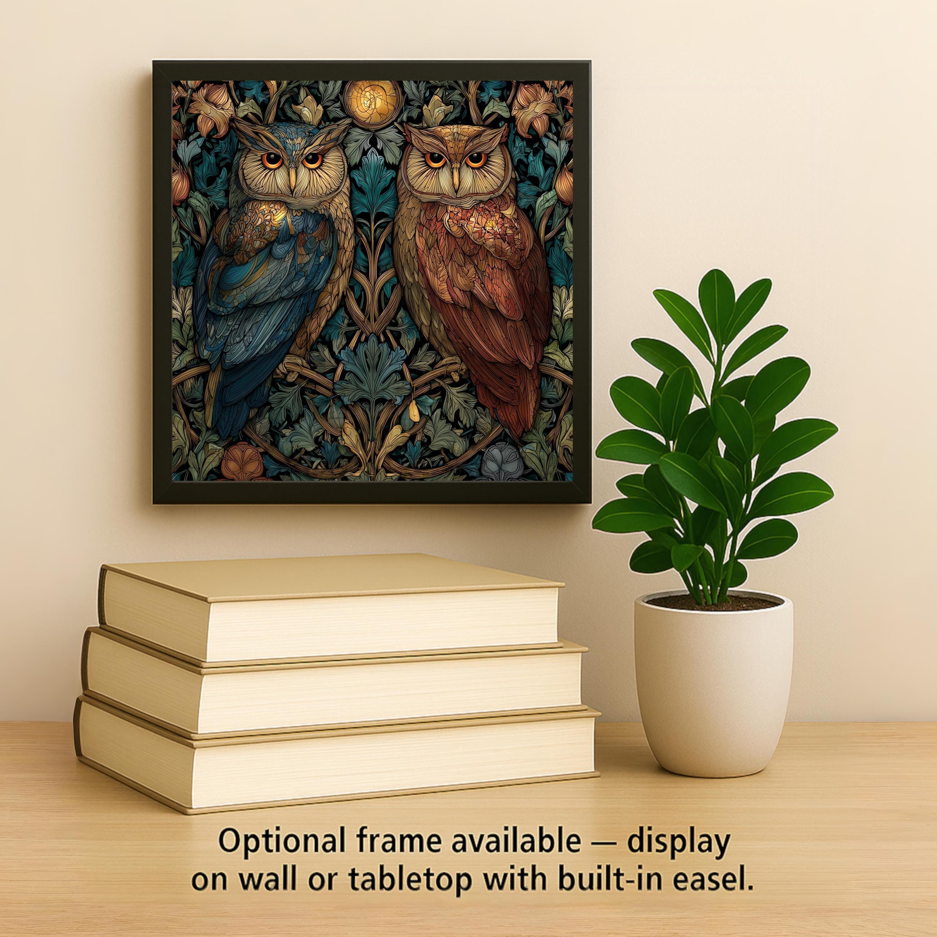 Enhance your space with this stained glass owl ceramic tile wall art, a design that blends rustic woodland charm with the brilliance of stained glass artistry. Two owls rest among intricately detailed leaves under the warm glow of the moon, rendered in shades of teal, amber, and copper. The result is a design that captures both mystery and elegance.