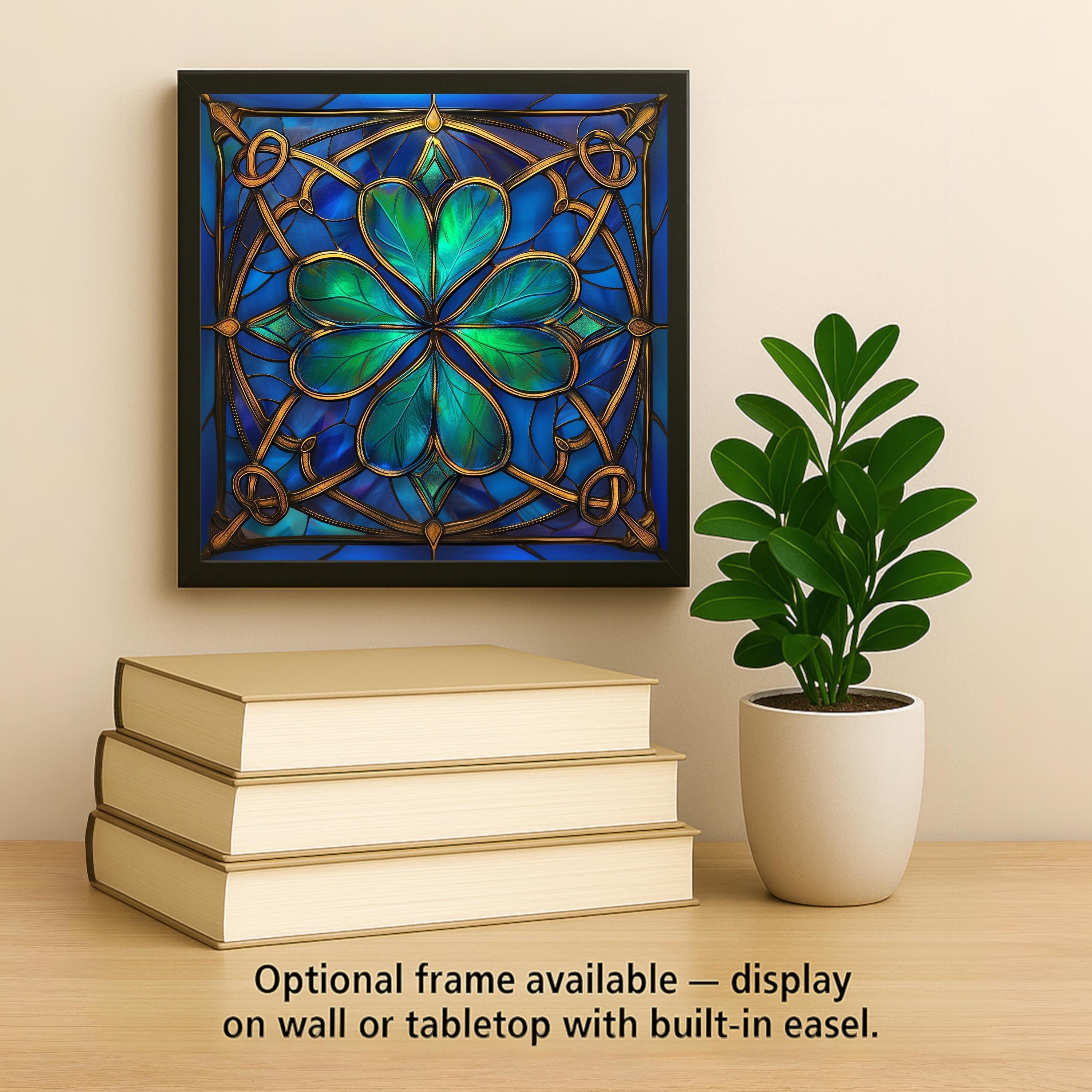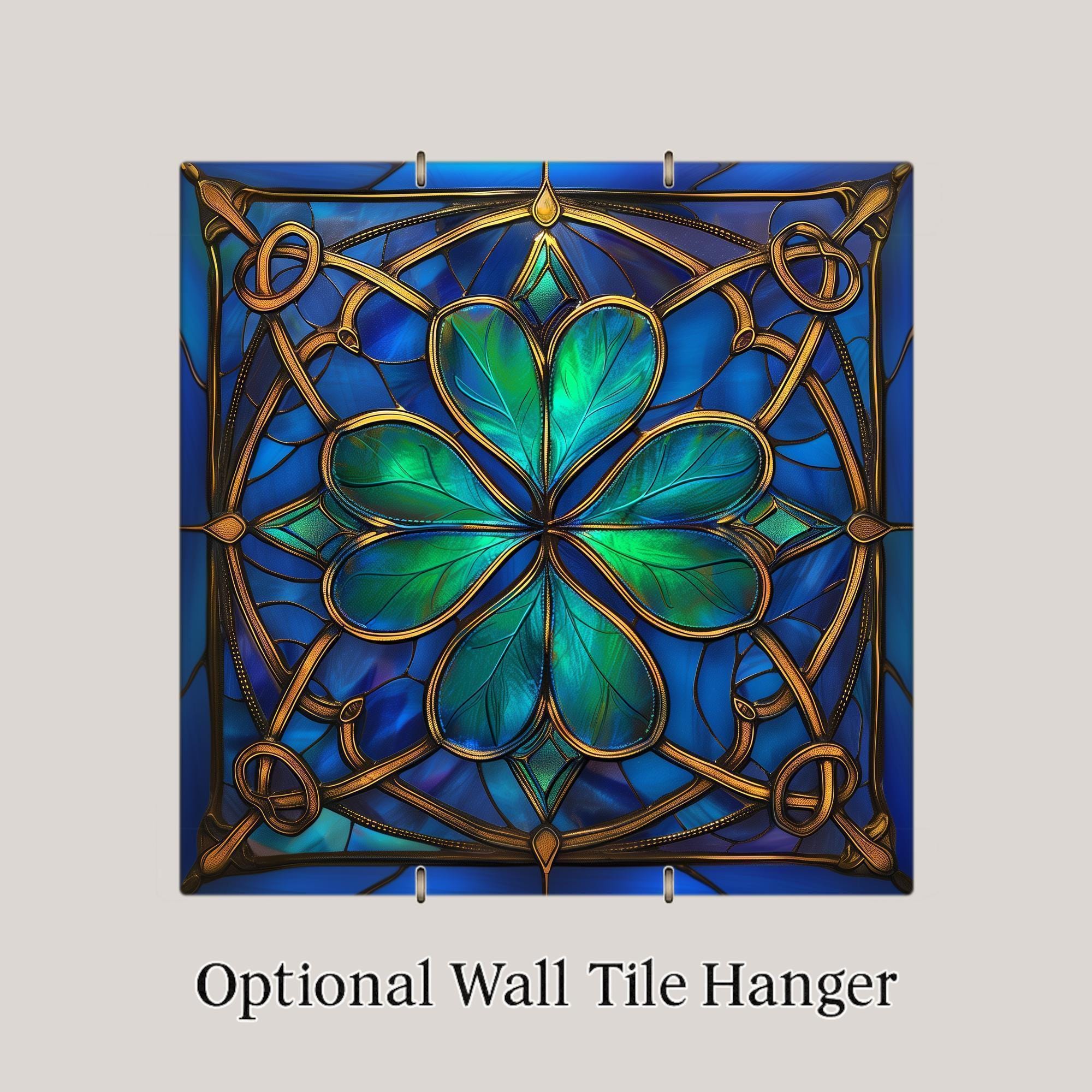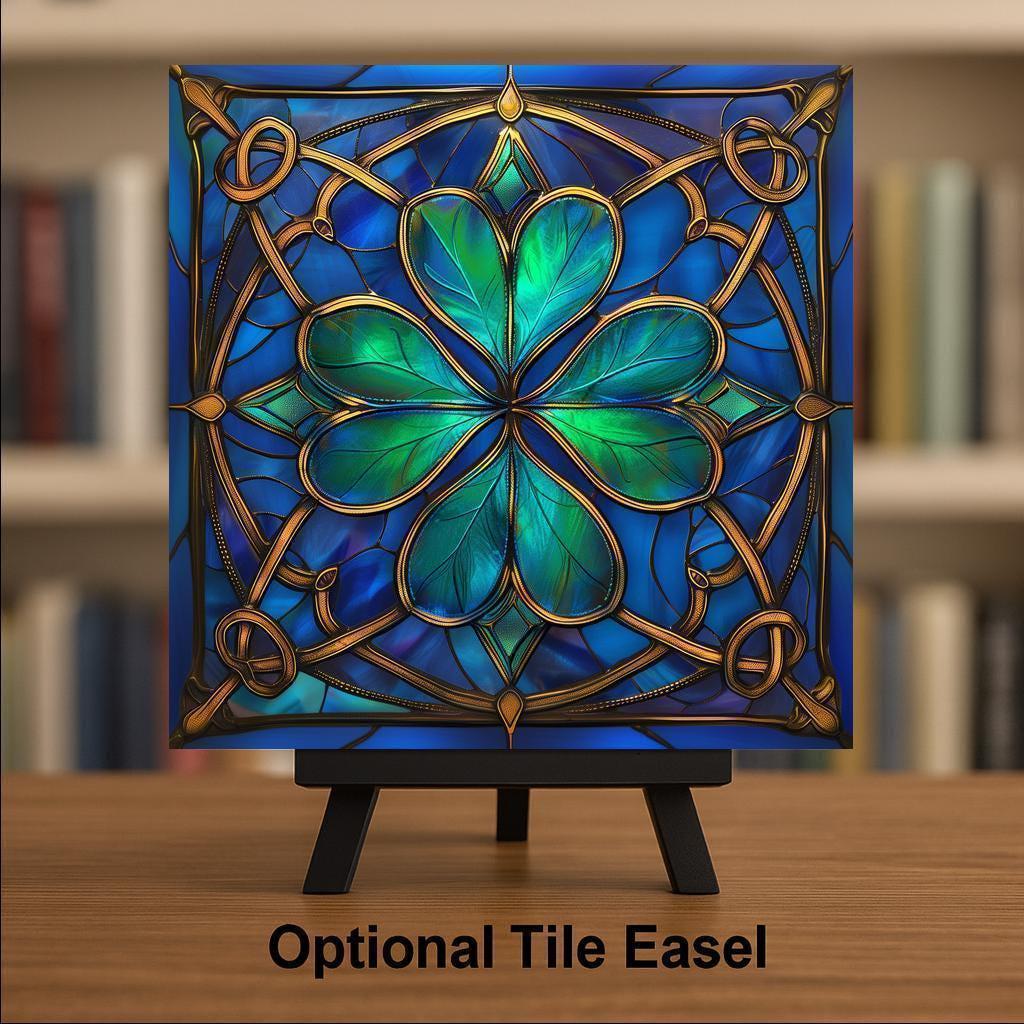 Produced with a premium fine-art process, the colors remain vivid and the golden outlines radiant for years to come. This shamrock tile is both elegant and versatile—display it on a wall, shelf, or tabletop. Optional add-ons include a tile wall hanger, easel tile stand, or cork backing for convenient display or functional use.