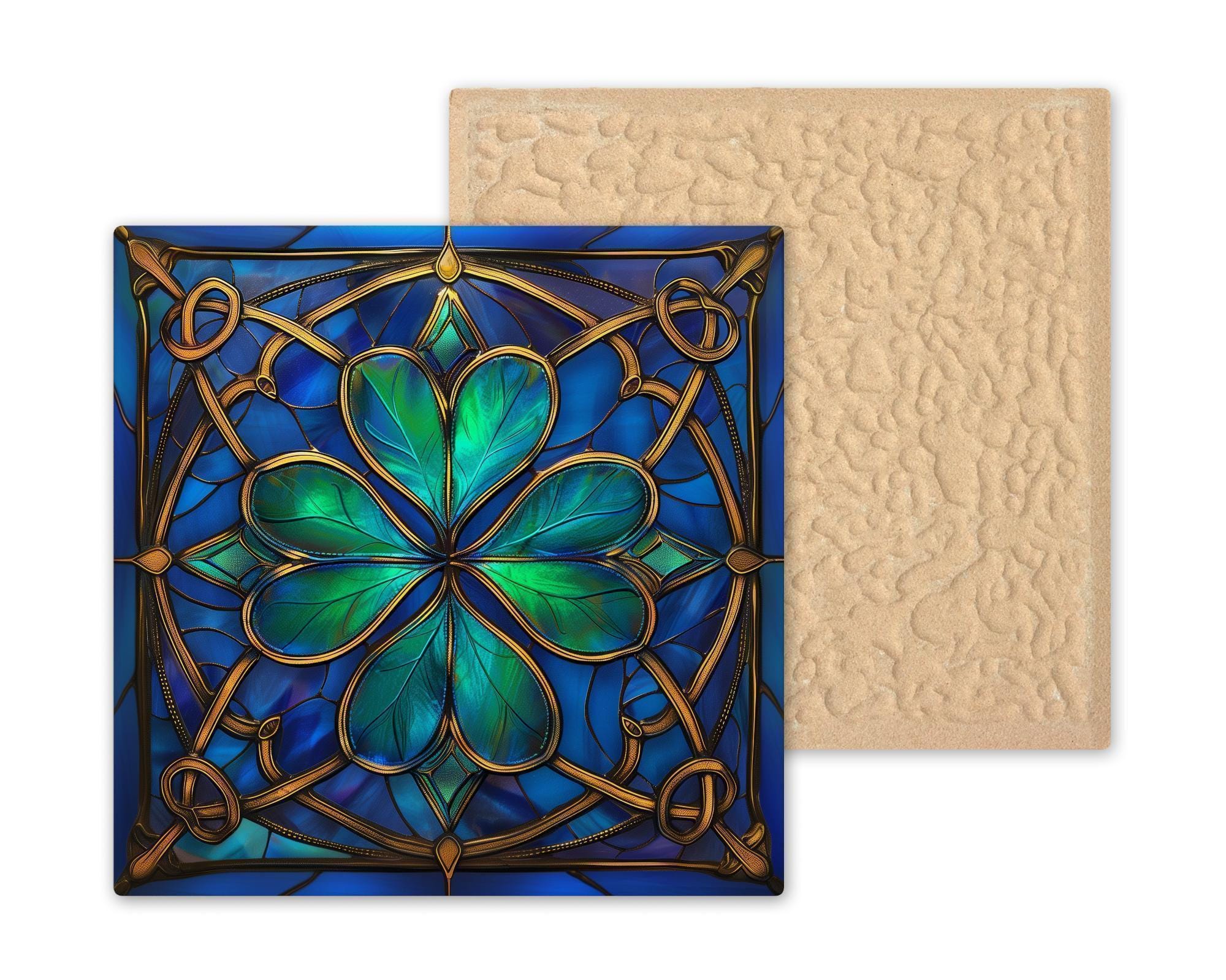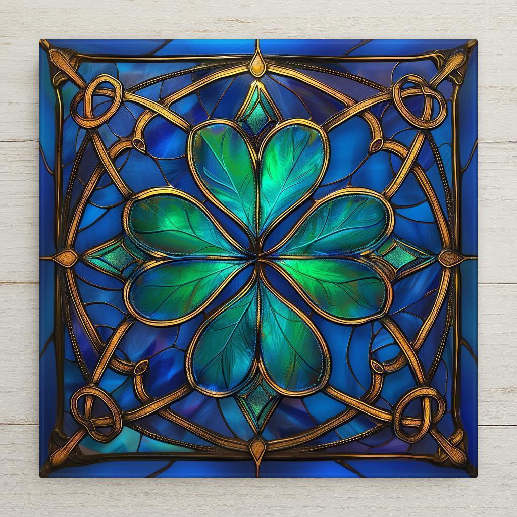 Bring the spirit of Celtic tradition into your home with this Four Leaf Shamrock Stained Glass Ceramic Tile. Featuring emerald-green and teal leaves outlined in radiant 24k gold, this design glows with depth and elegance. A perfectly symmetrical Celtic knotwork border surrounds the shamrock, highlighting its meaning as a symbol of faith, luck, and prosperity. Jewel-toned blues and turquoise in the background create a Tiffany-style stained-glass effect, glowing as though lit from within.