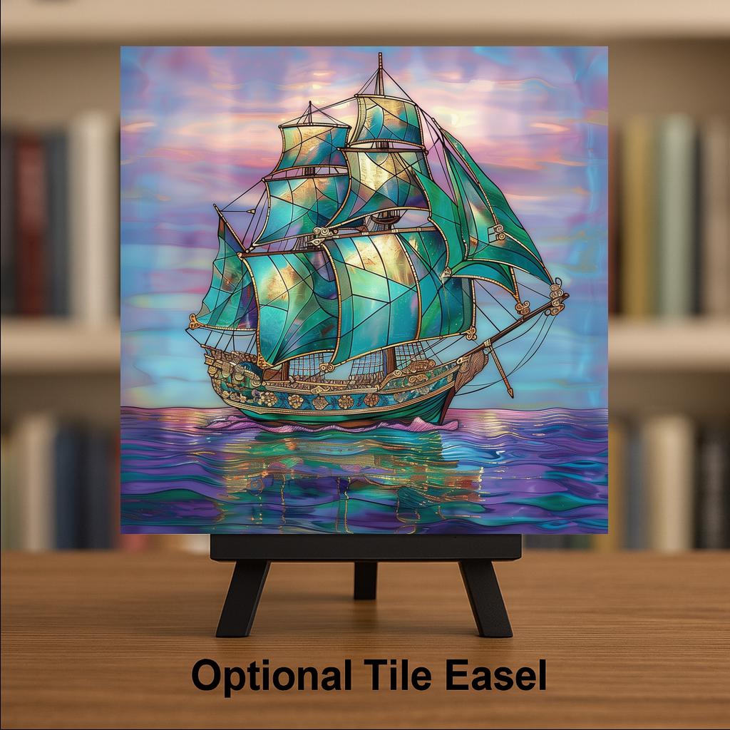 Sail into timeless beauty with this stained glass style teal sailing ship ceramic tile wall art, a luminous piece that blends nautical charm with artisan detail. The design features a grand ship with emerald green sails set against a glowing sky of lavender, gold, and soft sunset hues. The stained glass style gives the artwork a radiant, illuminated quality that captures the eye.