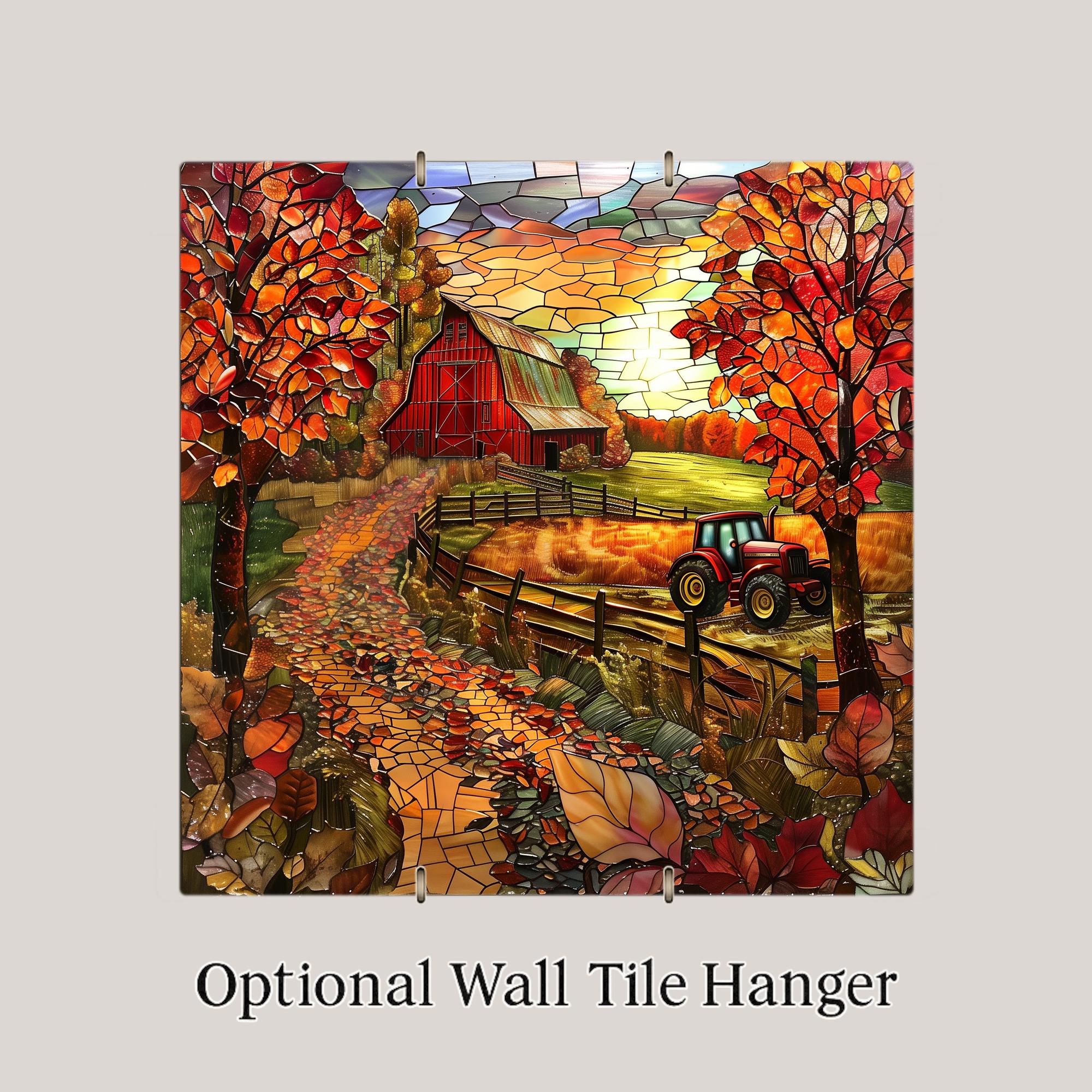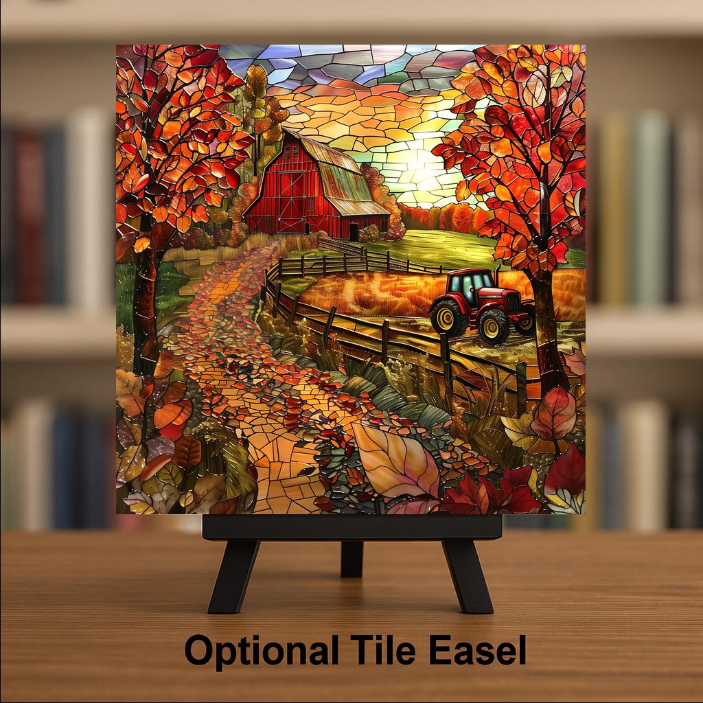 Capture the timeless beauty of fall with this stained glass–style ceramic tile featuring a red barn, tractor, and golden fields. A winding path of colorful autumn leaves leads to the rustic barn, framed by radiant trees and a glowing sunset sky. This tile is not real stained glass or mosaic. Instead, it is a permanent print on ceramic tile, designed to highlight the luminous beauty of stained glass with the durability of a printed artwork.