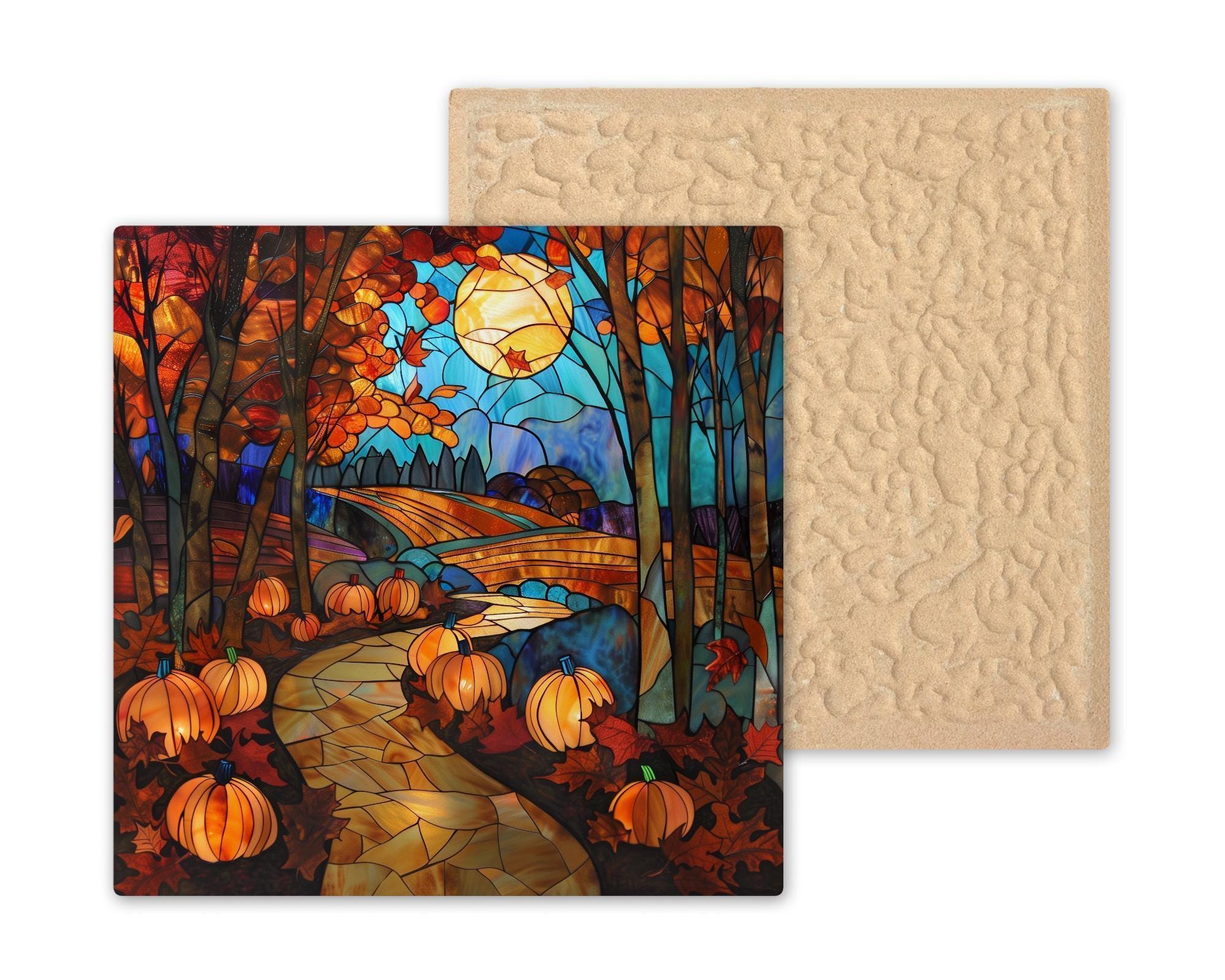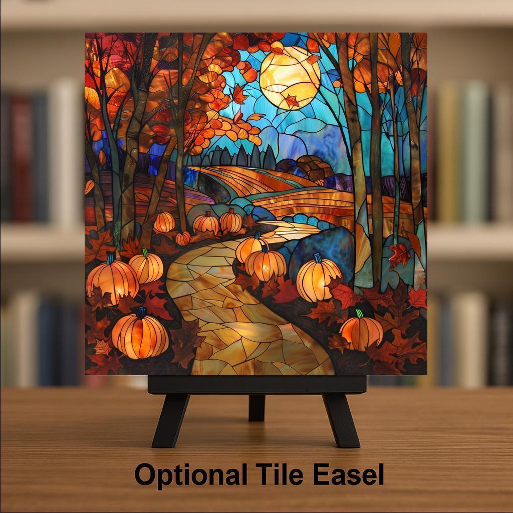 Celebrate the harvest season with this stained glass–style ceramic tile featuring pumpkins glowing along a golden path beneath the harvest moon. Rich autumn colors—burnt orange, golden yellow, rustic red, and turquoise blue—create a radiant stained glass look that instantly captures attention. While it may look like stained glass or mosaic, this is not. The design is a permanent print on ceramic tile, made to deliver the glow and beauty of stained glass with the strength and durability of tile.