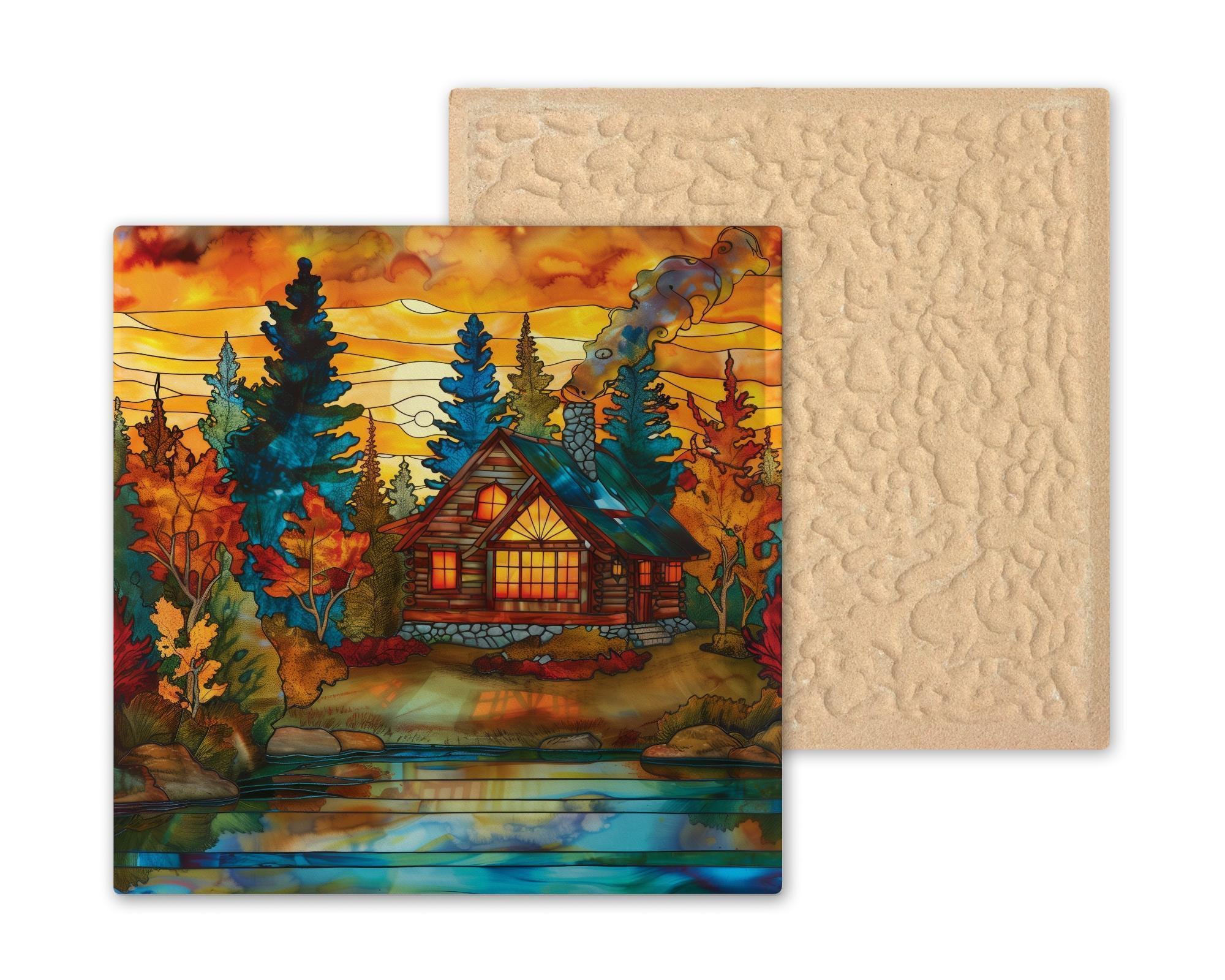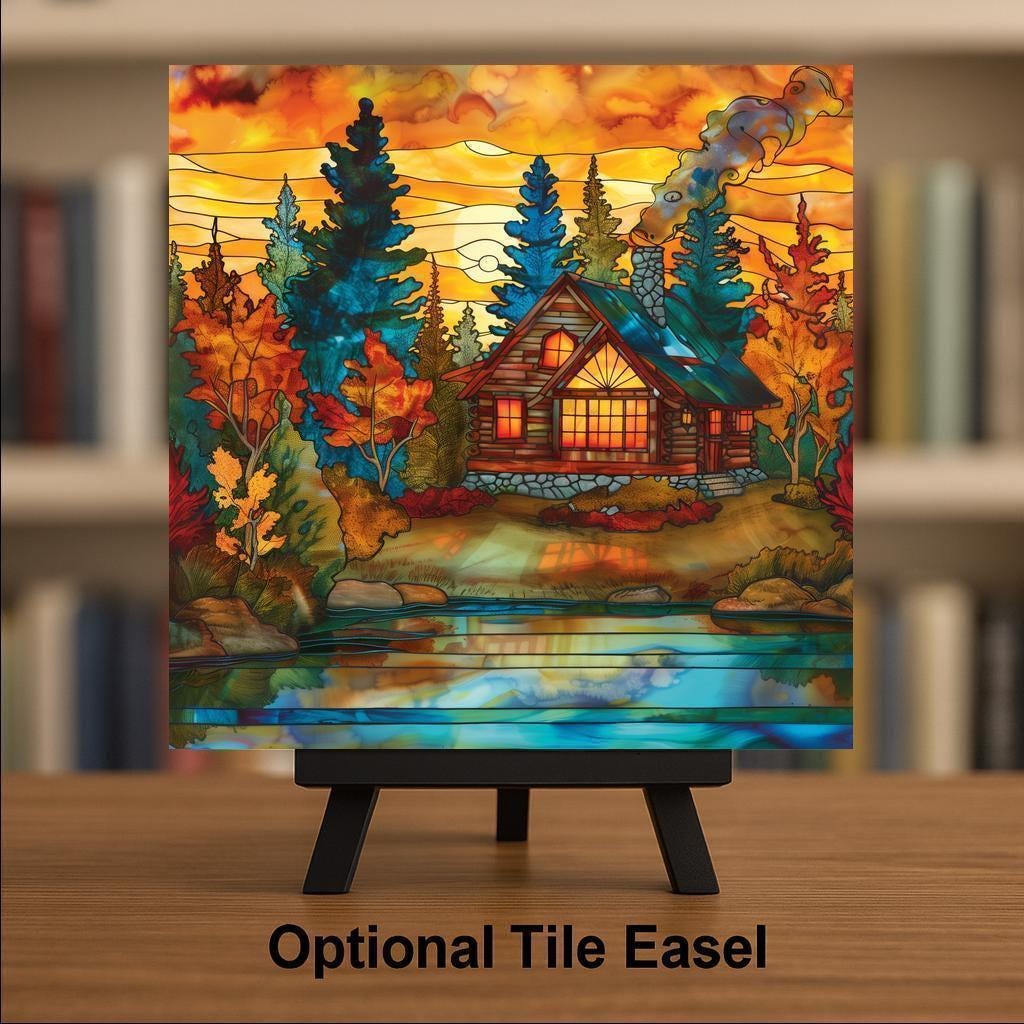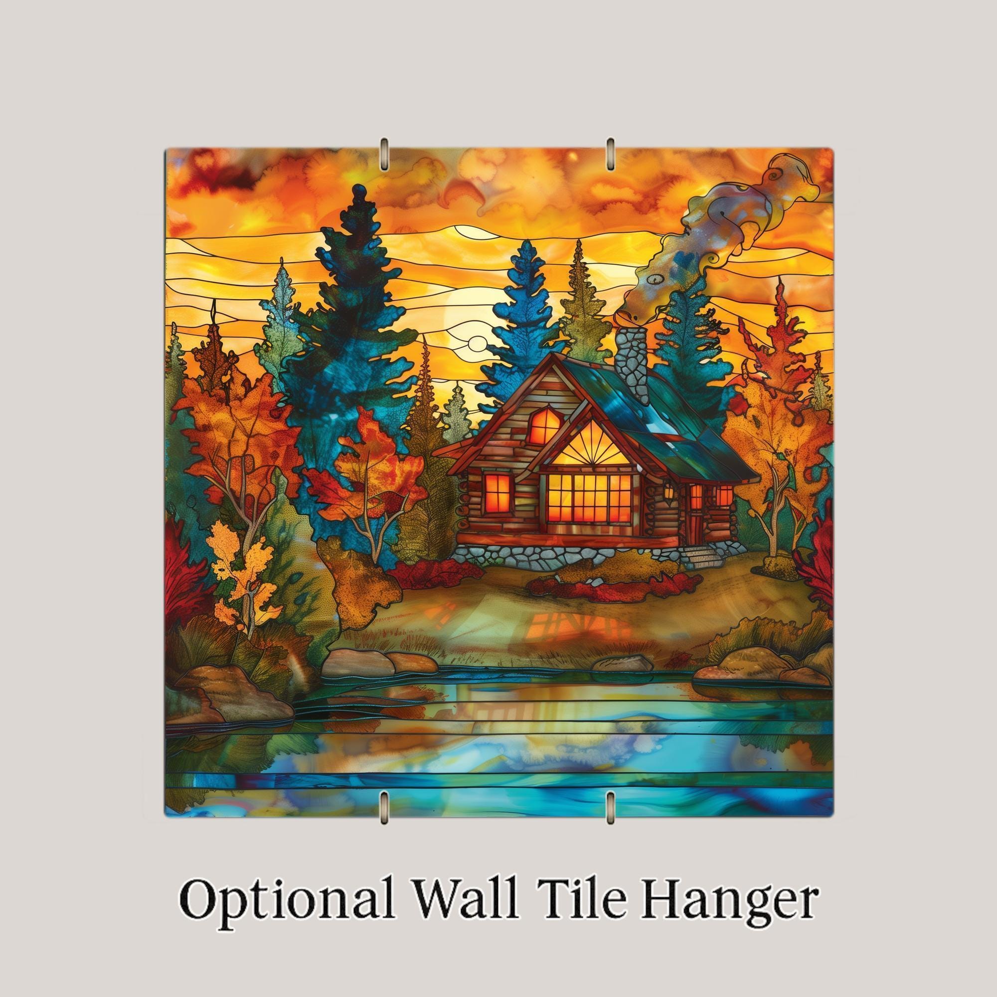 This autumn cabin ceramic tile was designed for the buyer whose idea of the perfect space is a cabin in the woods in October — leaves turning, fire going, the rest of the world at a comfortable distance. The Place Identity signal in this tile is strong: the right buyer sees it and thinks immediately of a specific cabin they know or a specific feeling they chase every autumn.