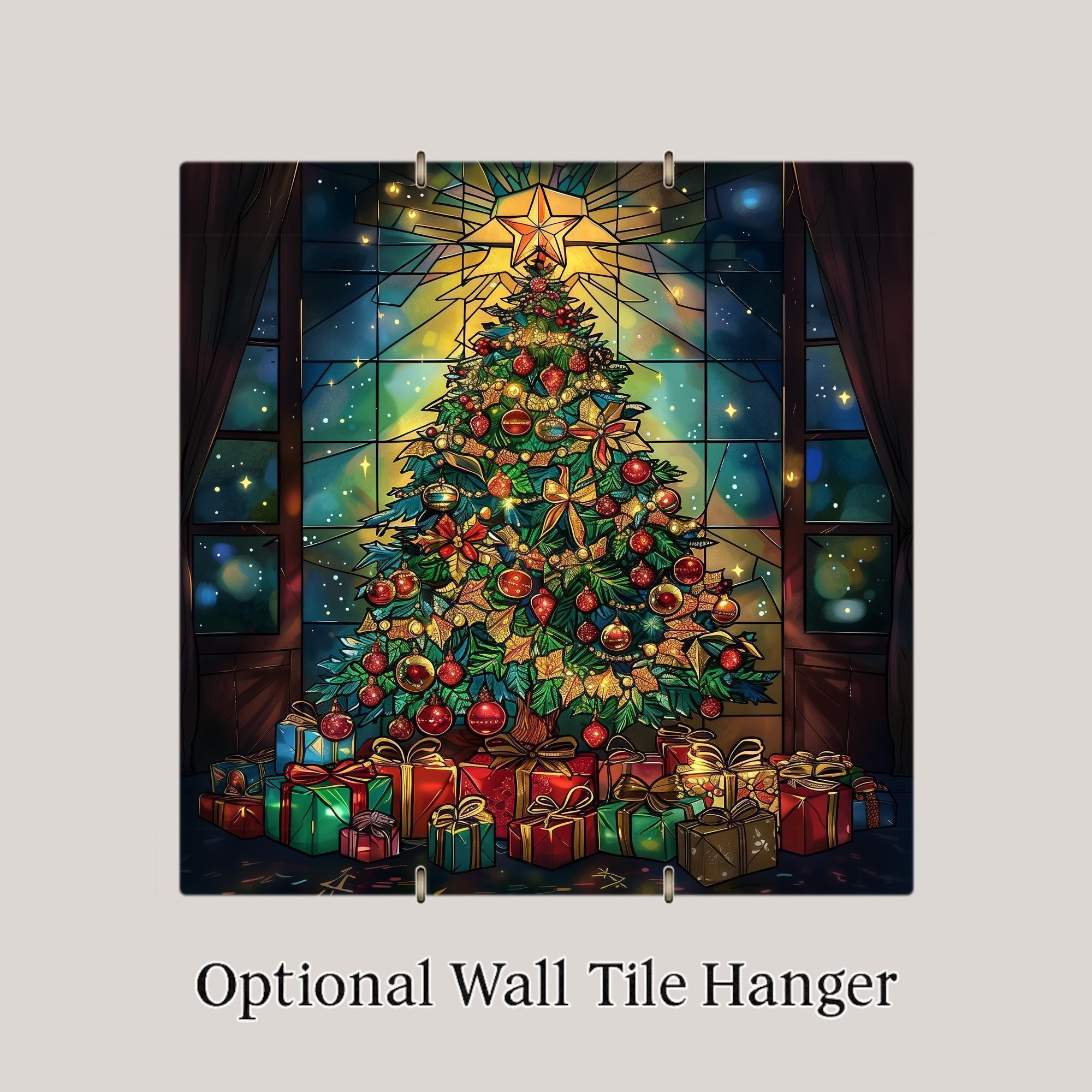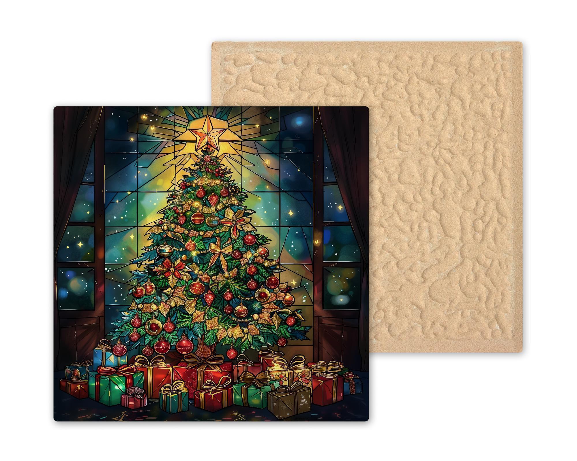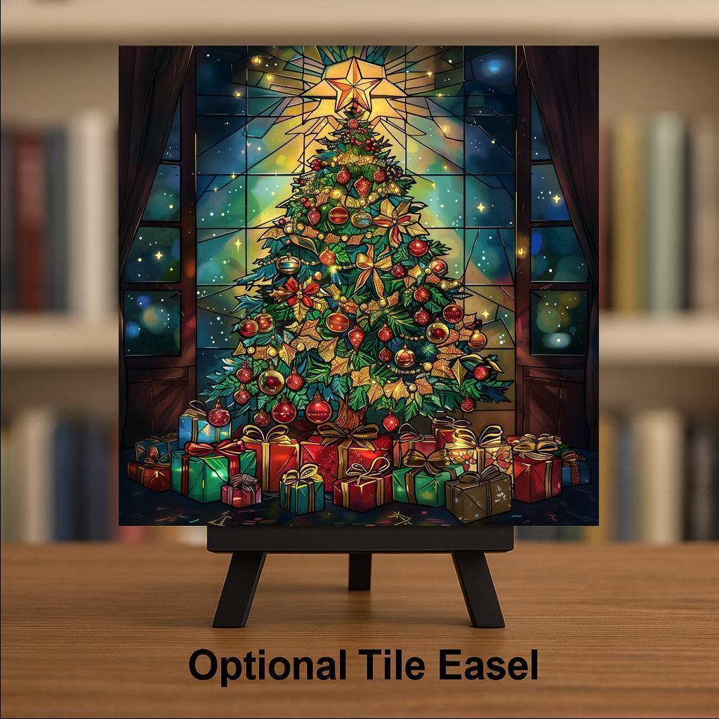 Bring the joy of Christmas into your home with this stained glass–style ceramic tile featuring a radiant tree, colorful ornaments, and a shining star above a pile of beautifully wrapped gifts. Warm jewel tones of emerald green, ruby red, and shimmering gold make the design come alive. Though the tile looks like stained glass or mosaic, please note it is not. This is a permanent print on ceramic tile, crafted to last with the glowing artistry of stained glass.