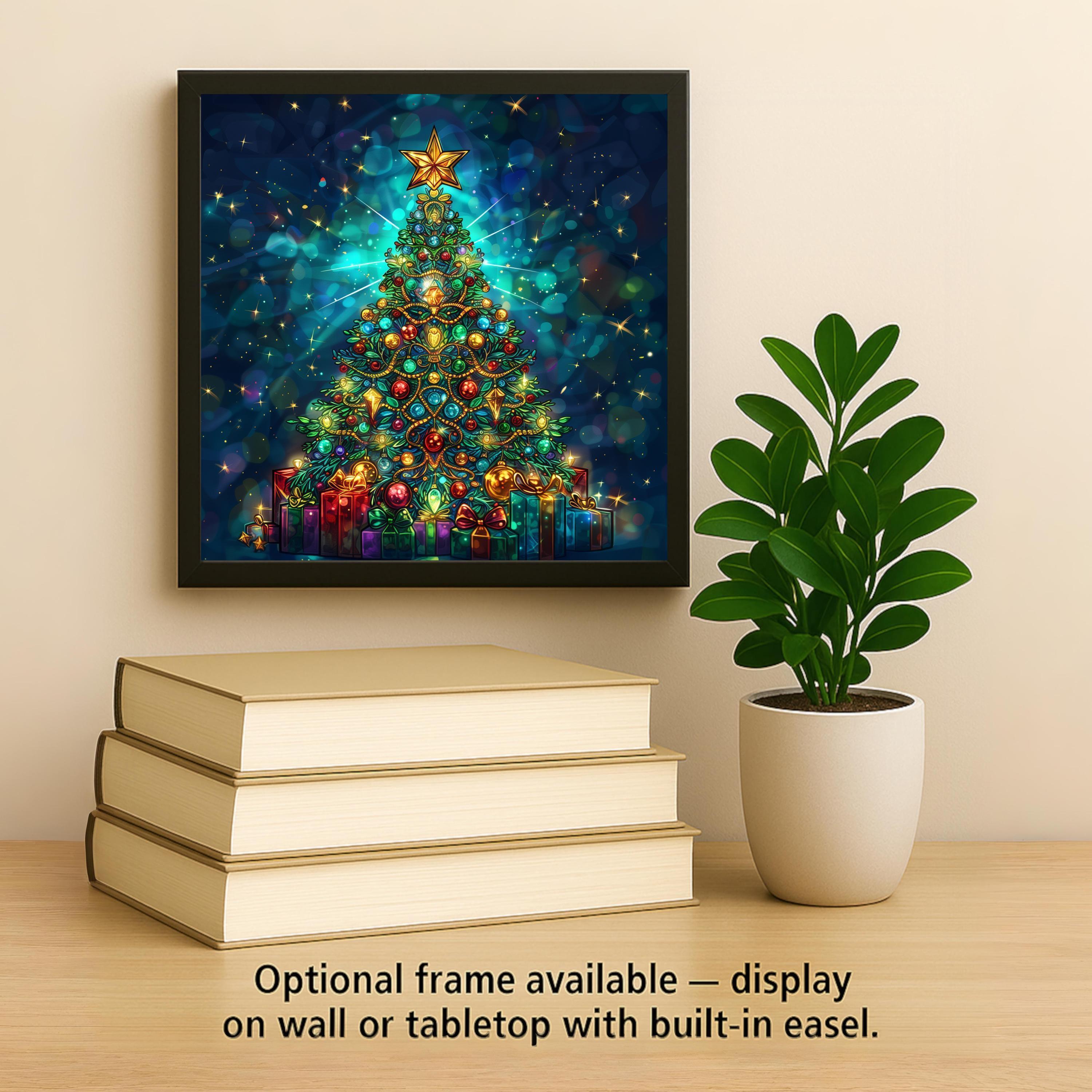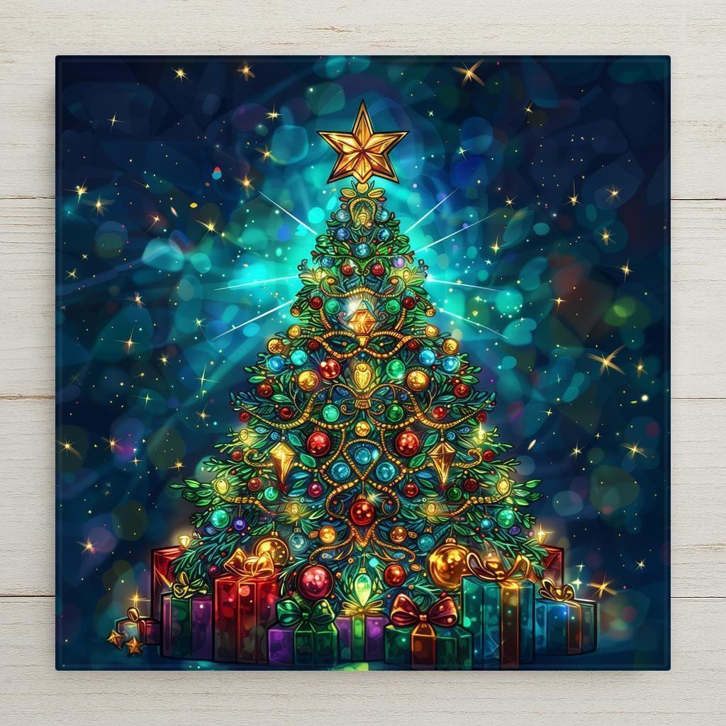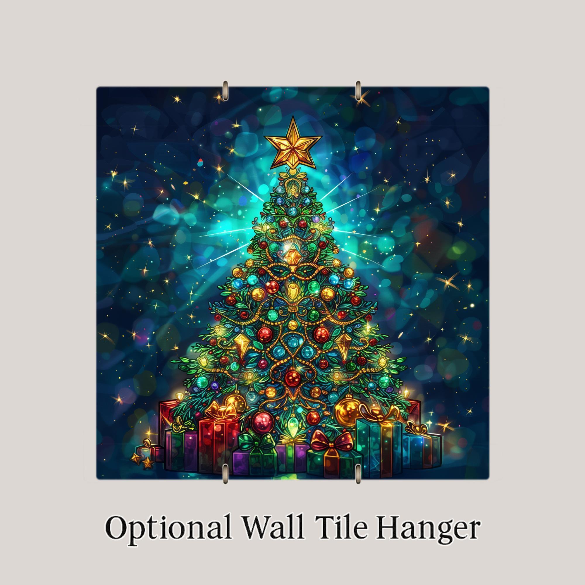 Celebrate the holiday season with this stained glass–style ceramic tile featuring a glowing Christmas tree adorned with ornaments, garlands, and a radiant star above a pile of wrapped gifts. Brilliant jewel tones of red, green, blue, and gold create a luminous design that feels festive and timeless. Though the tile looks like stained glass or mosaic, it is not. This is a permanent print on ceramic tile, crafted to give you the beauty of stained glass in a durable, lasting form.
